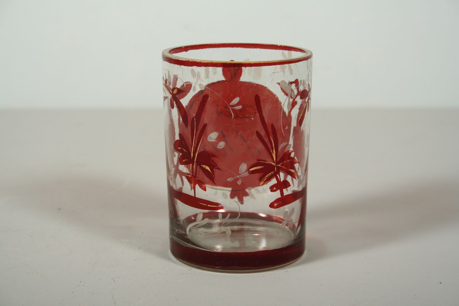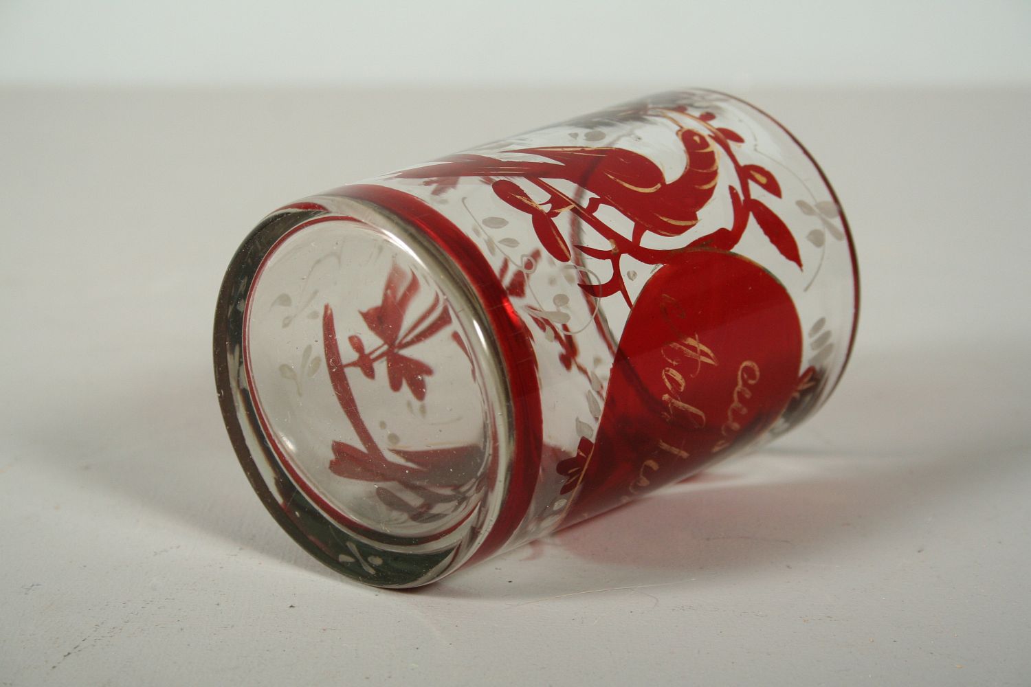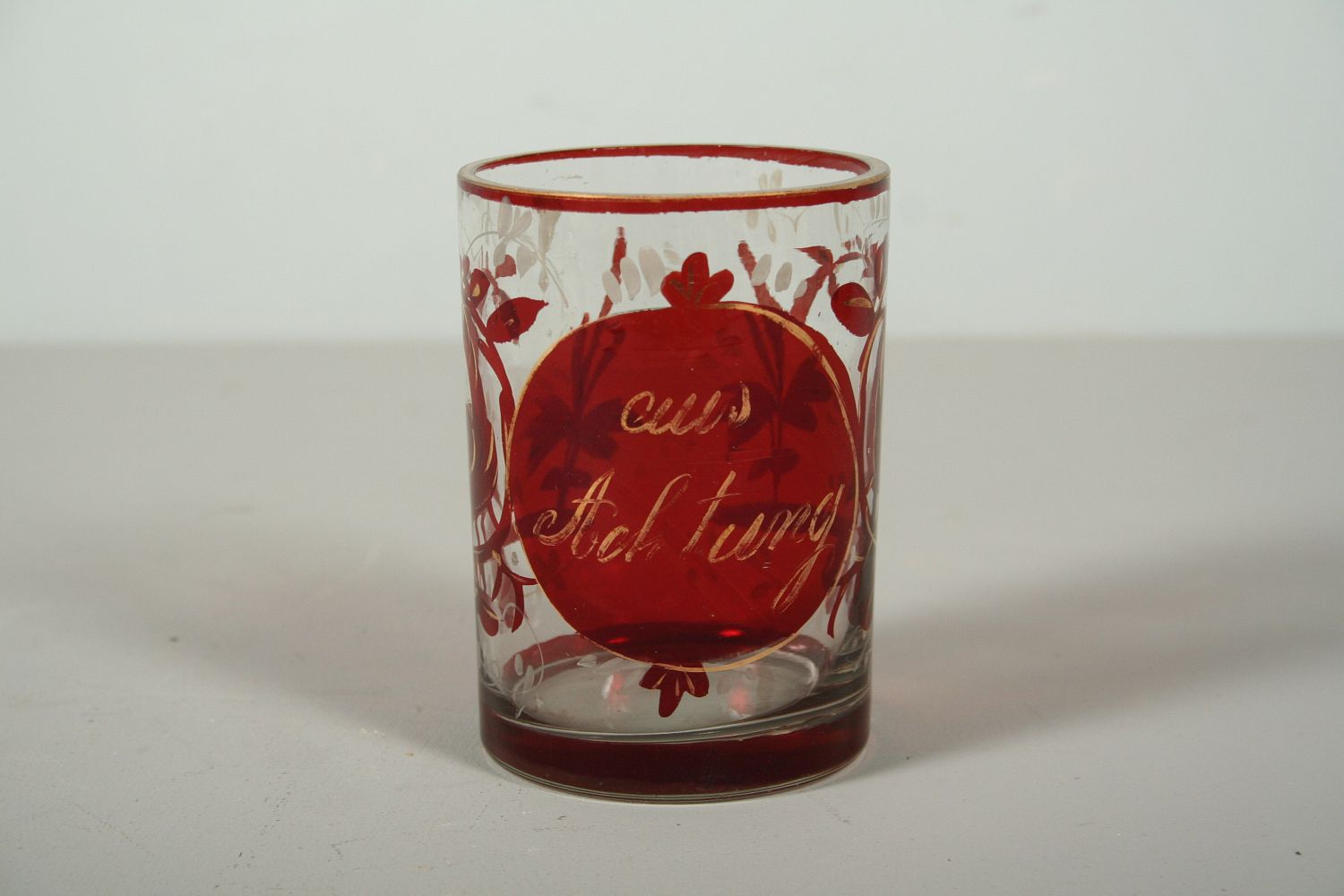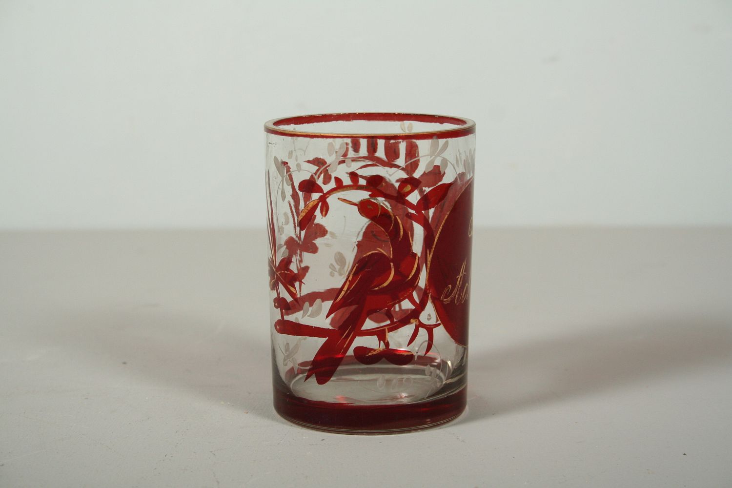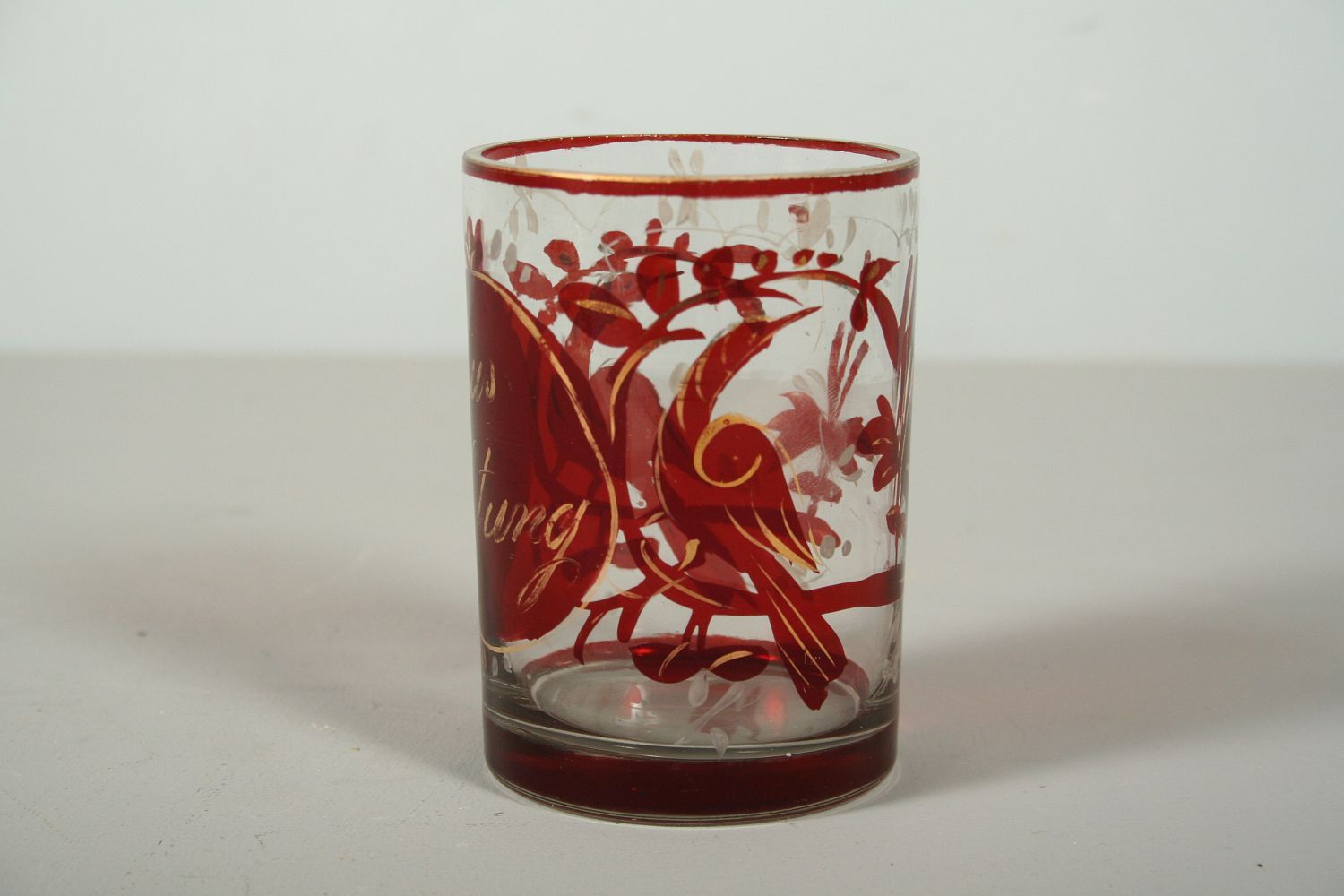 sklenice z čirého skla zdobená rubínovou lazůrou, malovaný středový medailon se zlaceným nápisem "aus achtung" po stranách ptáci a rostlinné motivy se zbytky zlacení, válcovitý tvar, 2. polovina 19. století, 10 cm