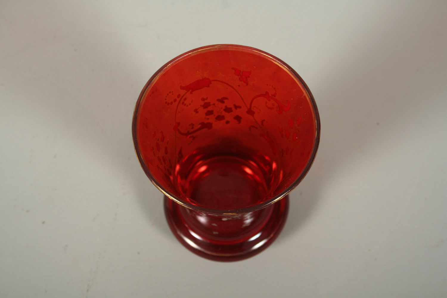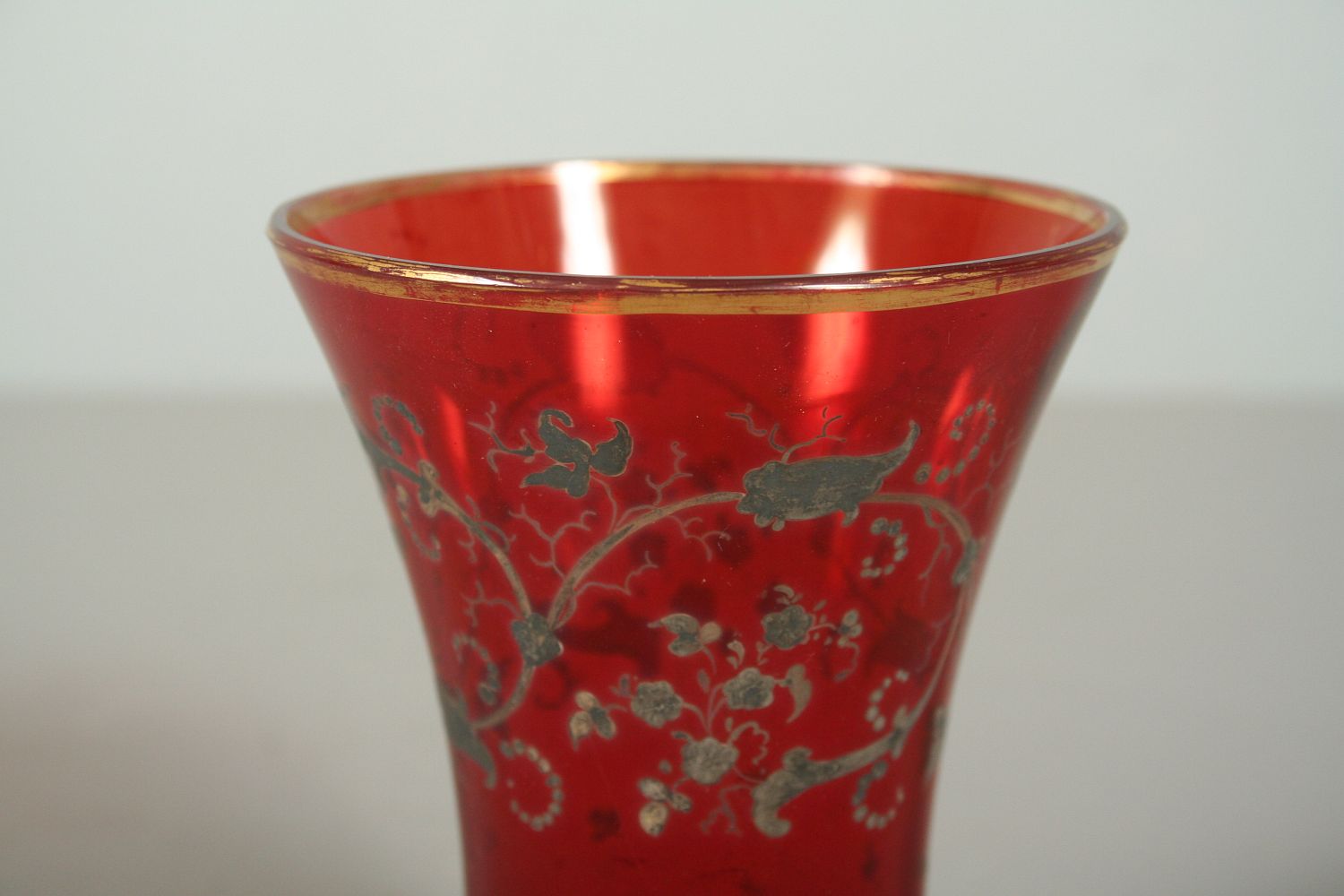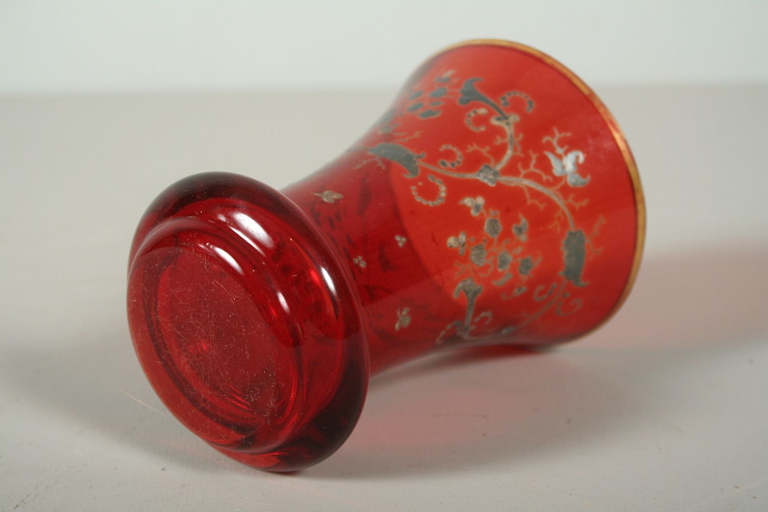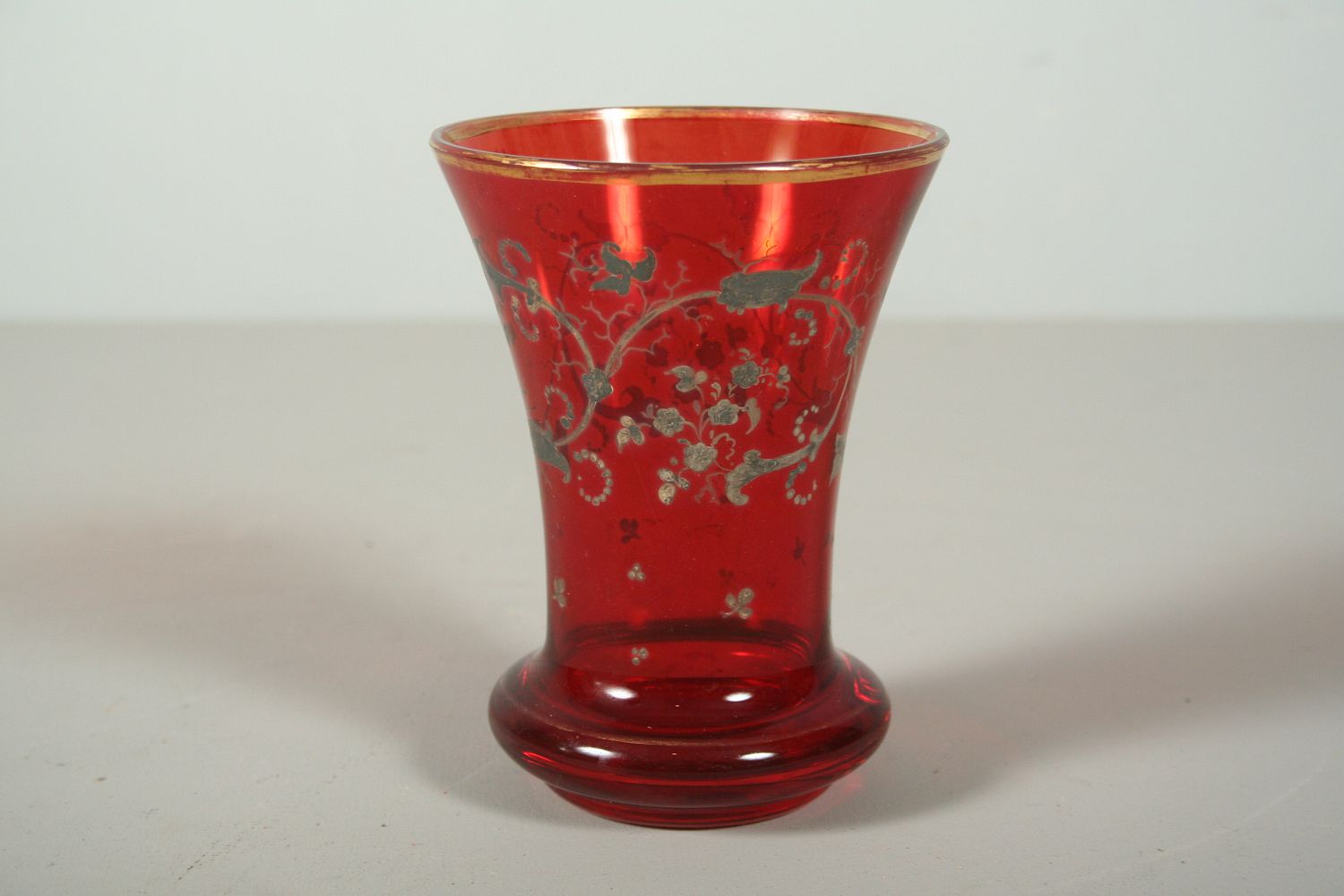 rubínová sklenice, stříbrem malované rostlinné motivy, zbytky zlacení, rozvitý tvar dole s hladkou patkou, 2. polovina 19. století, 13 cm