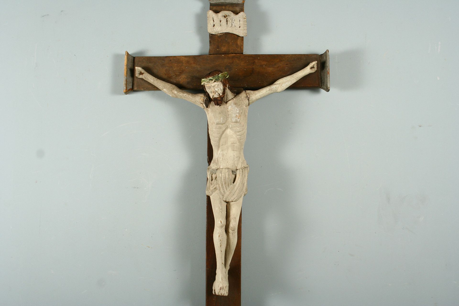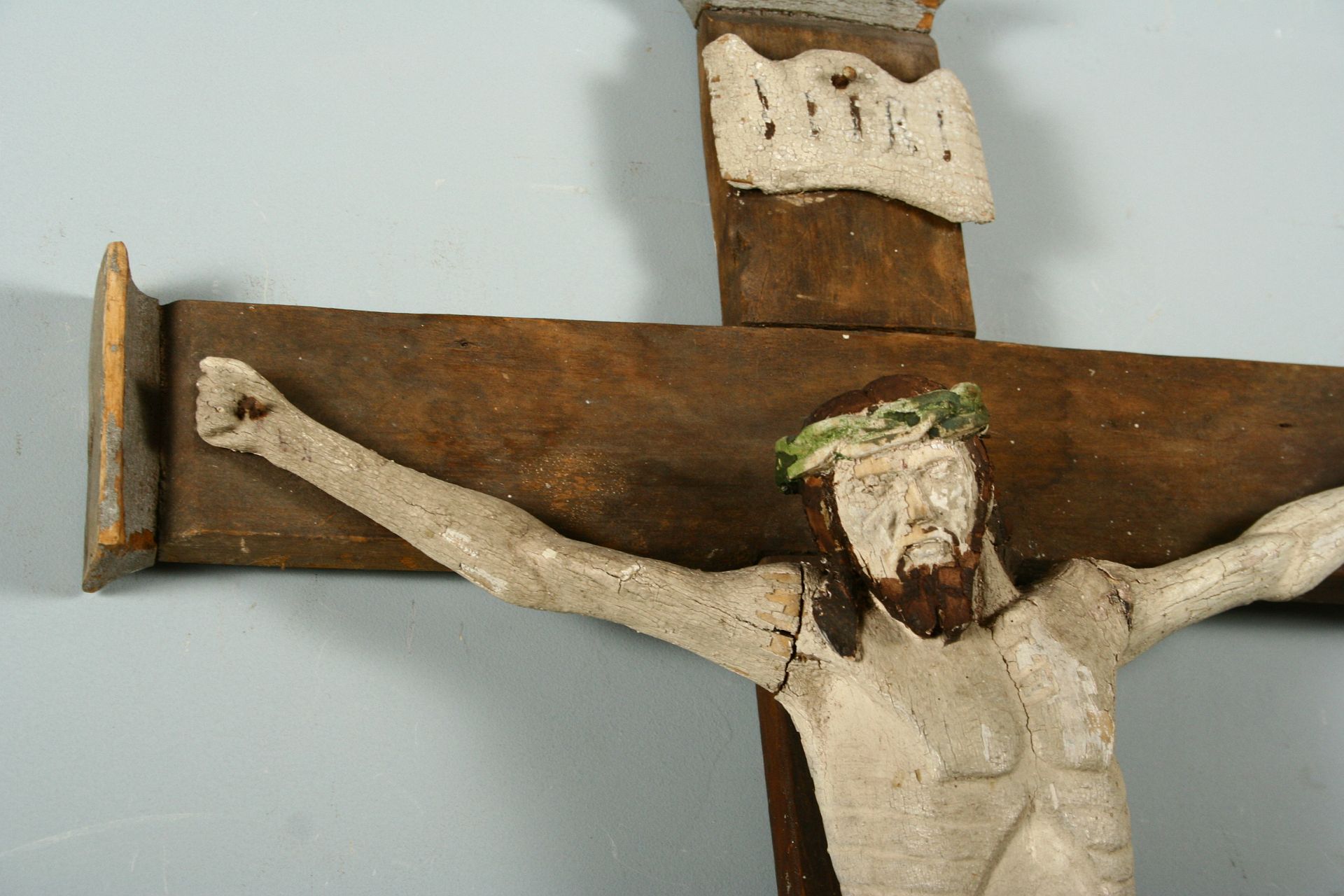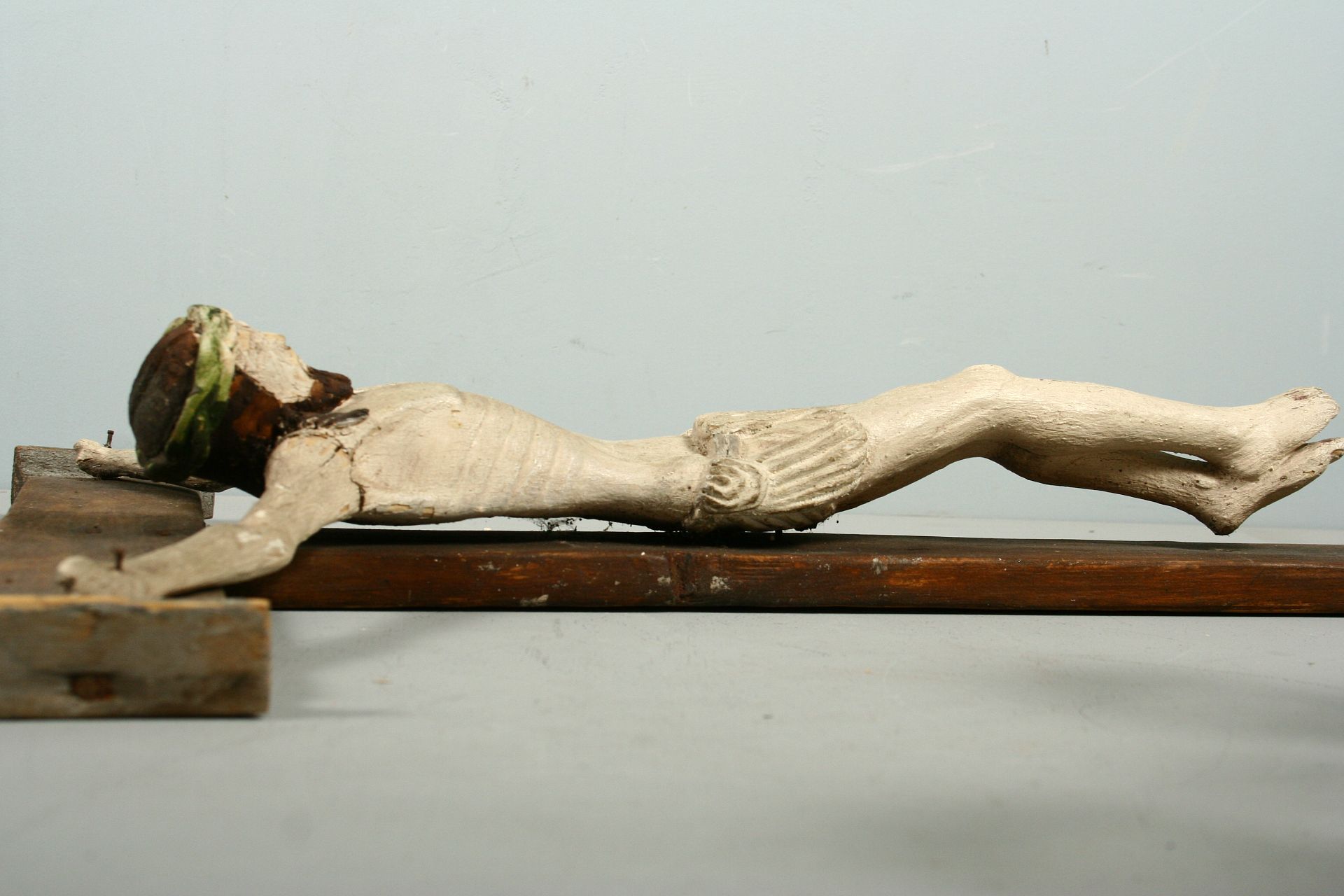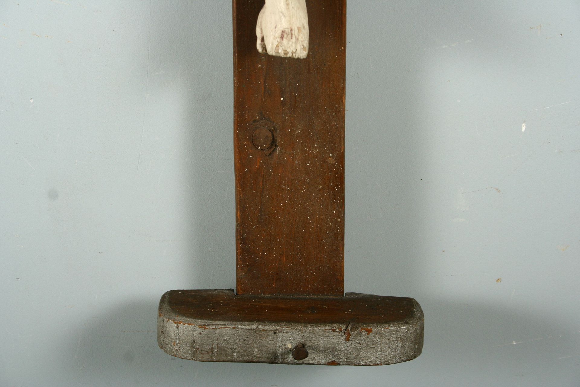 dřevěný vyřezávaný Ježiš Kristus na jednoduchém kříži s patkami a možností zavěšení, lidová dřevořezba s původní povrchovou úpravou z konce 19. století, 70 x 37 cm Kristus 40 x 32 cm