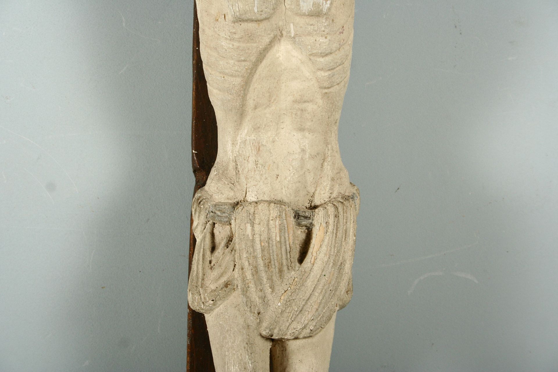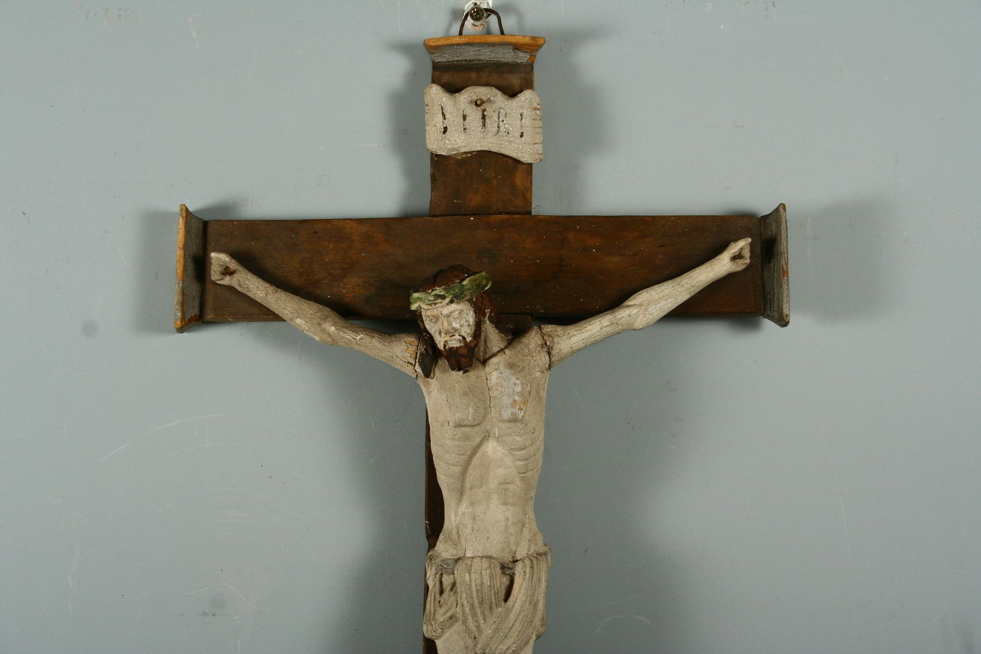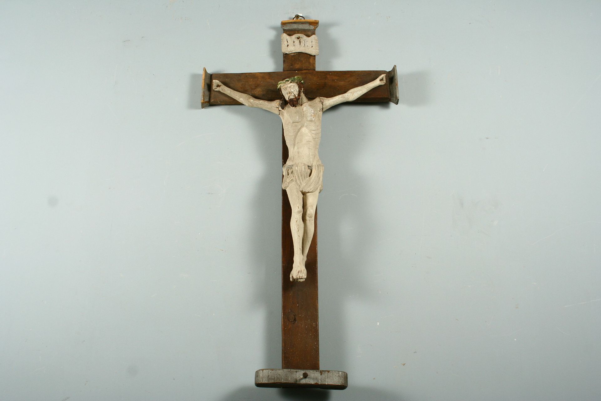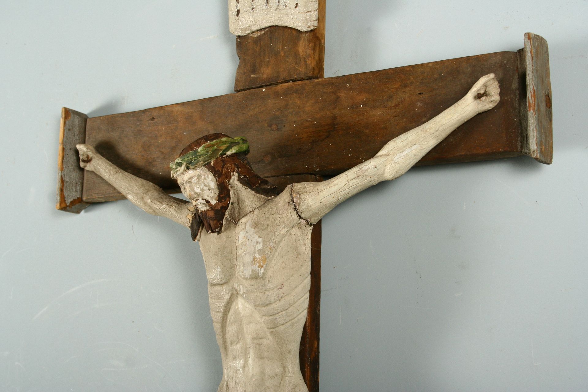 dřevěný vyřezávaný Ježiš Kristus na jednoduchém kříži s patkami a možností zavěšení, lidová dřevořezba s původní povrchovou úpravou z konce 19. století, 70 x 37 cm Kristus 40 x 32 cm