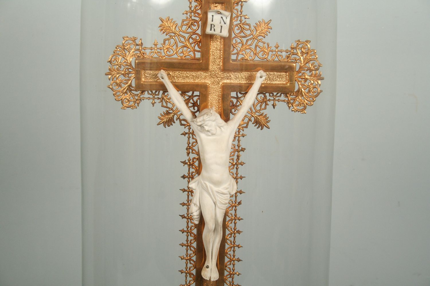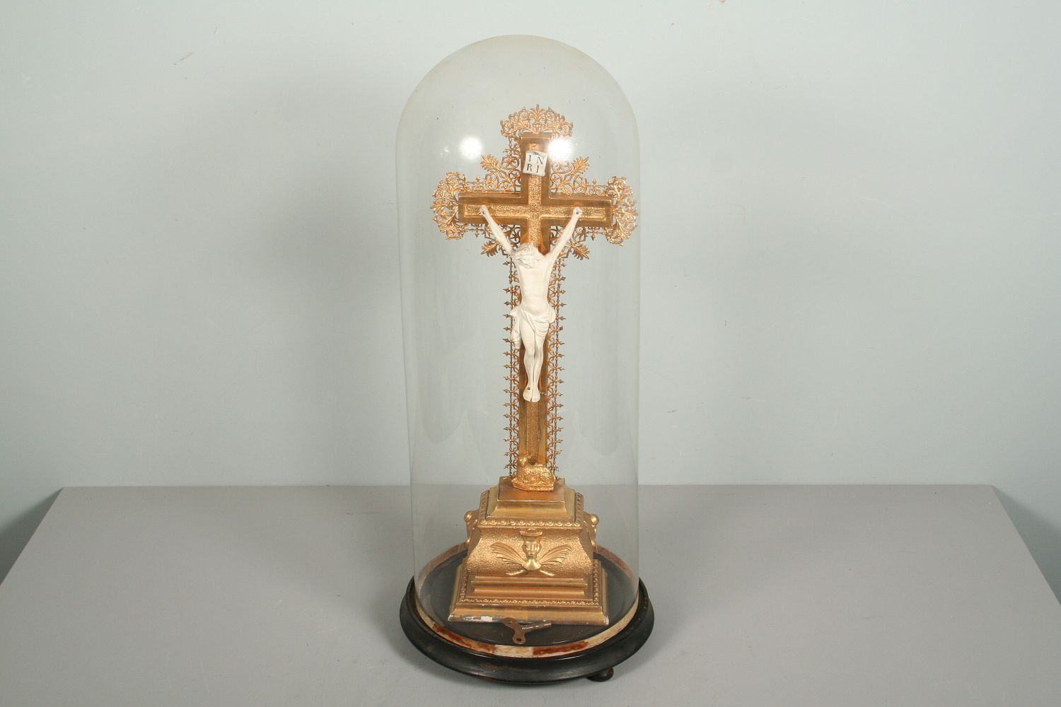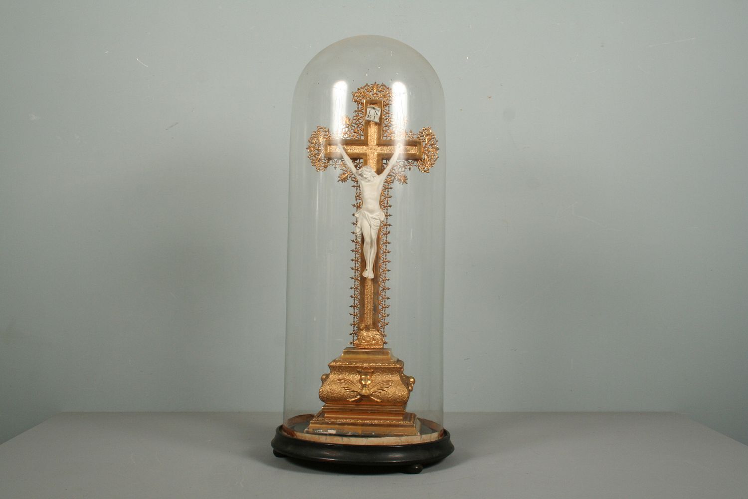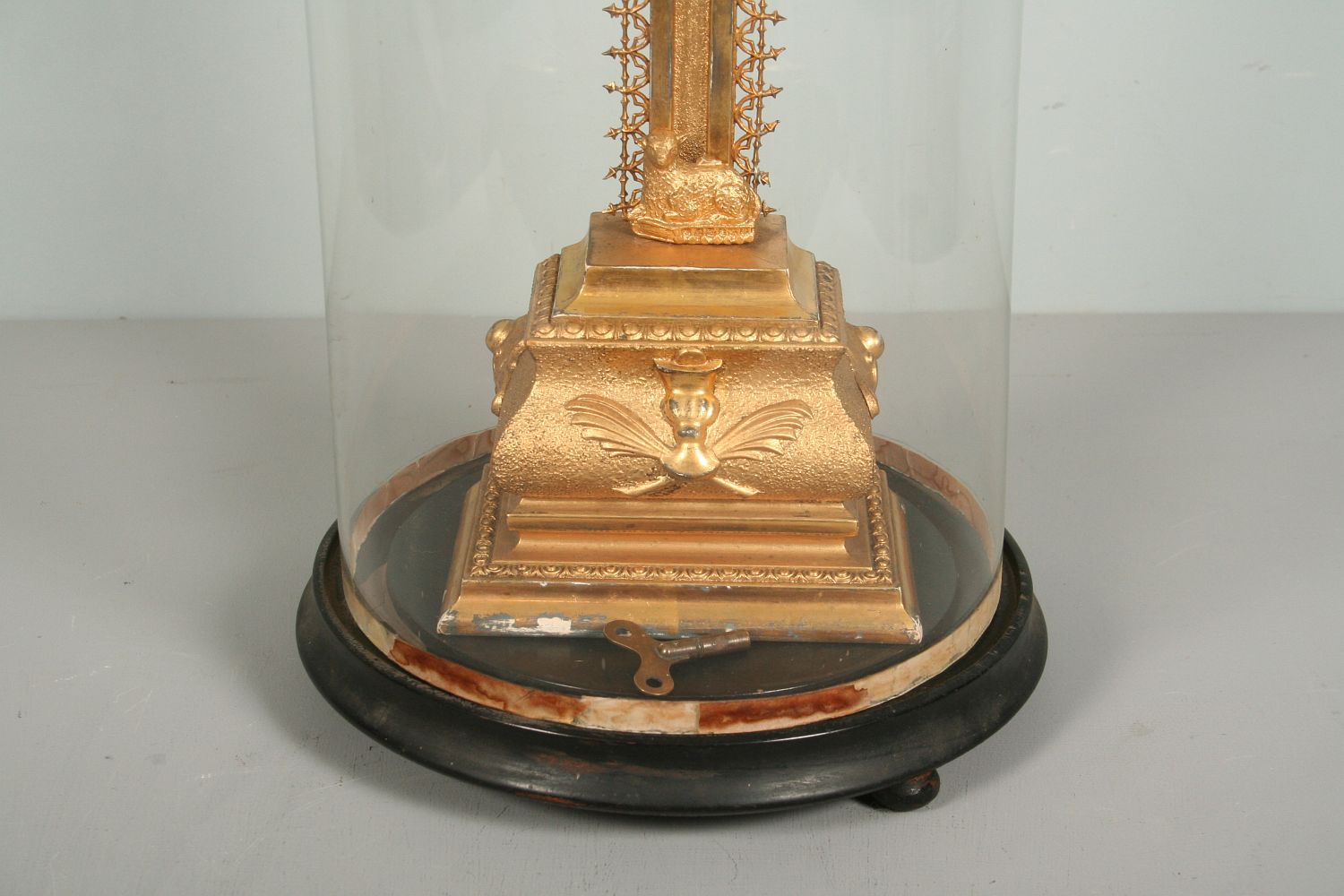 zlacený dřevěný kříž s porcelánovým Kristem pod skleněným šturcem na dřevěném kruhovém podstavci s hracím strojkem na klíček, funkční s klíčkem, 58 x 26 cm