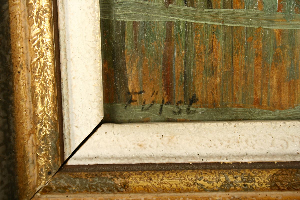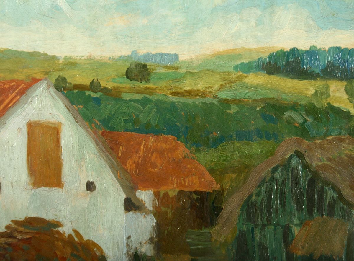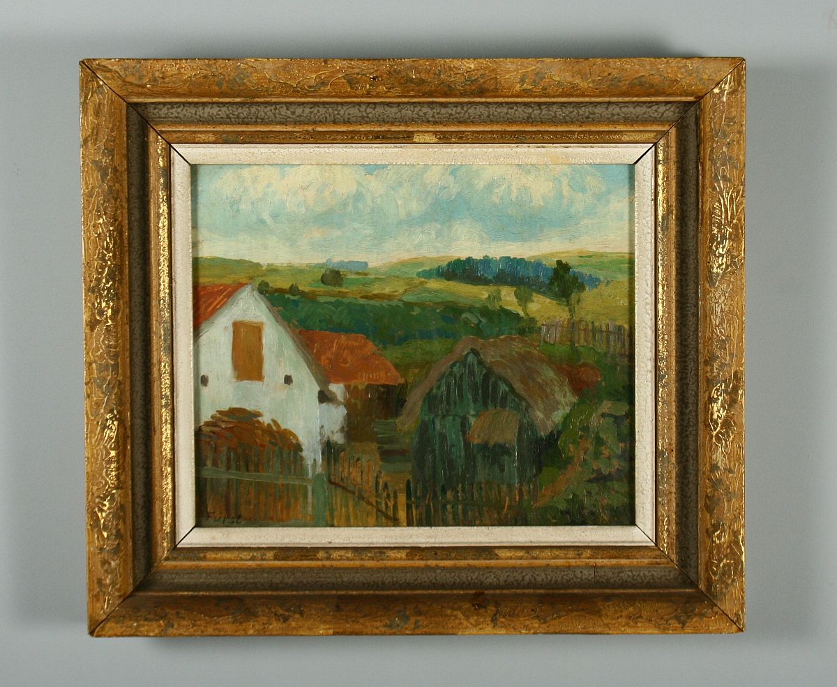 vesnické stavení v krajině, olej na lepence, ve výřezu 27,5 x 33,5 cm s rámem 43 x 49 cm, autor Jinřich Fürst, pdepsáno vlevo dole Fürst, rámováno v původním rámu pod sklem, obraz byl vystavený v Galerii v.u. v Náchodě na výstavě Mařákovci.... pod číslem 32 ze soupisu děl, výstavní razítko na zadní straně, barevně publikován v knize Mařákovci.... strana 45