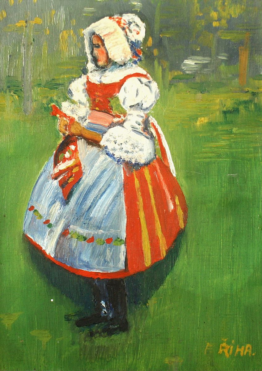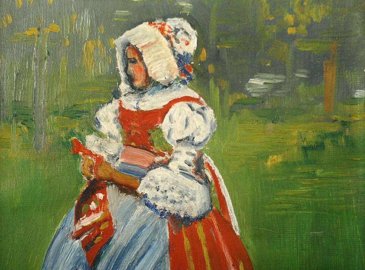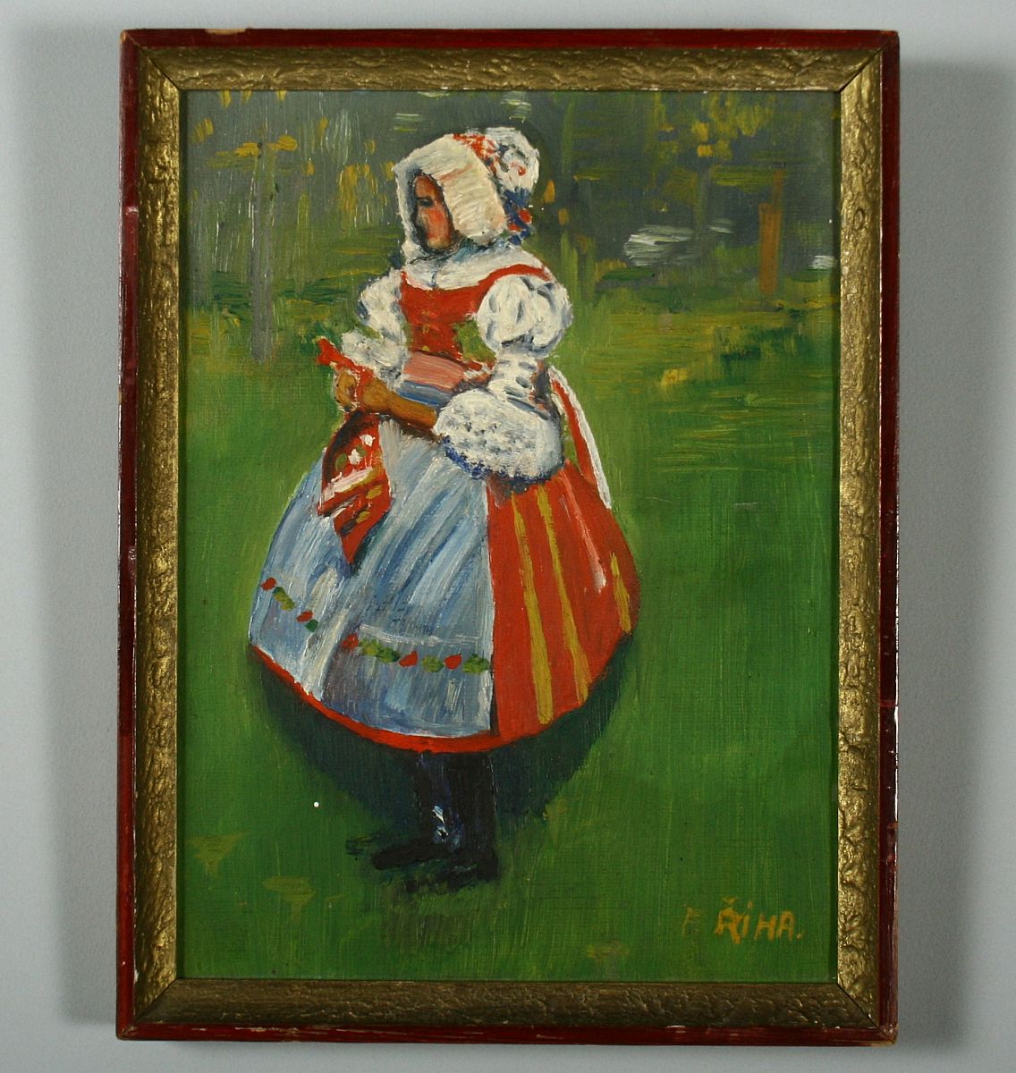 selka v bohatém kroji, olej na kartonu, ve výřezu 24 x 17,5 cm s rámem 27 x 21 cm, rámováno v původním rámu