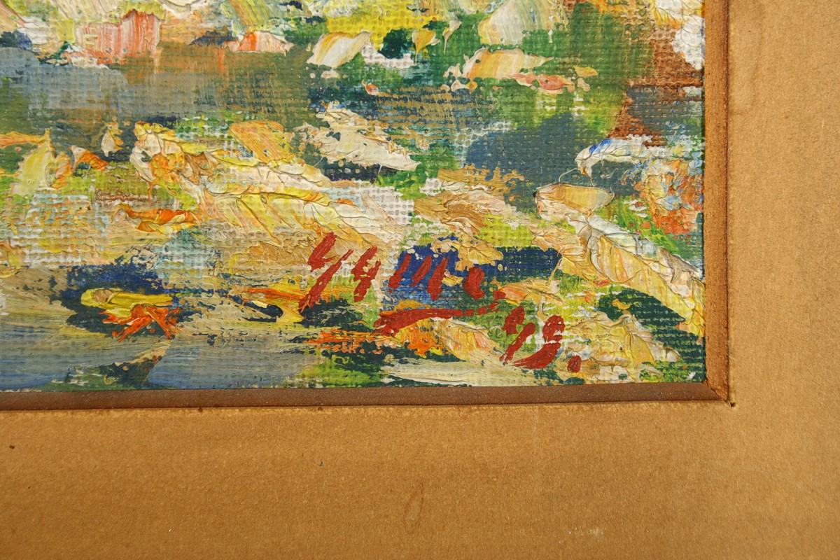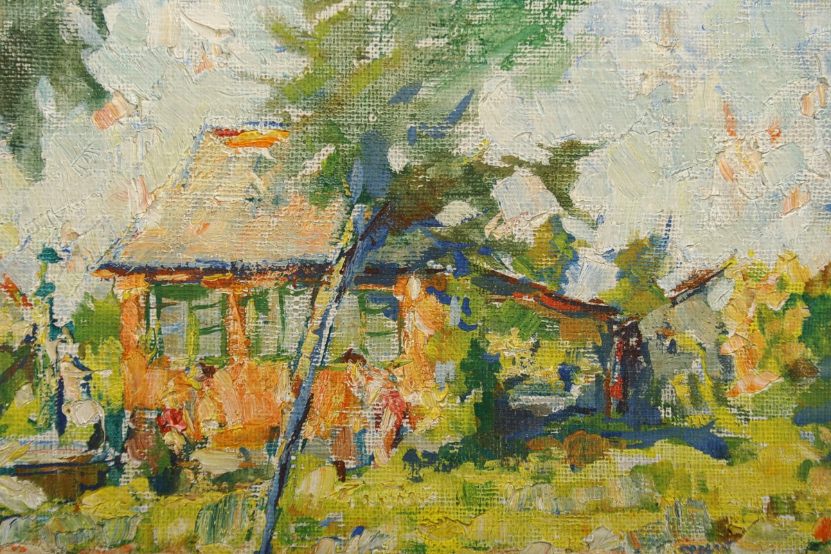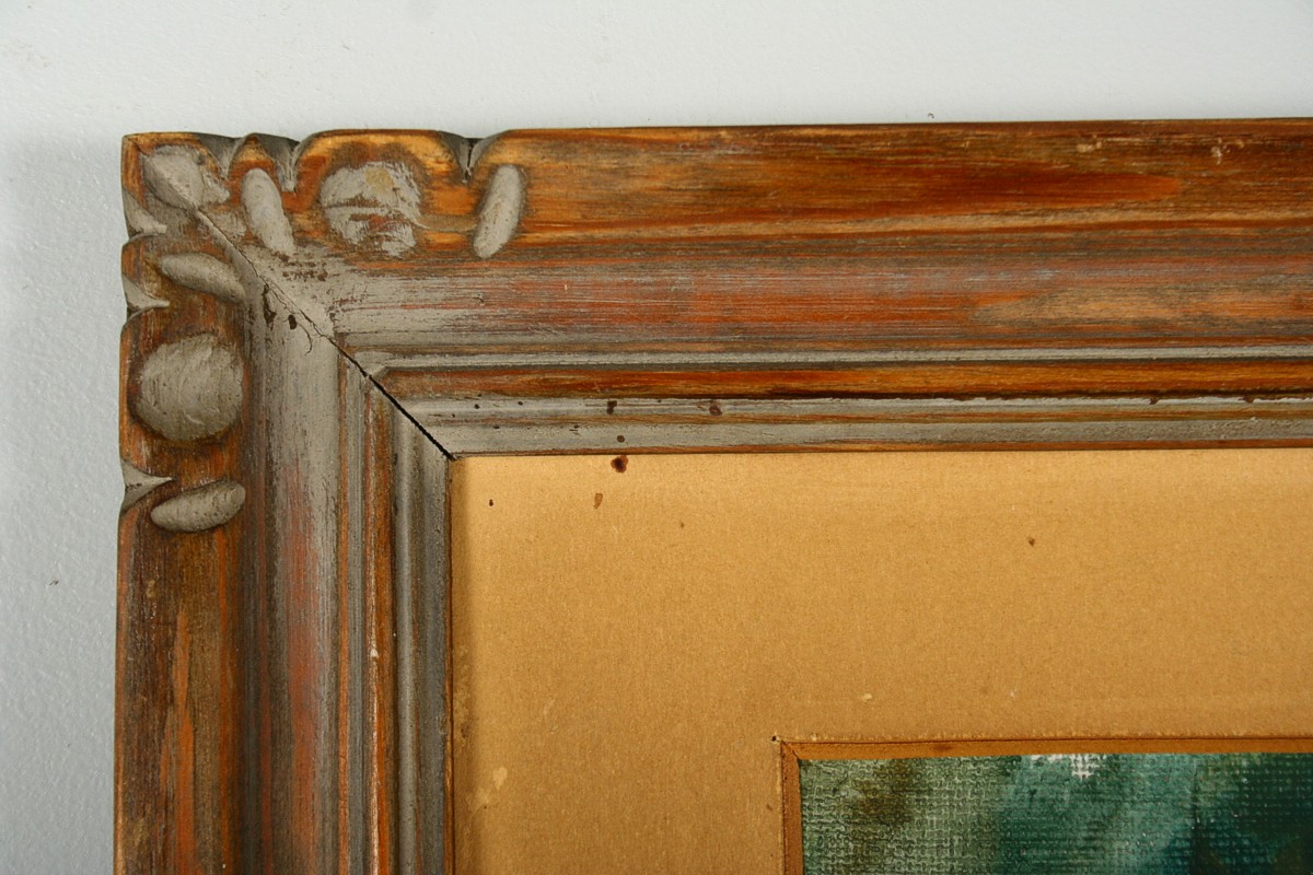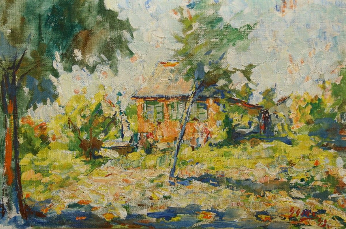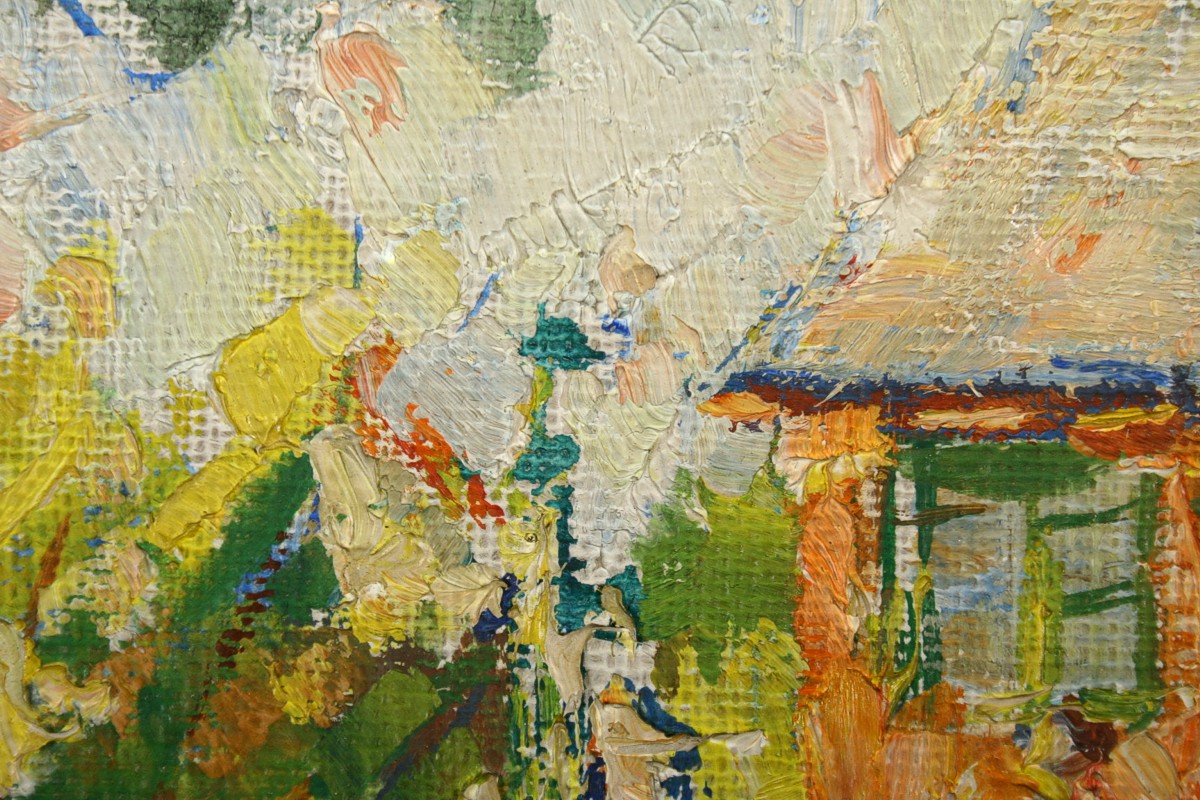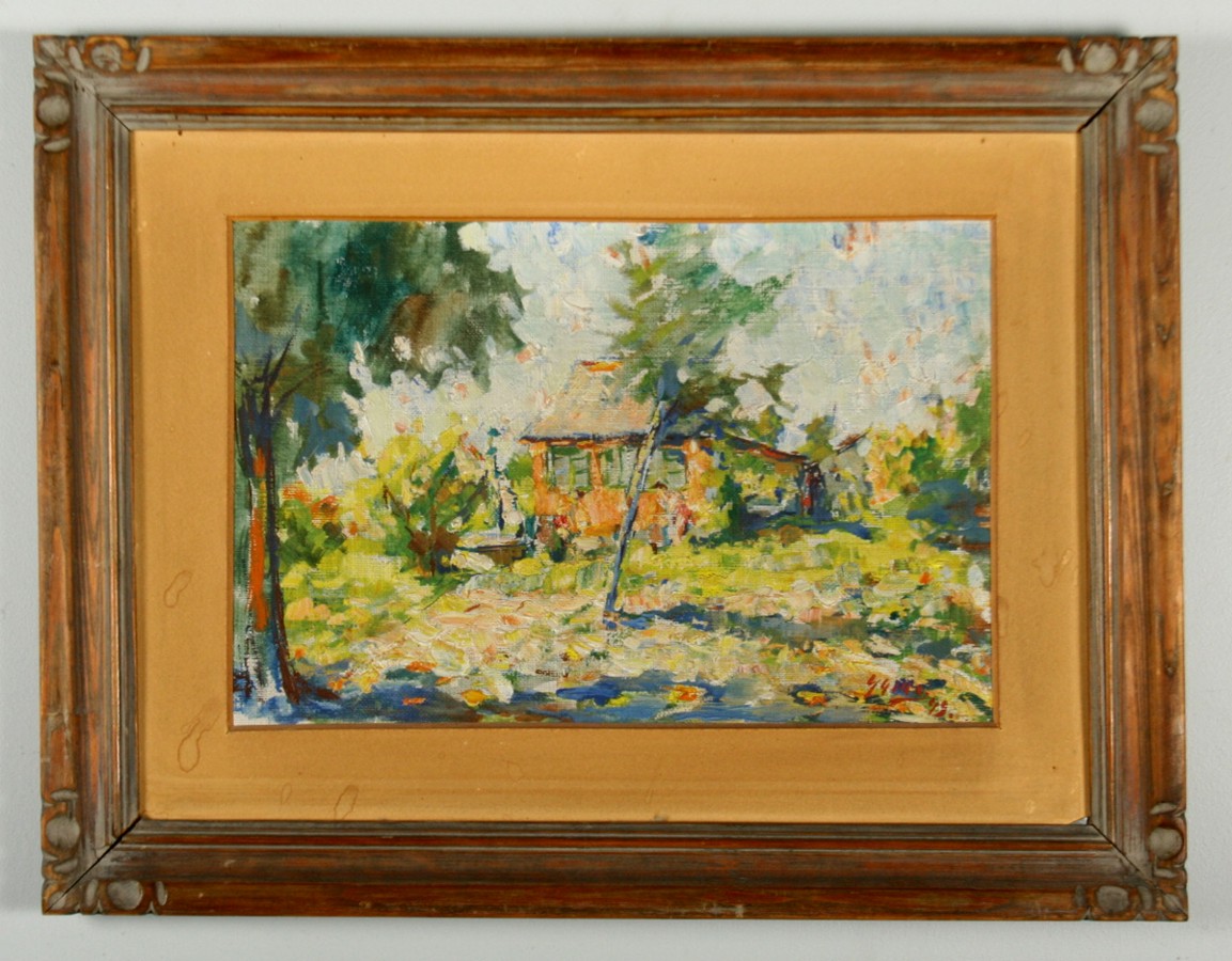 obraz okolí zahradního domku, olej na plátně lepeném na kartonu, ve výřezu 22 x 33 cm, s rámem 39 x 50 cm, neznámý autor, podepsáno vpravo dole nečitelně, rámováno v původním řezaném rámu a v paspartě