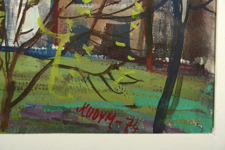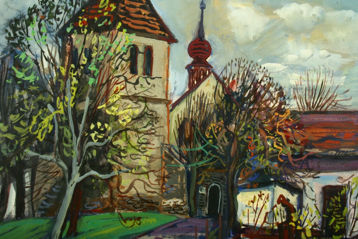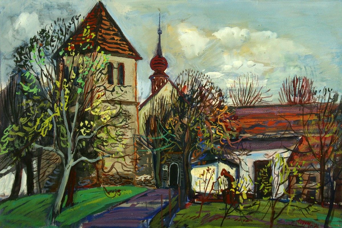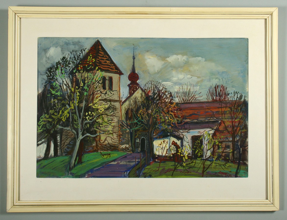 obraz jaro před kostelíkem na Václavicích u Náchoda, tempera na papíře, ve výřezu 36 x 53 cm s rámem 52 x 68 cm, autor Jiří Kodym, podepsáno vpravo dole Kodym 74, rámováno v paspartě a rámu pod sklem