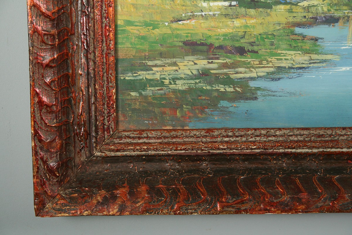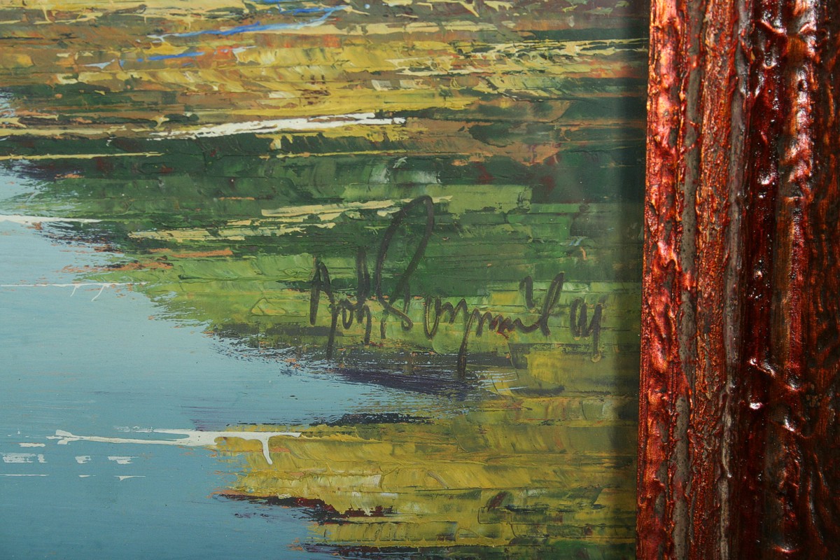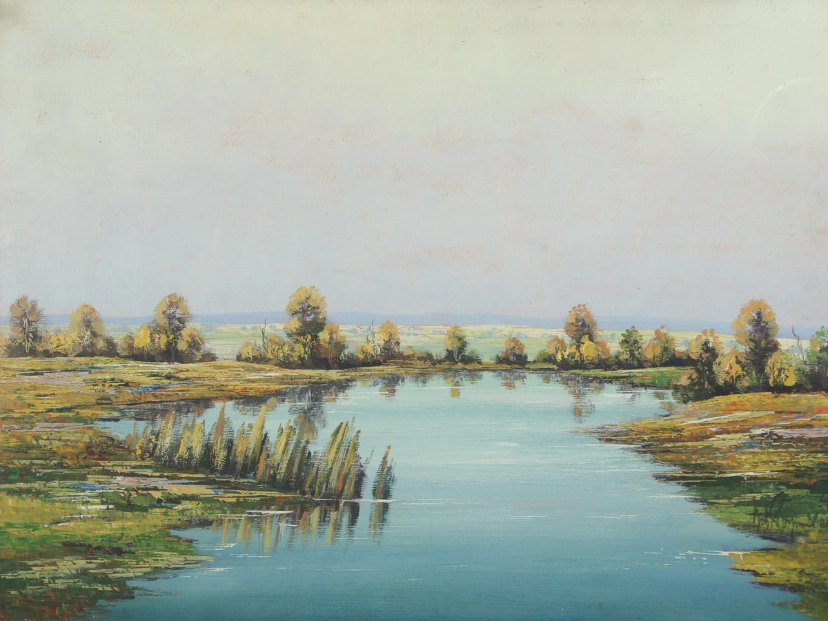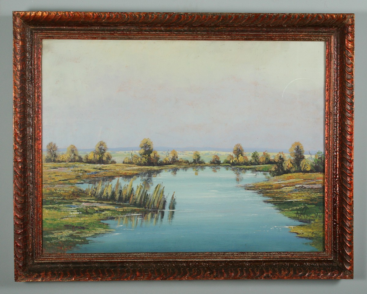 obraz krajiny s vodní hladinou z okolí Třeboně, olej na kartonu 49 x 65 cm s rámem 61 x 77 cm, autor Bohumil Pospíšil podepsáno vpravo dole Boh. Pospíšil, rámováno v původním rámu pod sklem