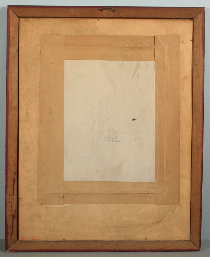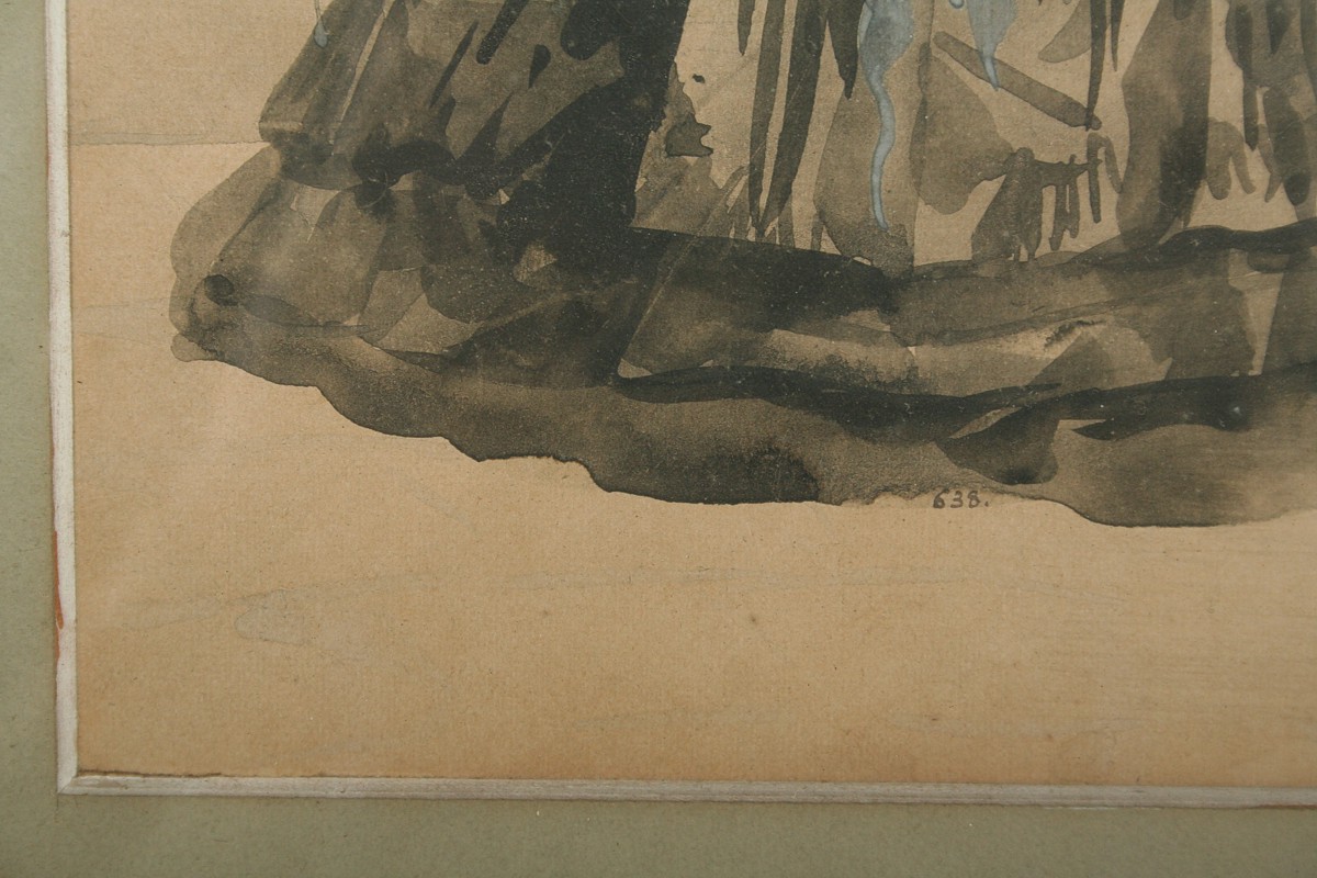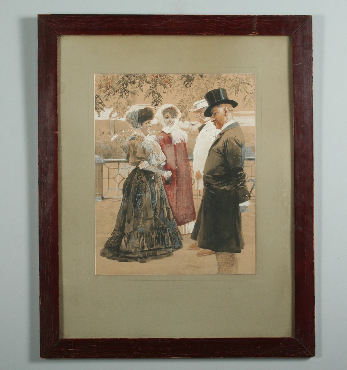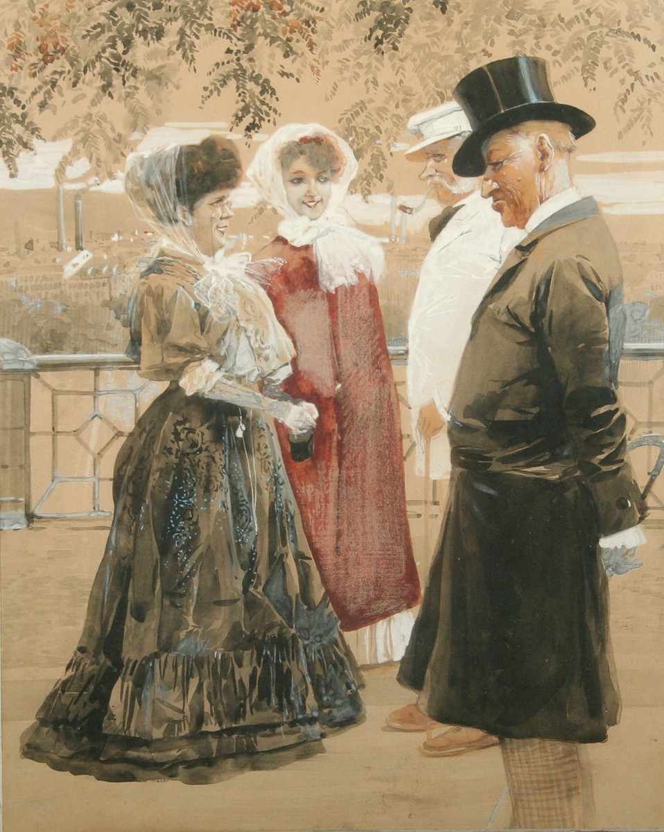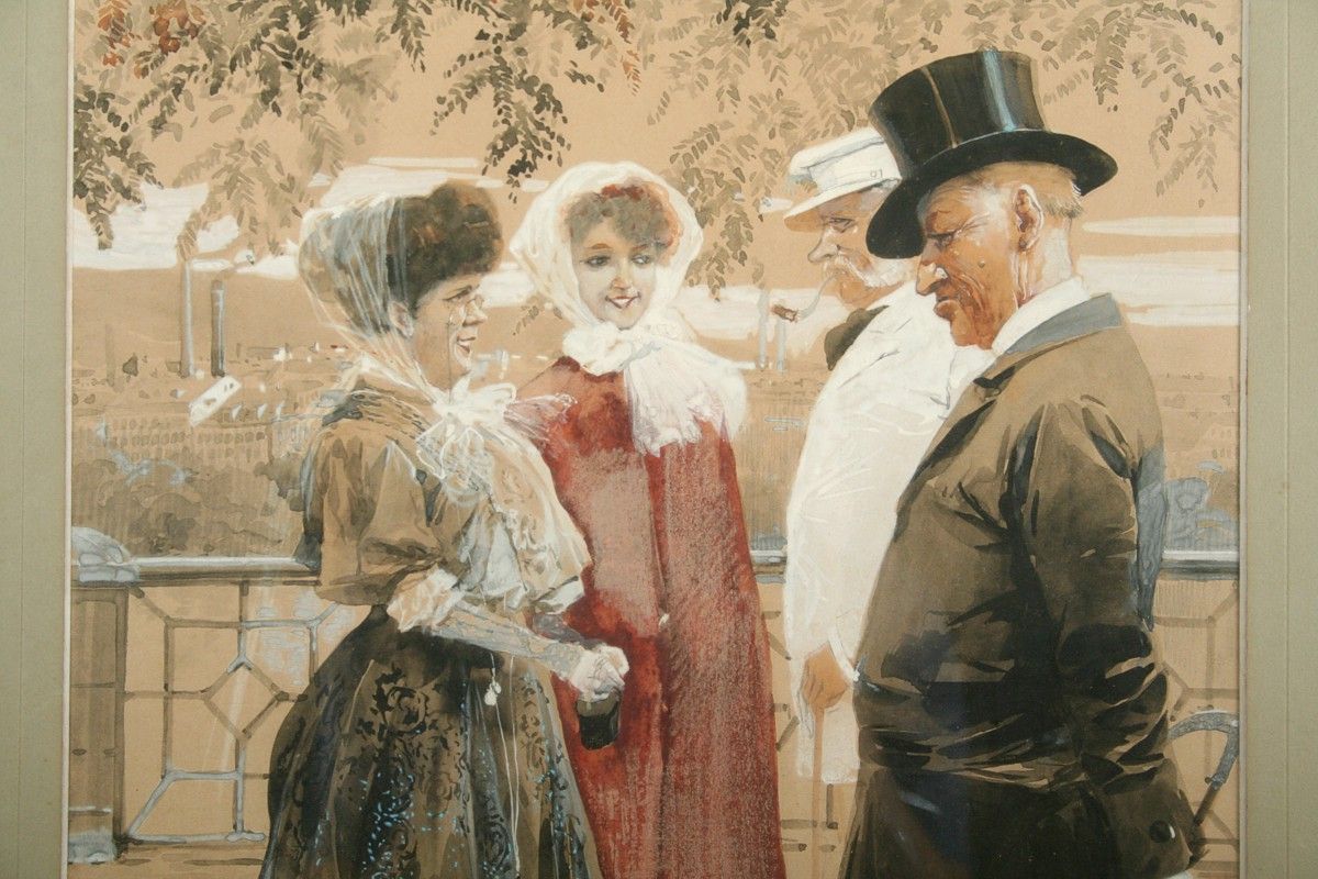 secesní obraz setkání vyšší společnosti na procházce, akvarel na papíře ve výřezu 39 x 31 cm, s rámem 68 x 54 cm, autor neznámý nepodepsáno značeno číslem v kresbě 638 z počátku 20. století, obdobné akvarely v tomto secesním duchu maloval Karel Rélink, nebo Jan Dědina a mnozí jiní na přelomu 19. a 20. století, rámováno v původní paspartě a rámu pod sklem