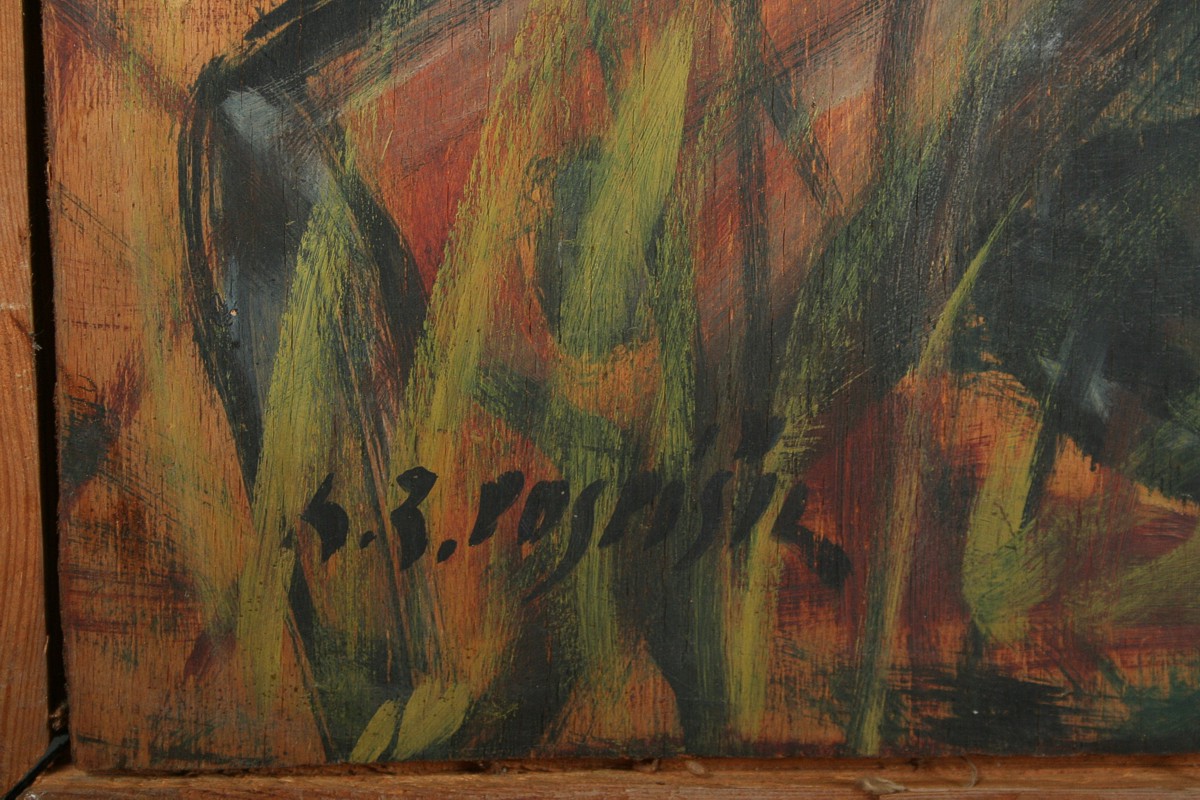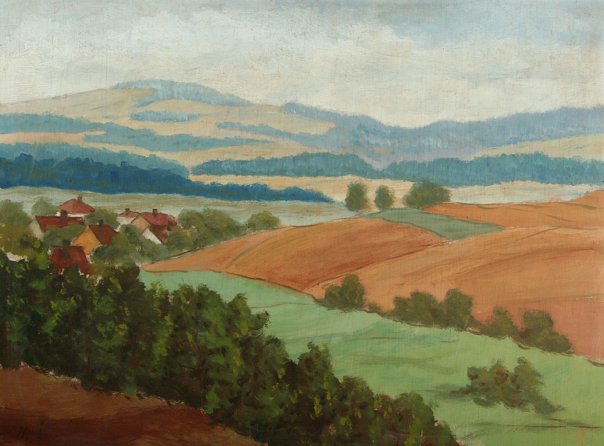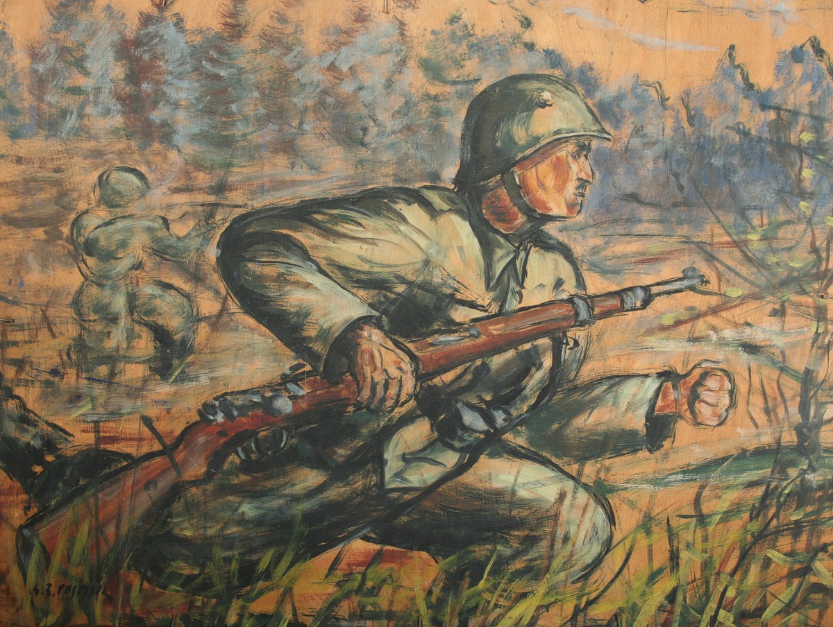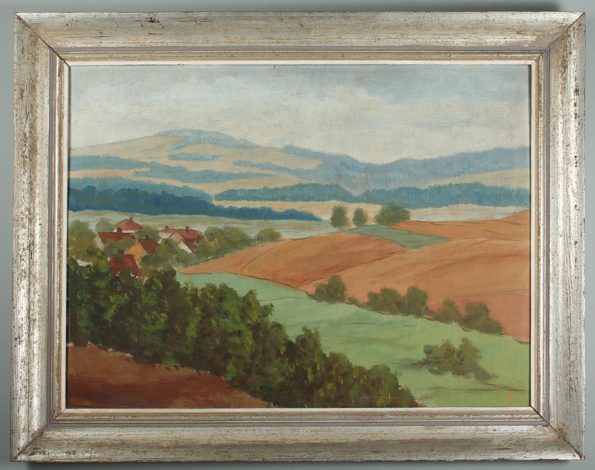 oboustraný obraz krajiny s vesnicí a na zadní straně běžící voják s puškou, olej na desce z překližky, 62 x 84 cm s rámem 80 x 102 cm, autor Jan Bohumil Pospíšil, podepsáno vlevo dole Pospíšil a J.B. Pospíšil, rámováno v původním rámu