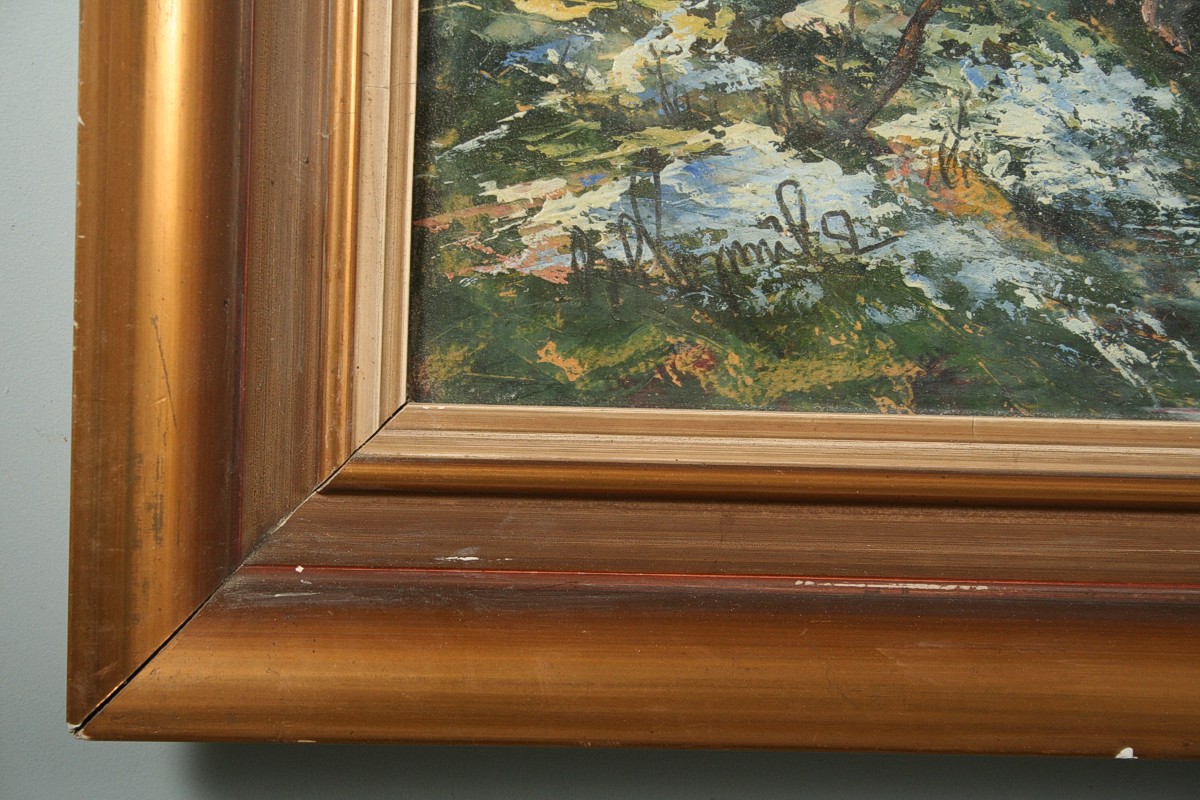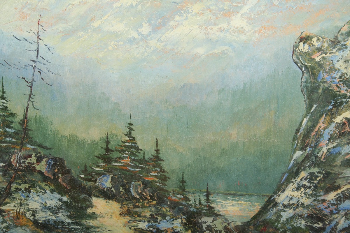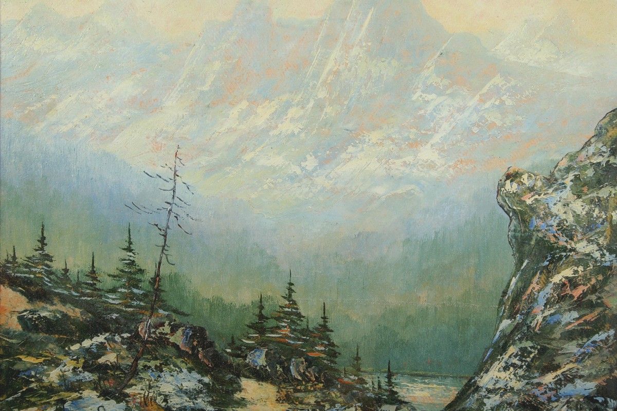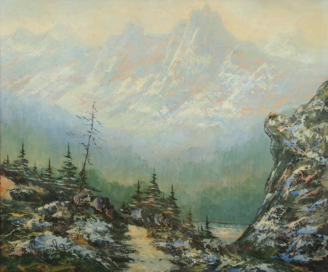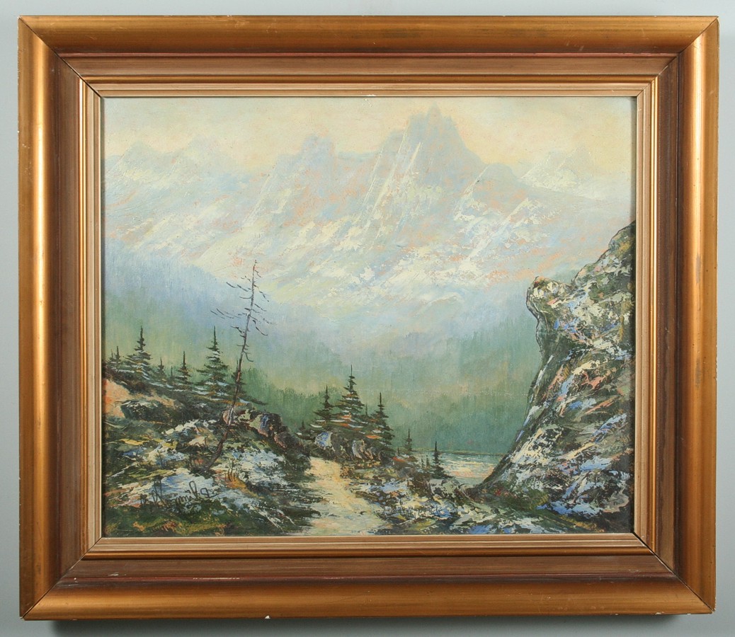 obraz horské krajiny patrně v Tatrách, olej na kartonu 48 x 58 cm s rámem 64 x 74 cm, autor Bohumil Pospíšil podepsáno vlevo dole Boh. Pospíšil, rámováno v původním rámu pod sklem