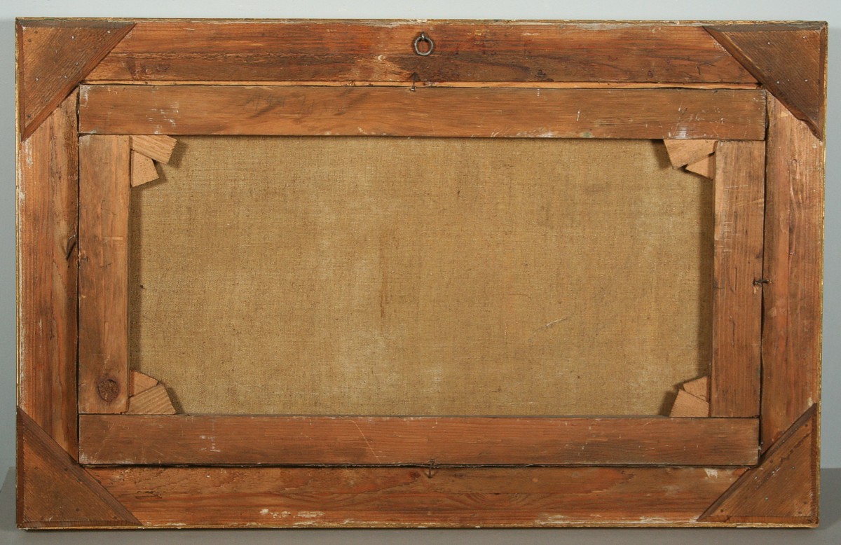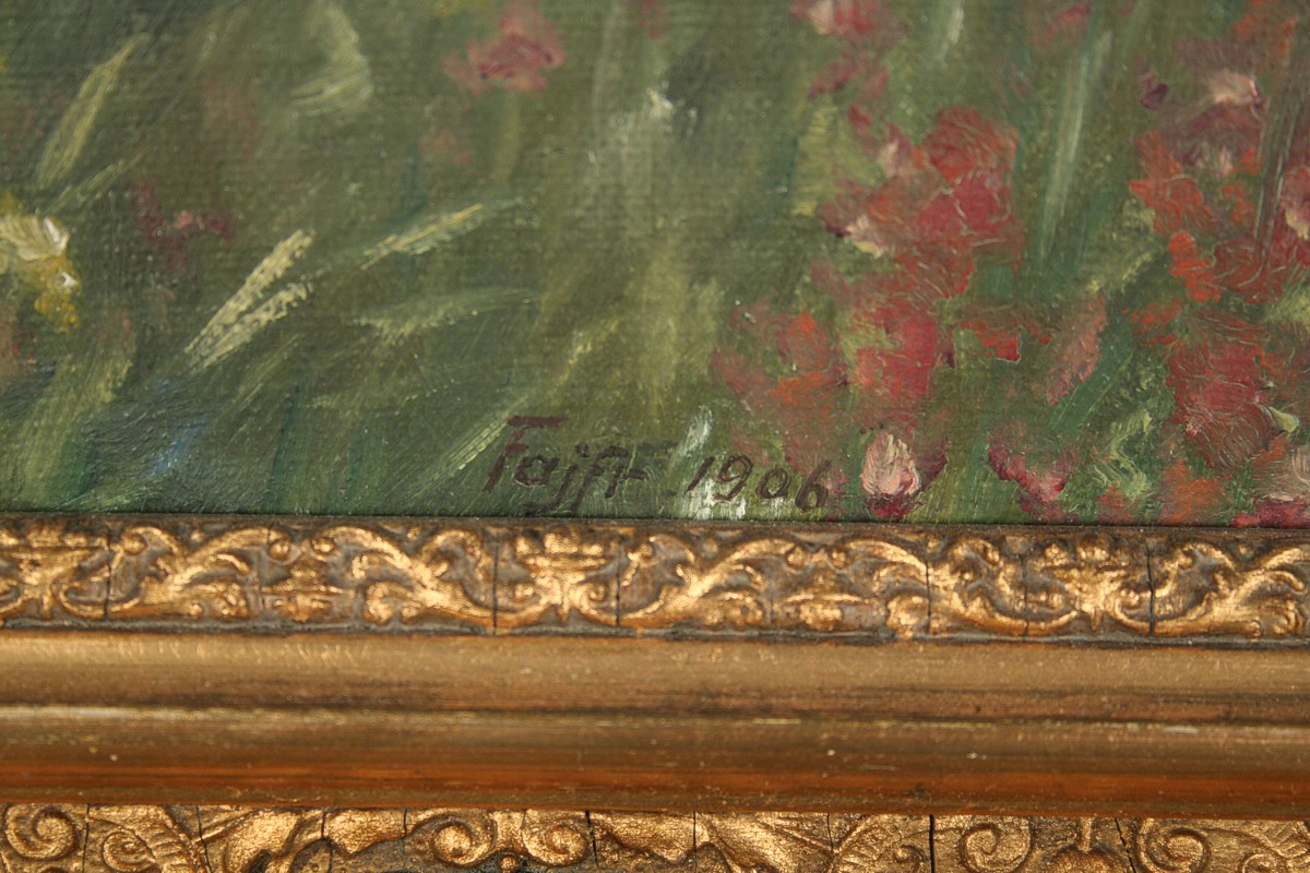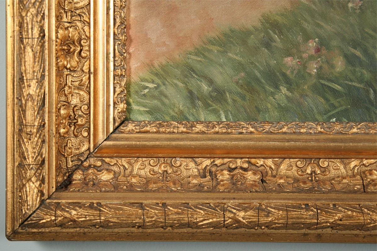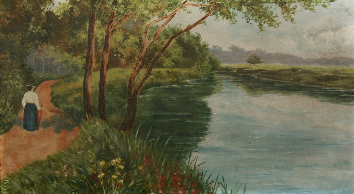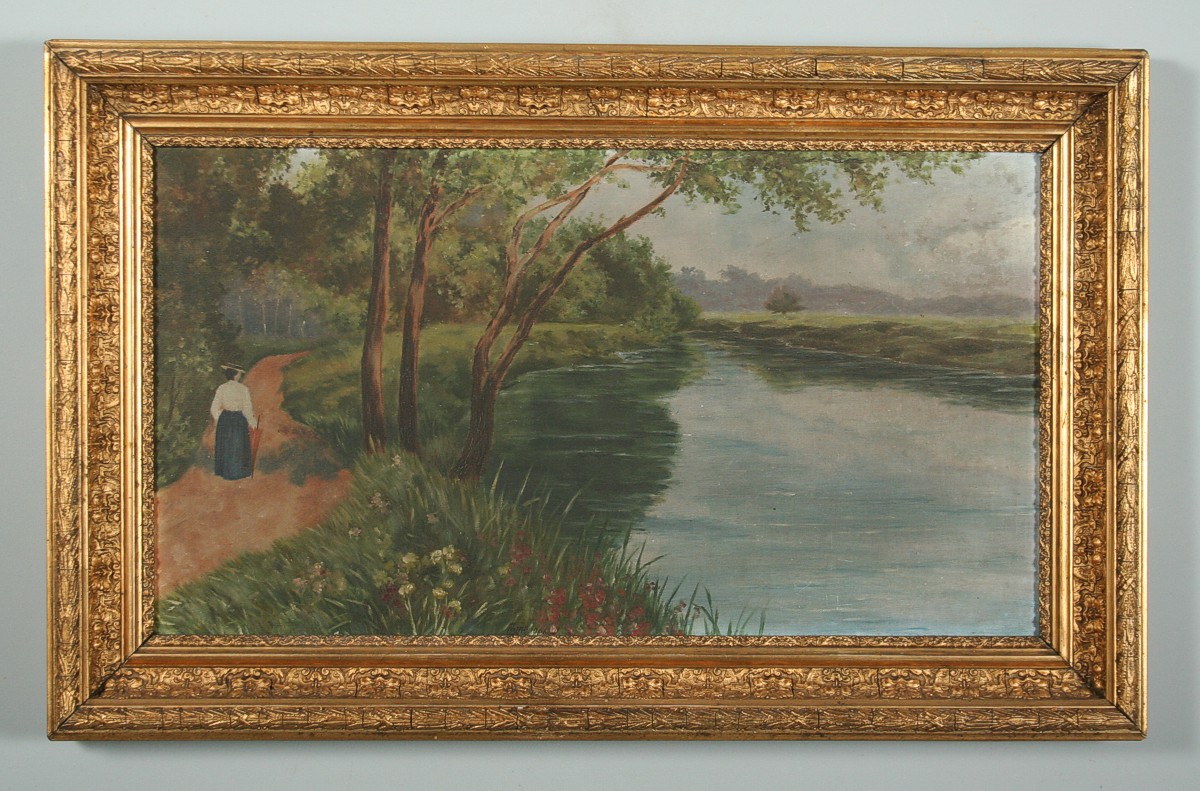 obraz dámy v klobouku se slunečníkem na procházce kolem vody, olej na plátně, 32 x 58 cm s rámem 44 x 69, autor neznámý, podepsáno uprostřed Fajfr 1906, rámováno v původním zdobeném a zlaceném rámu z konce 19. století