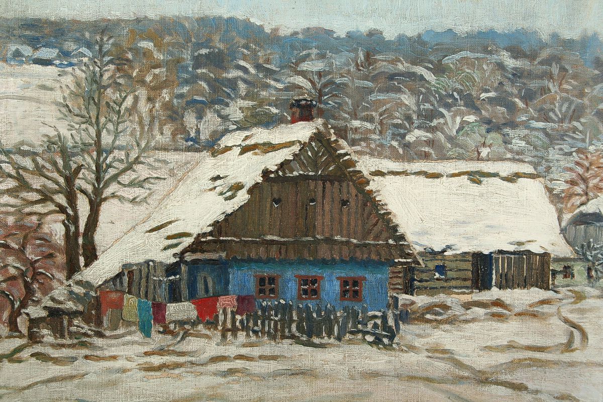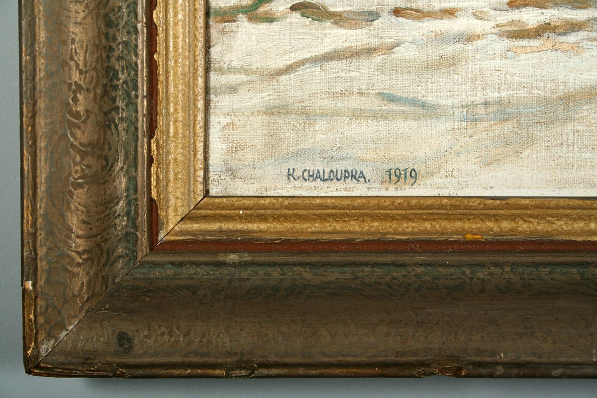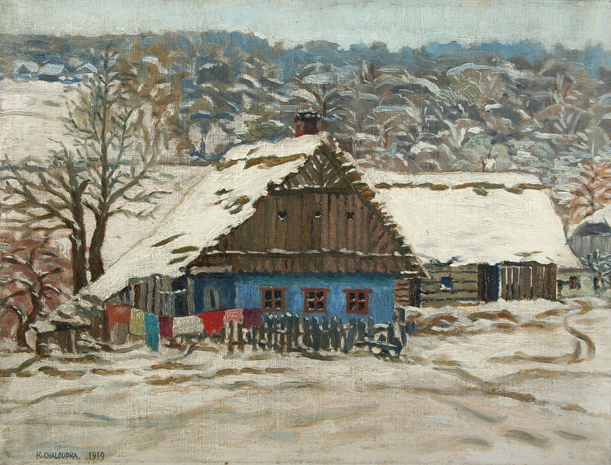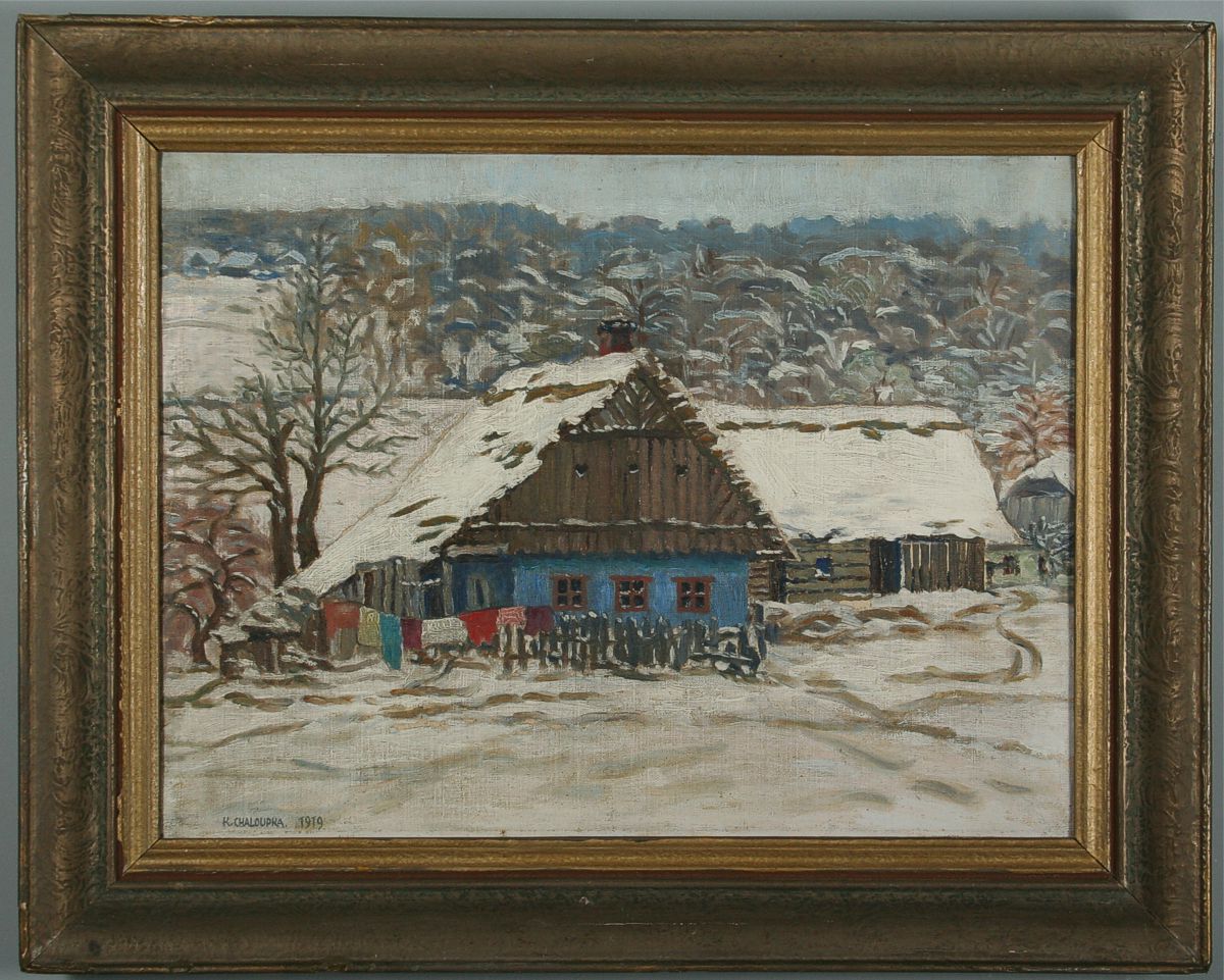 obraz zimní krajiny s chalupou a barevným prádlem, olej na plátně lepeném na kartonu 38 x 50 s rámem 52 x 65 cm, autor Karel Chaloupka, podepsáno vlevo dole K. Chaloupka 1919, rámováno v původním rámu