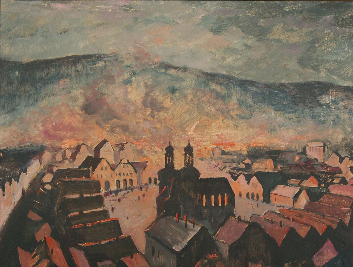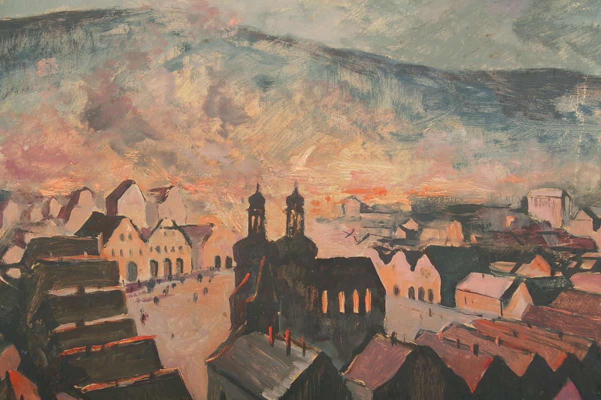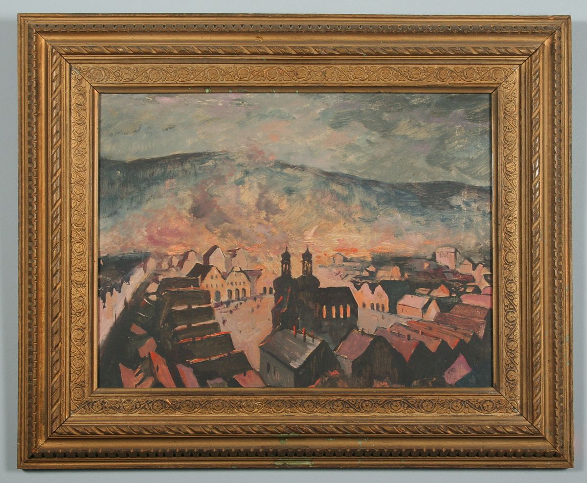 obraz požáru Náchoda v roce 1847 který původně ztvárnil V. Špulák v roce 1885, olej na kartonu 30 x 40 cm s rámem 46 x 56 cm, autor neznámý polovina 20. satoletí, rámováno v dřevěném rámu z 19. století