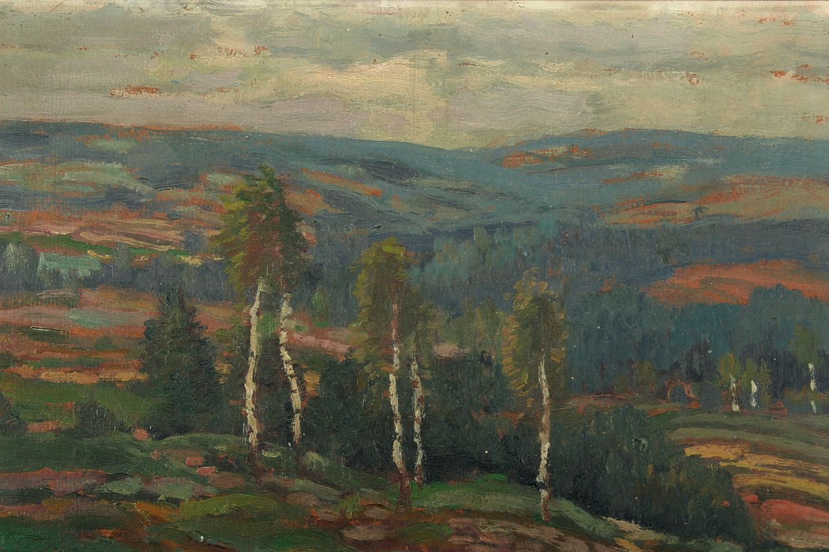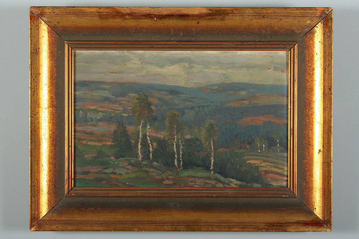 obraz břízek v širé krajině, olej na kartonu 21 x 33 cm s rámem 34 x 46 cm, autor Zdeněk Nemastil, podepsáno vlevo dole tužkou špatně čitelně (bez pomůcek) NEMASTIL, rámováno v původním rámu