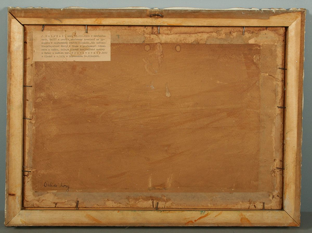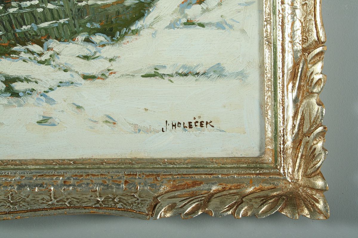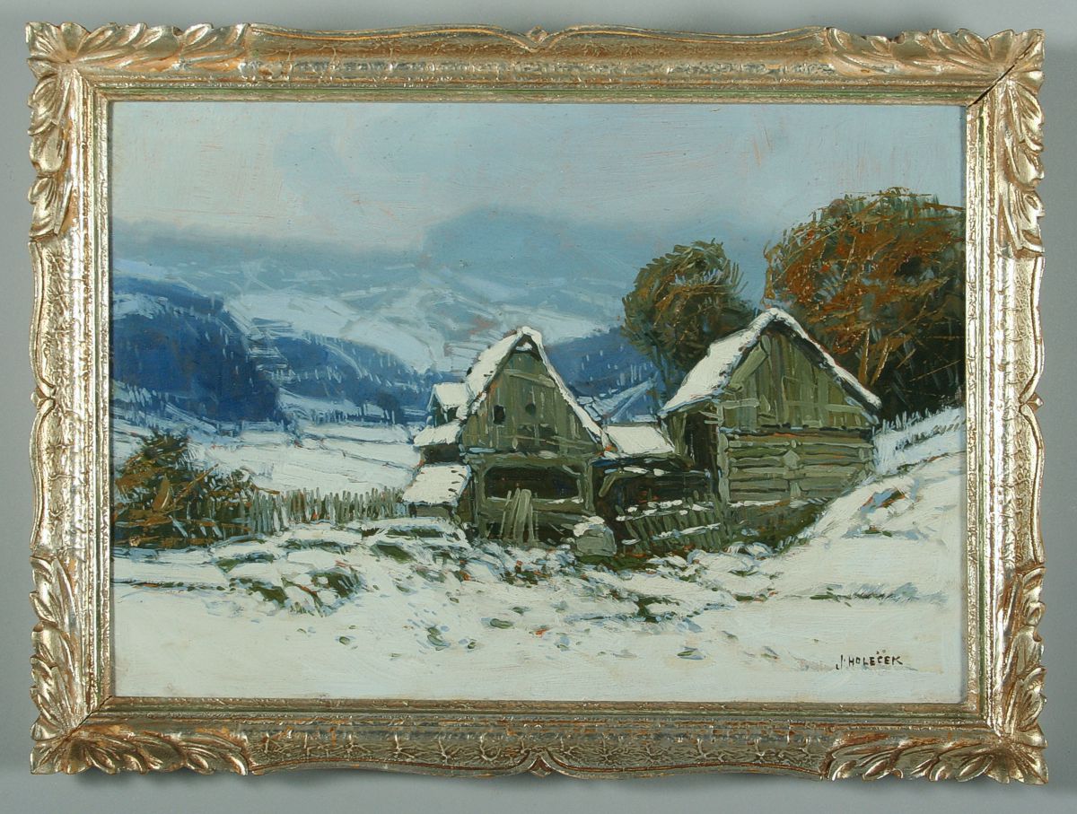 obraz zimní krajiny s chalupou v Orlických horách, olej na kartonu, 34 x 49 cm s rámem 42 x 57 cm, autor J. Holeček, podepsáno vpravo dole J. Holeček, rámováno v původním řezaném rámu