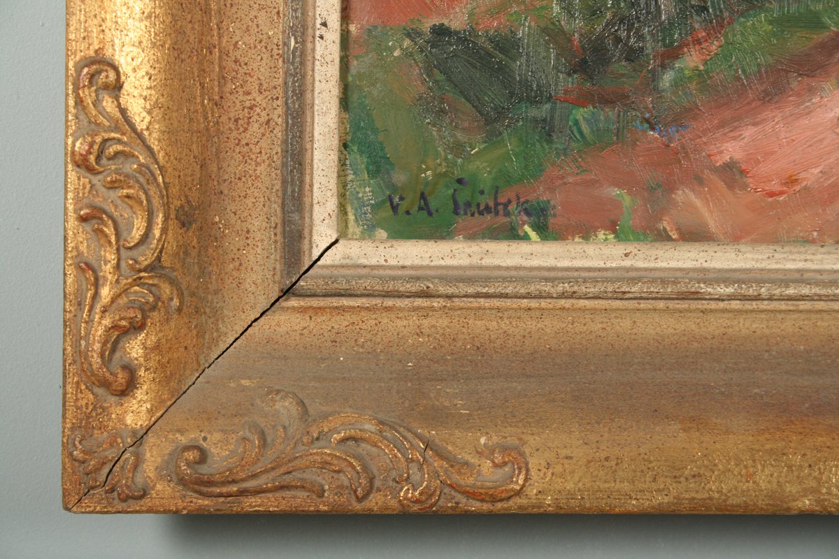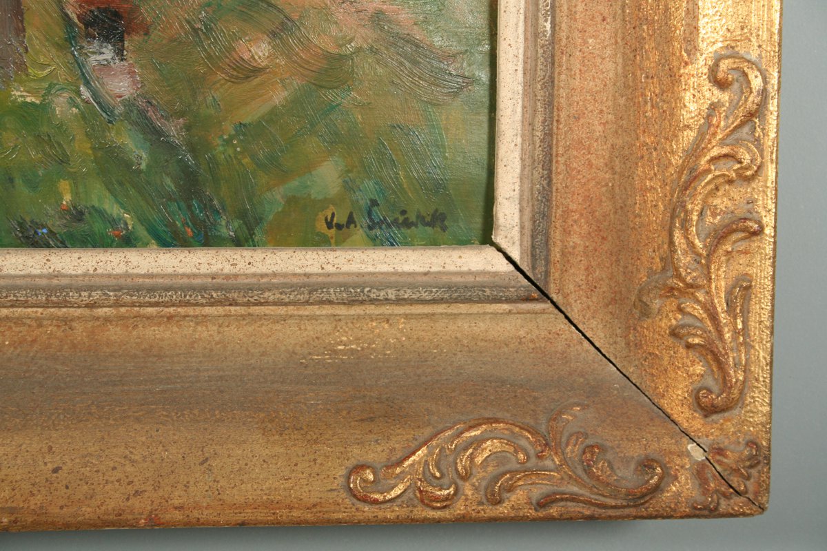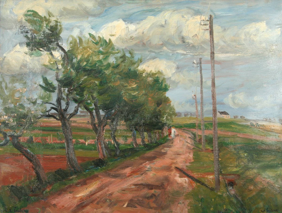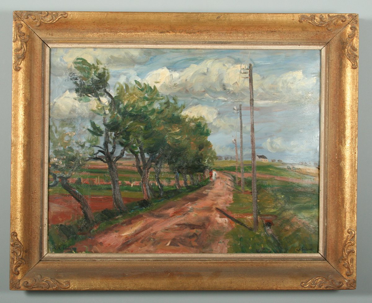 obraz krajiny s cestou lemovanou stromy a sloupy telefoního vedení v pozadí figurální stafáž, olej na lepence, 49 x 65 cm, s rámem 65 x 81 cm, autor Václav Alois Šrůtek, podepsáno vlevo i vpravo dole V. A. Šrůtek, rámováno v půvpdním zdobeném rámu