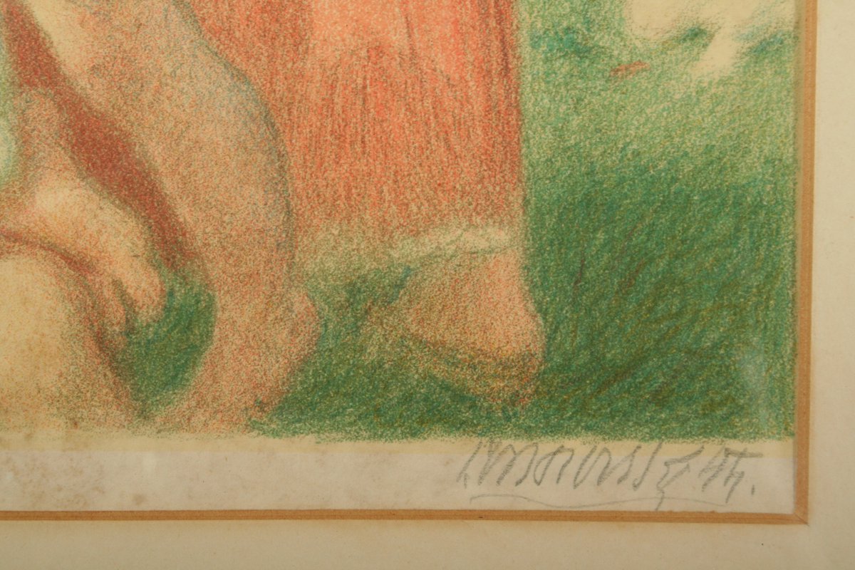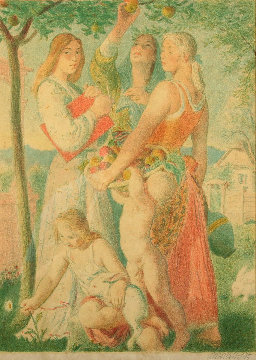 dívky česající ovoce, barevná litografie na papíře, 36 x 25 cm s rámem 58 x 45 cm, autor Jakub Obrovský, podepsáno vpravo dole tužkou J. Obrovský 44, rámováno v původní paspartě a rámu