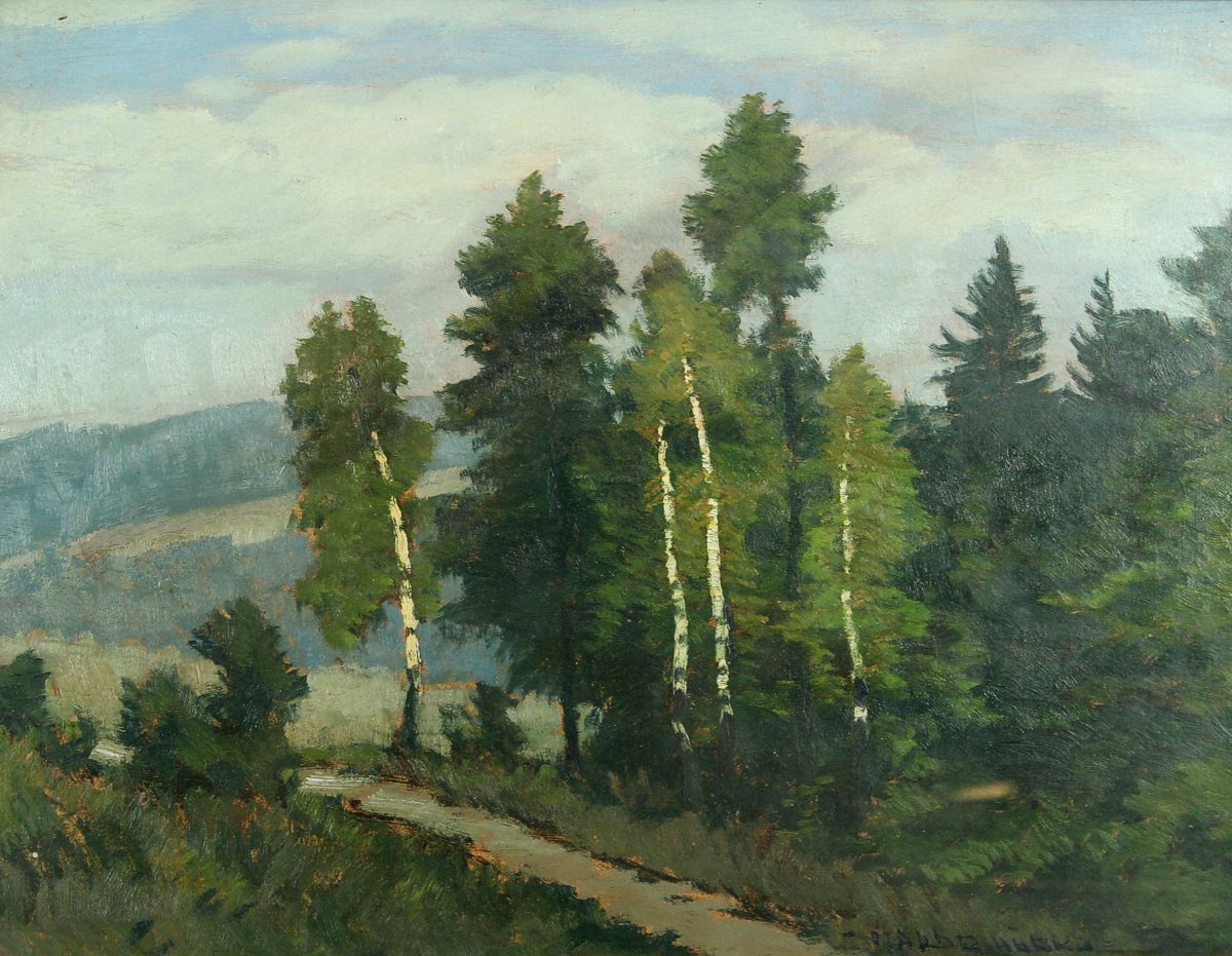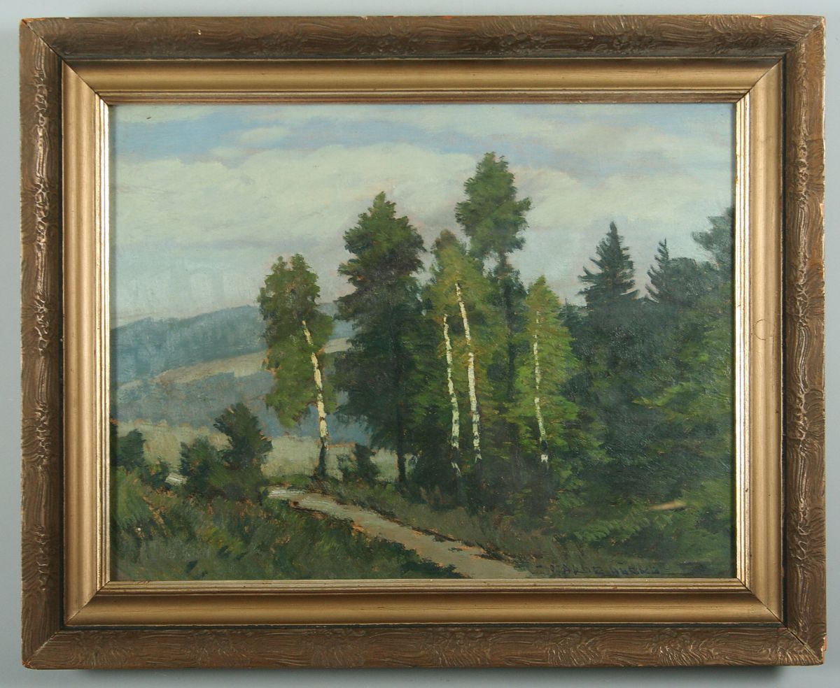 obraz letní krajiny s břízkami a cestou, olej na kartonu, 34 x 45 cm, s rámem 46 x 57 cm, autor Otakar Hůrka, obraz zachycující krajinu v koloritu a výrazu jeho učitele A. Kalvody, podepsáno vpravo dole Otakar Hůrka, rámováno pod sklem