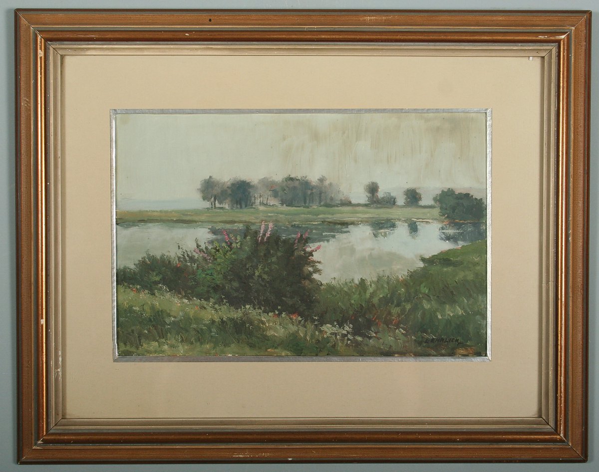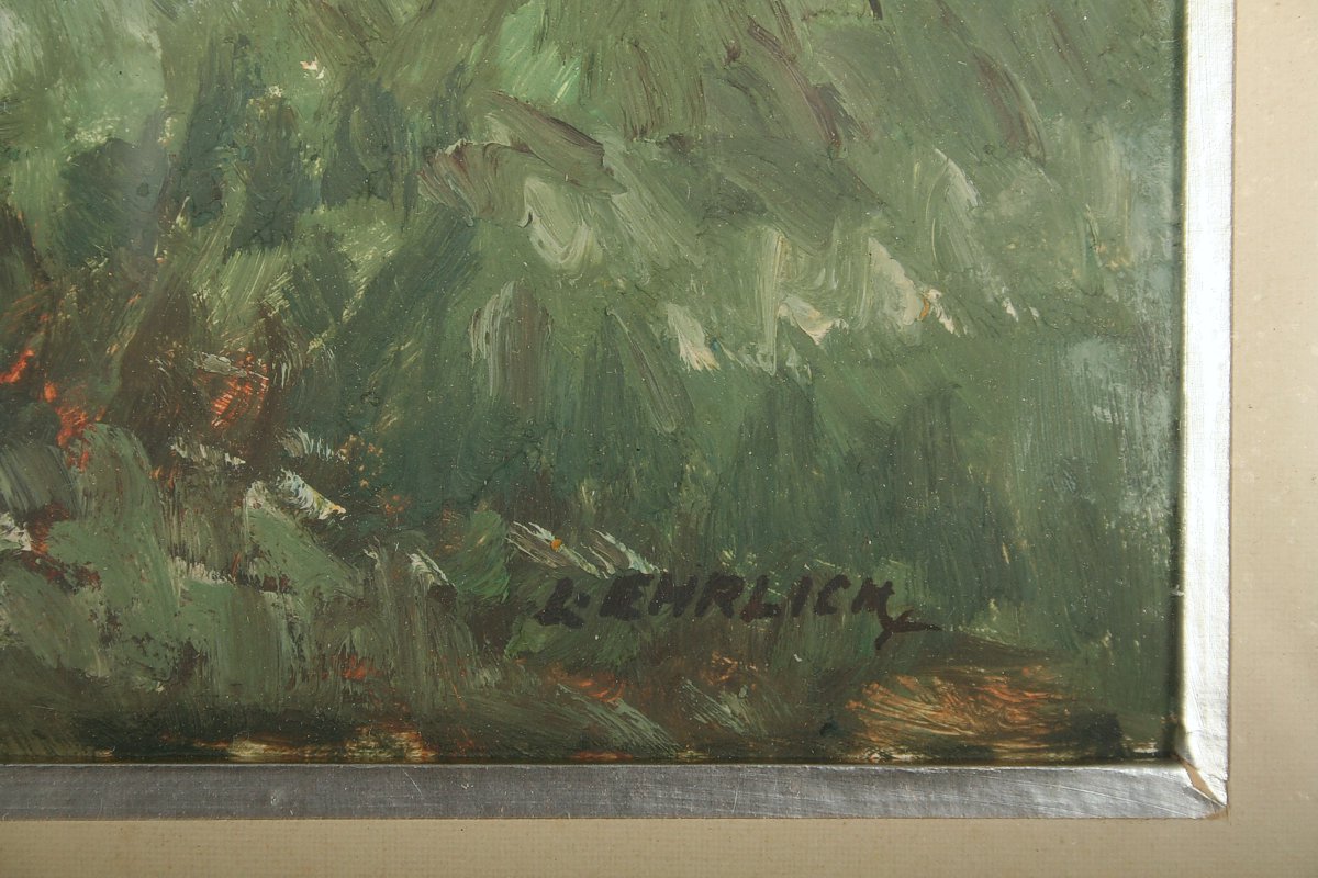 obraz krajina s rozkvetlým keřem v pozadí rybník u Kardašovi Řečice, olej na lepence, 19,5 x 29,5 cm s rámem 37 x 47 cm, autor Láďa Ehrlich, podepsáno vpravo dole L. Ehrlich, na zadní straně ateliérové razítko a přípis s dedikací, rámováno v původním rámu a paspartě pod sklem