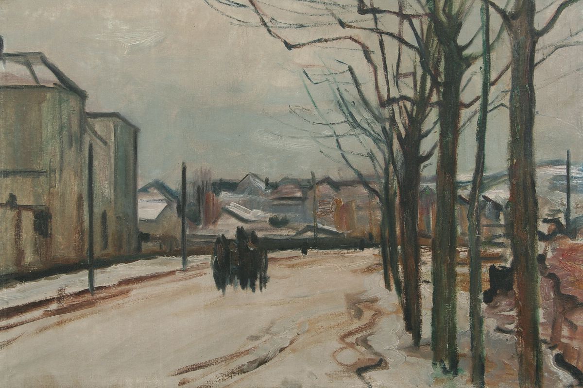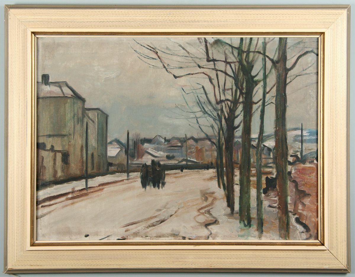 cesta s koňským povozem v Náchodě za ekonomickou školou u Metuje, olej na plátně, ve výřezu 48 x 68 cm s rámem 64 x 84 cm, autor Emil Tylš, podepsáno vzadu s dedikací Emil Tylš Náchod Slezník 1947, rámováno