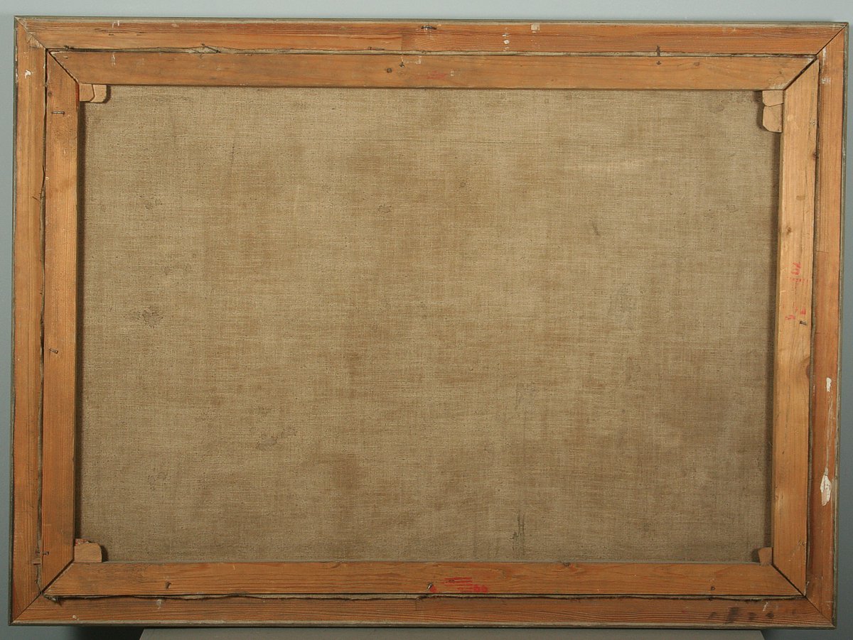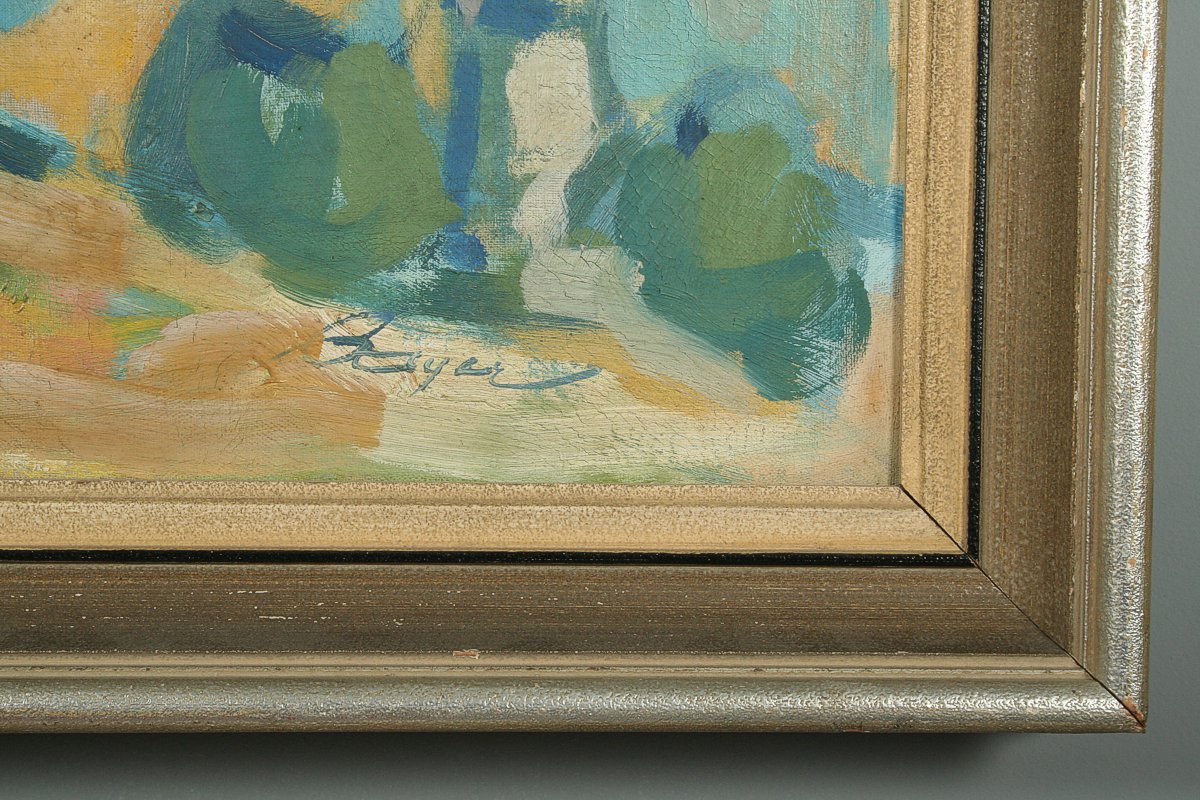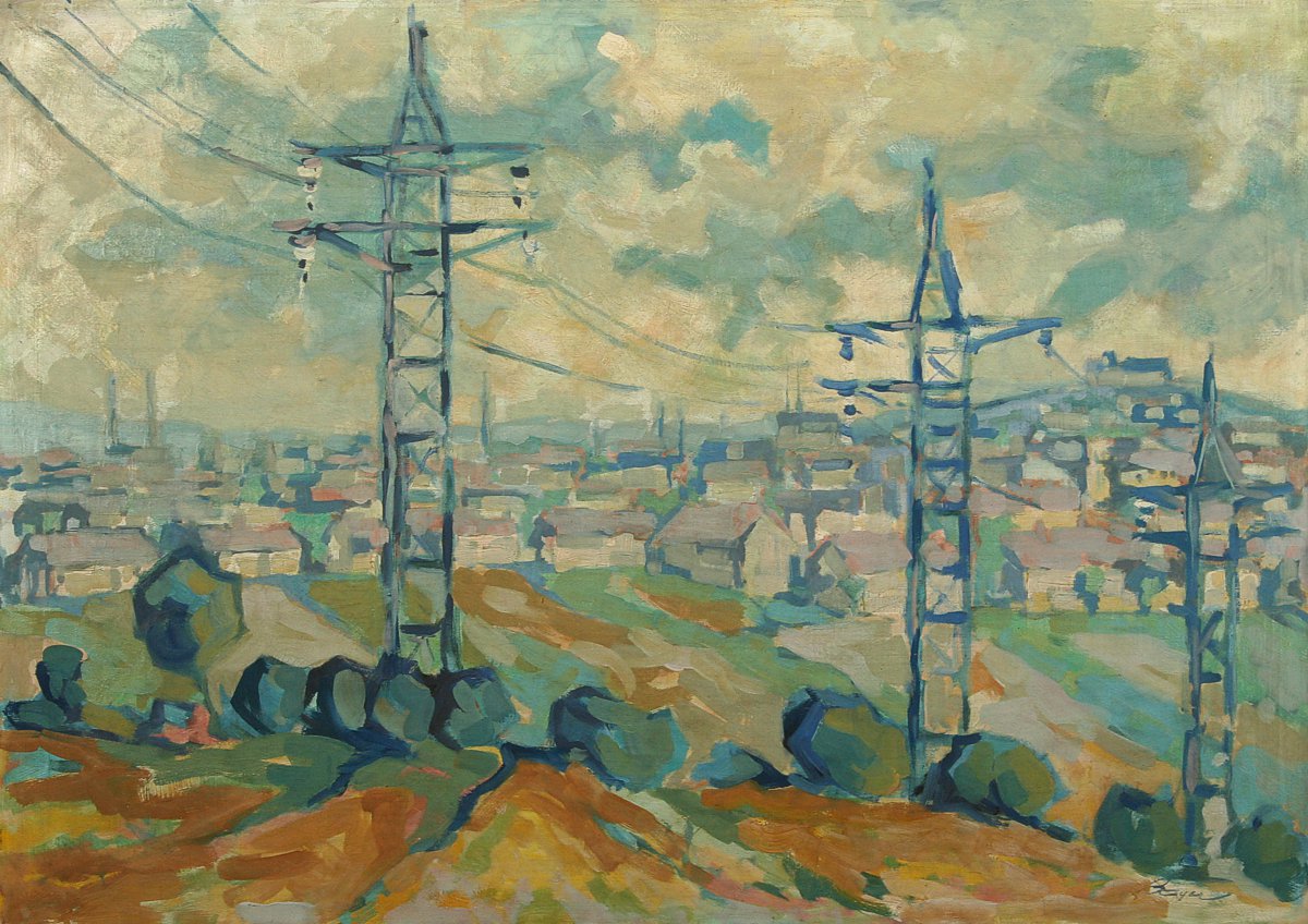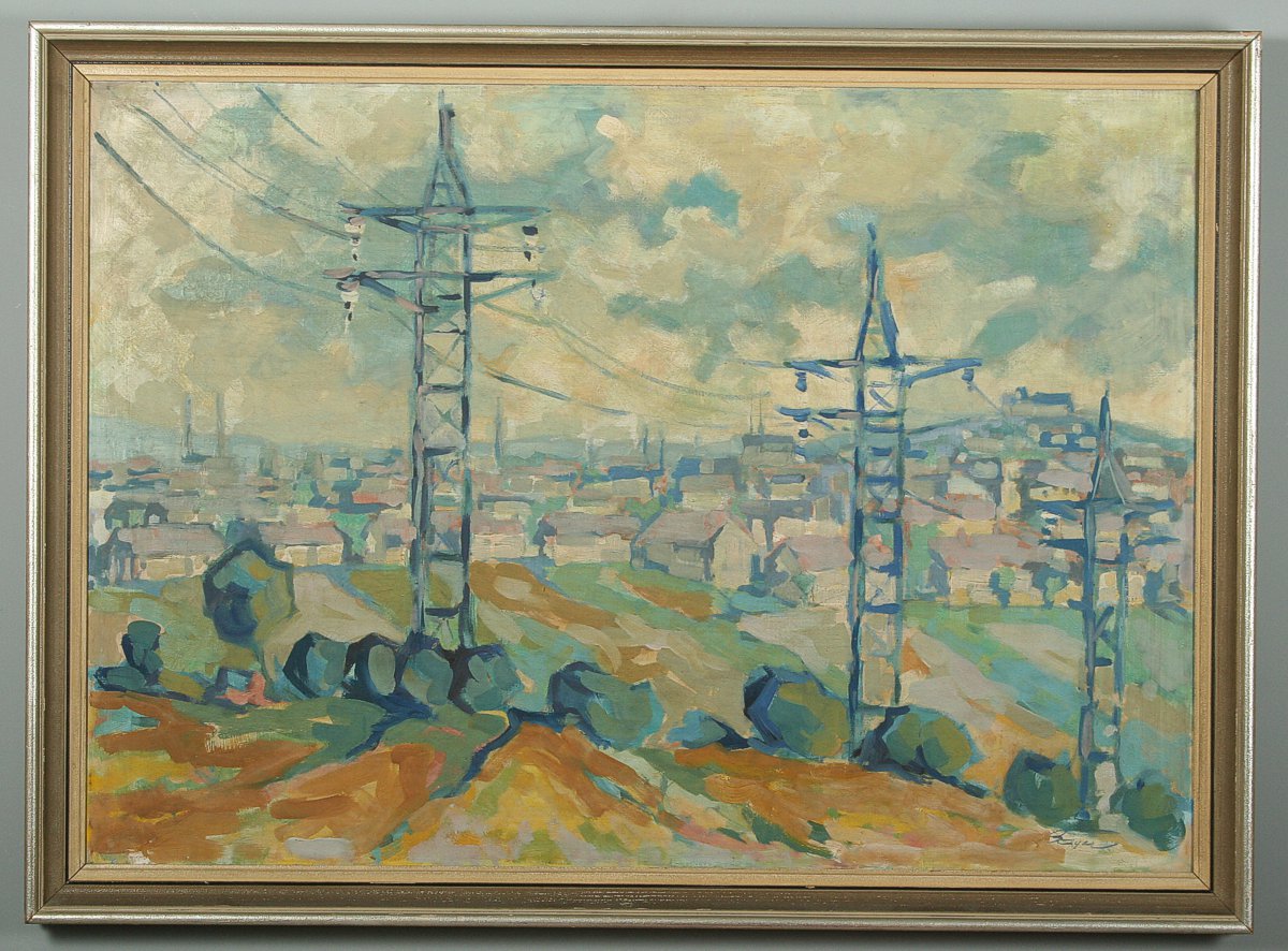 obraz krajiny s vedením vysokého napětí a městem Brnem v pozadí, olej na plátně 70 x 100 cm s rámem 90 x 120 cm, autor Bayer, podepsáno vpravo dole Bayer, rámováno v původním rámu