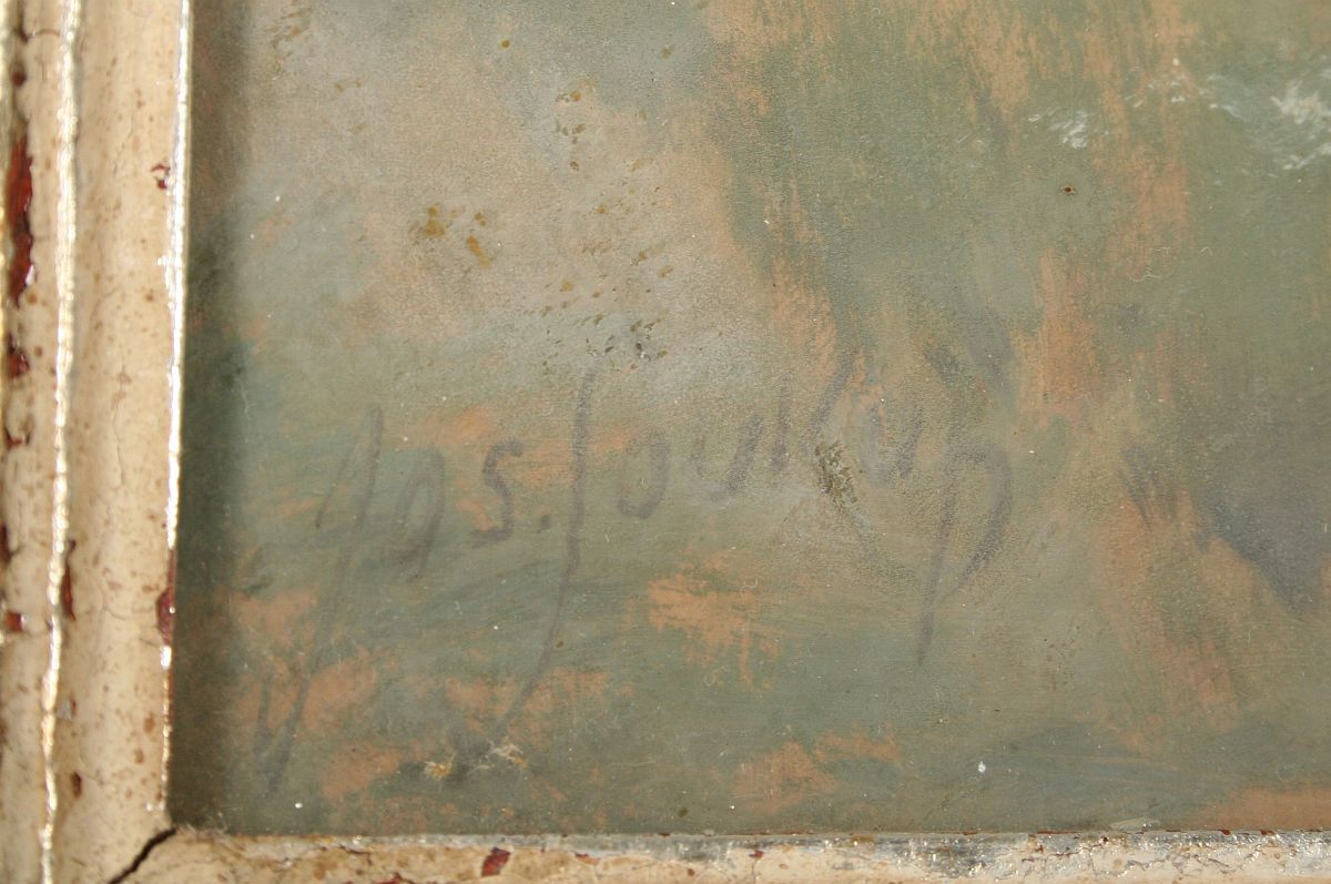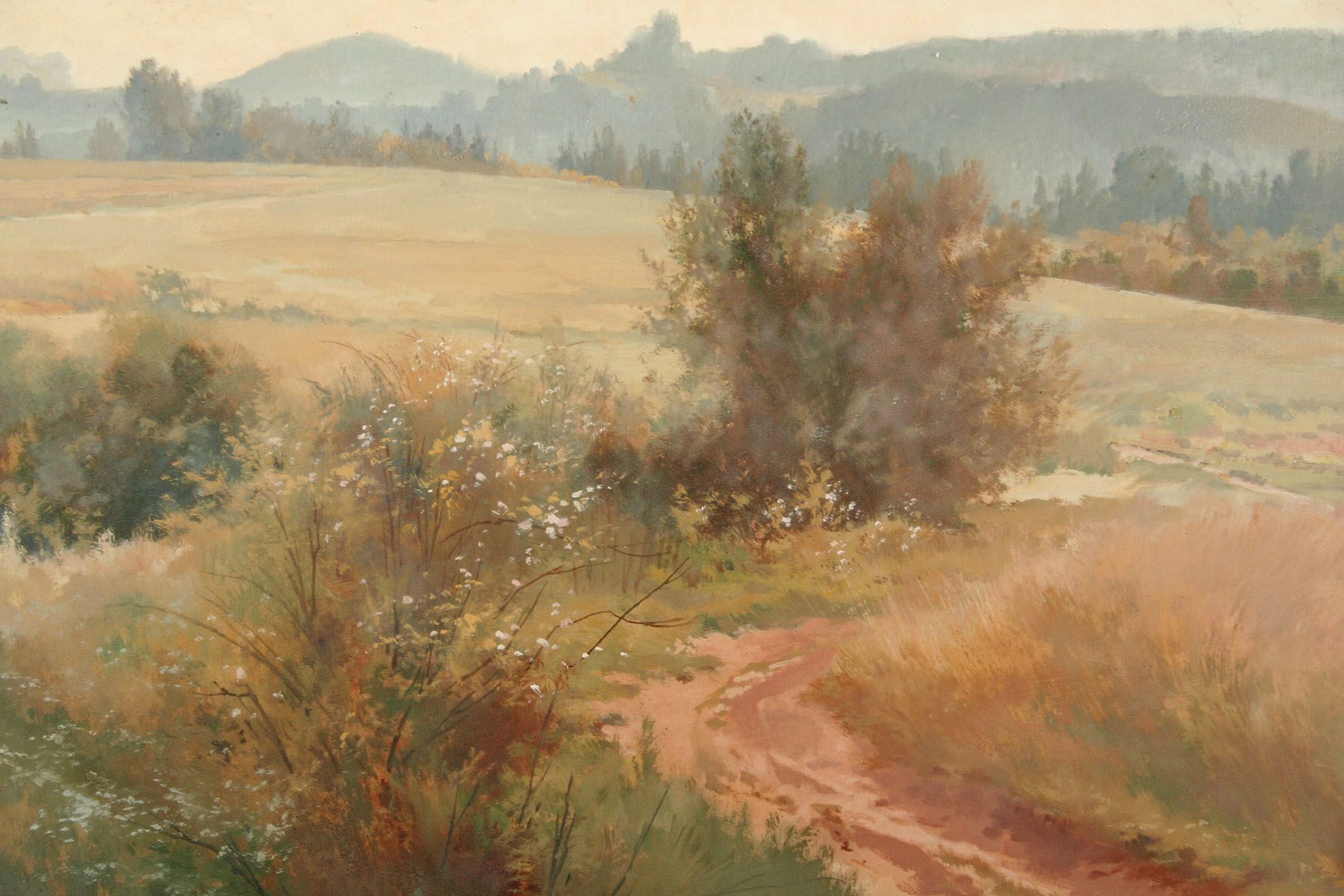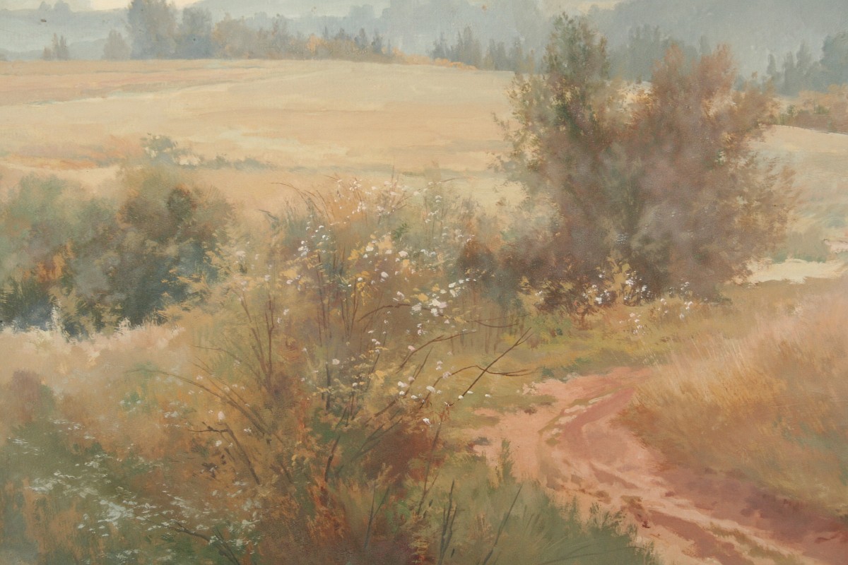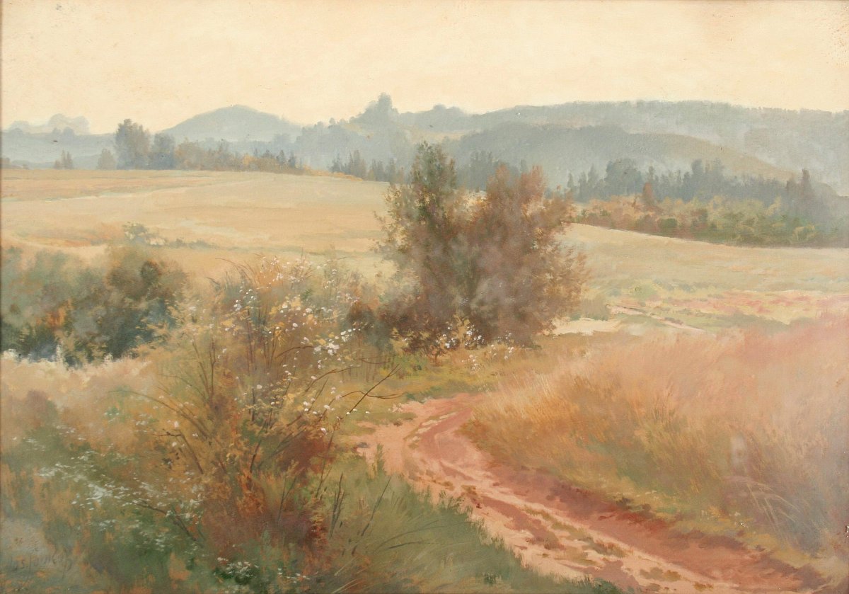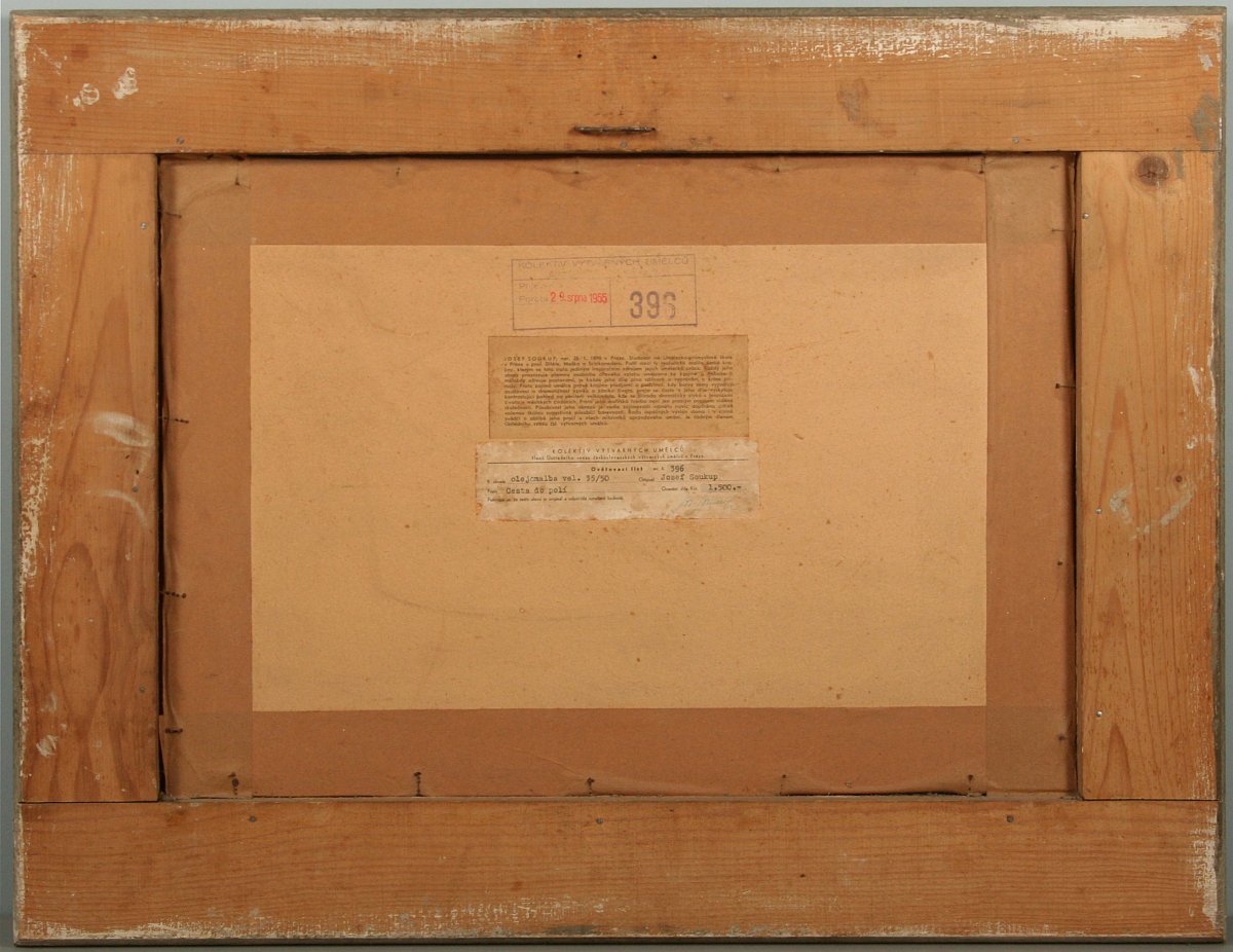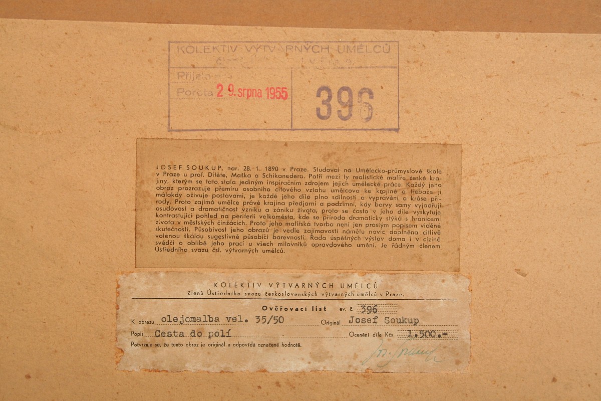 obraz krajiny s vysokým horizontem, rozkvetlým keřem a cestou do polí, olej na kartonu 35 x 50 cm, s rámem 51 x 67 cm, autor Josef Soukup, podepsáno vlevo dole Jos. Soukup, na zadní straně atorské štítky a dedikace, zcela původní adjustace