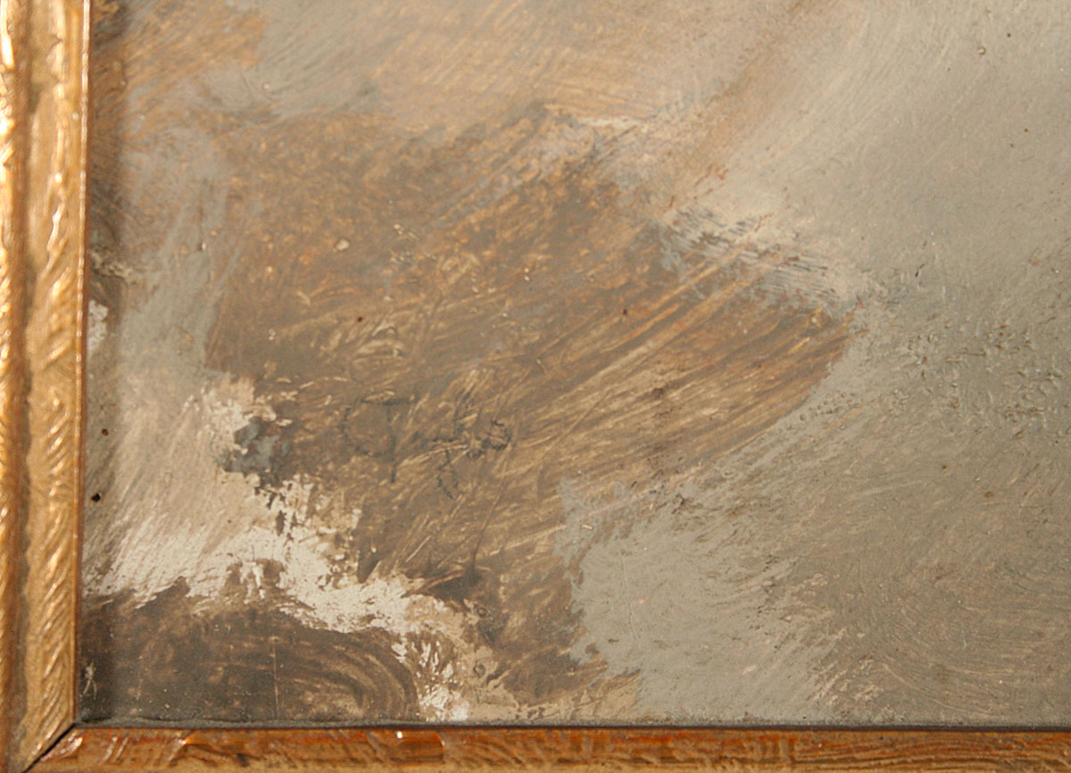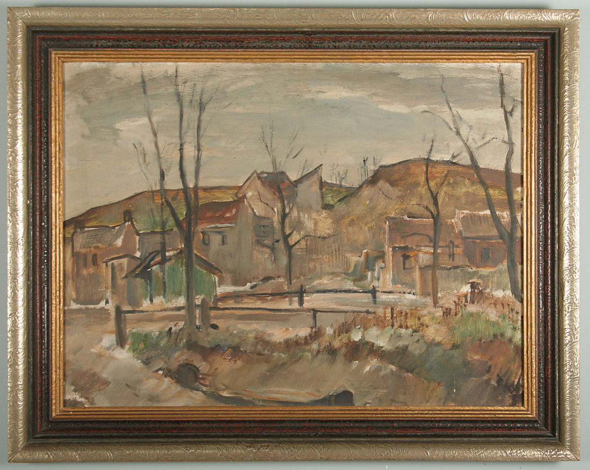 obraz periferie města, olej na kartonu, 48 x 64 cm, s rámem 62 x 78 cm, autor Emil Tylš podepsáno vlevo dole špatně čitelně E. Tylš, rámováno v původním stříbřeném rámu
