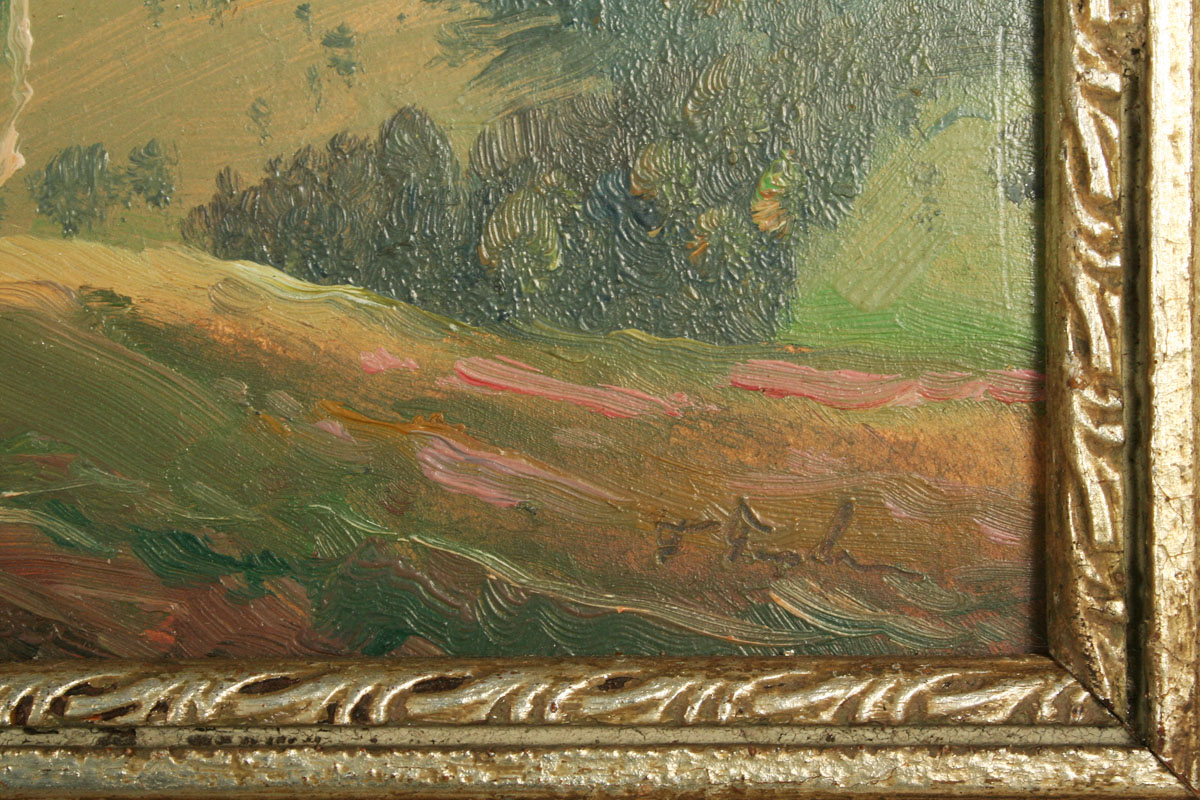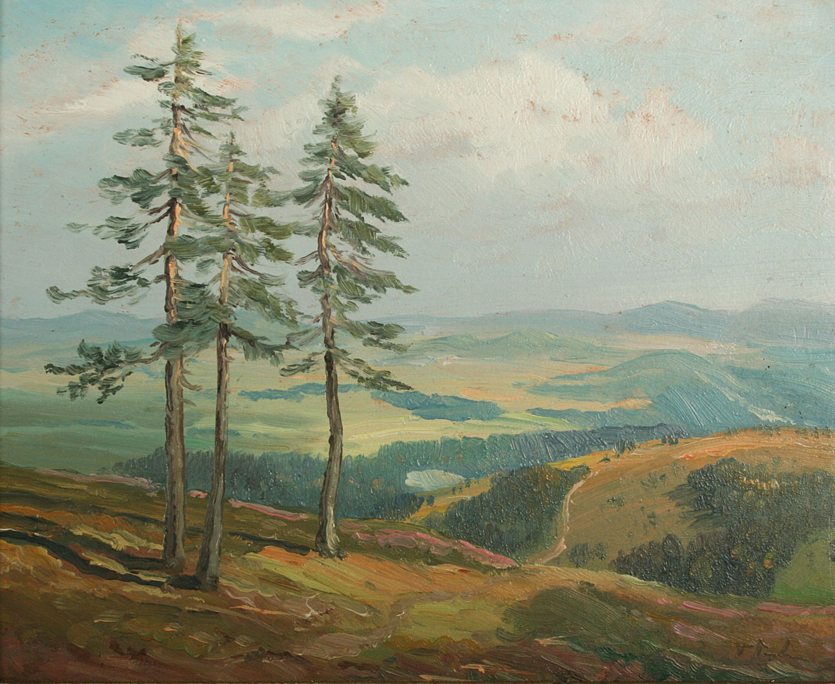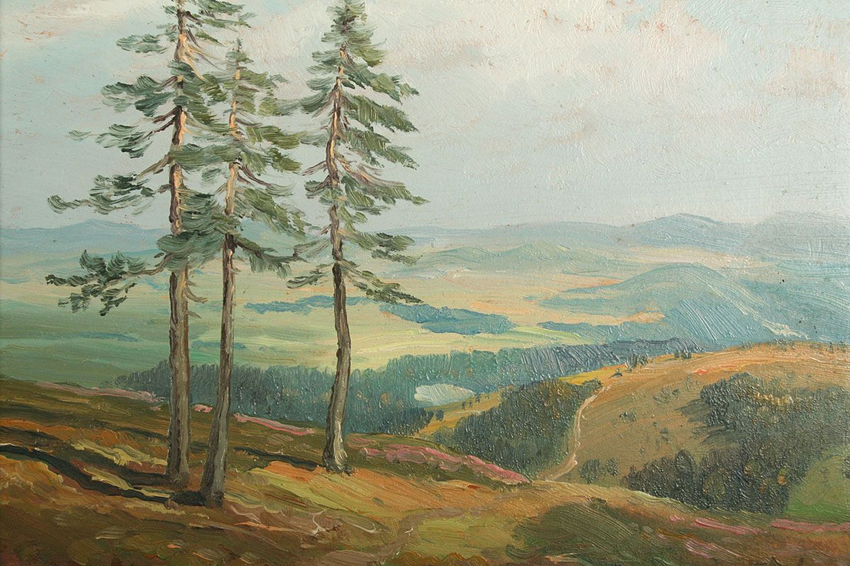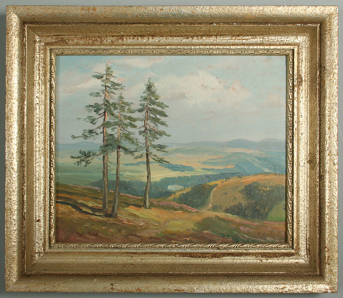 obraz stromů v horách s výhledem do daleké krajiny, olej na kartonu, 24 x 29 cm, s rámem 34 x 39 cm, autor Ferdinand Tásler, podepsáno vpravo dole F. Tásler, rámováno v stříbřeném rámu