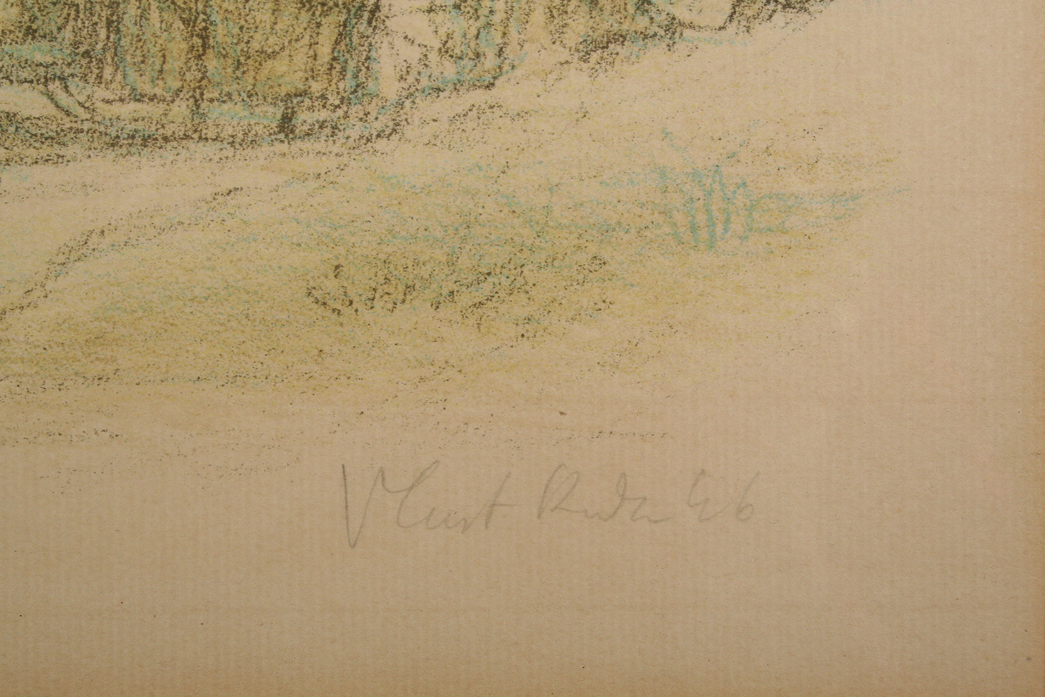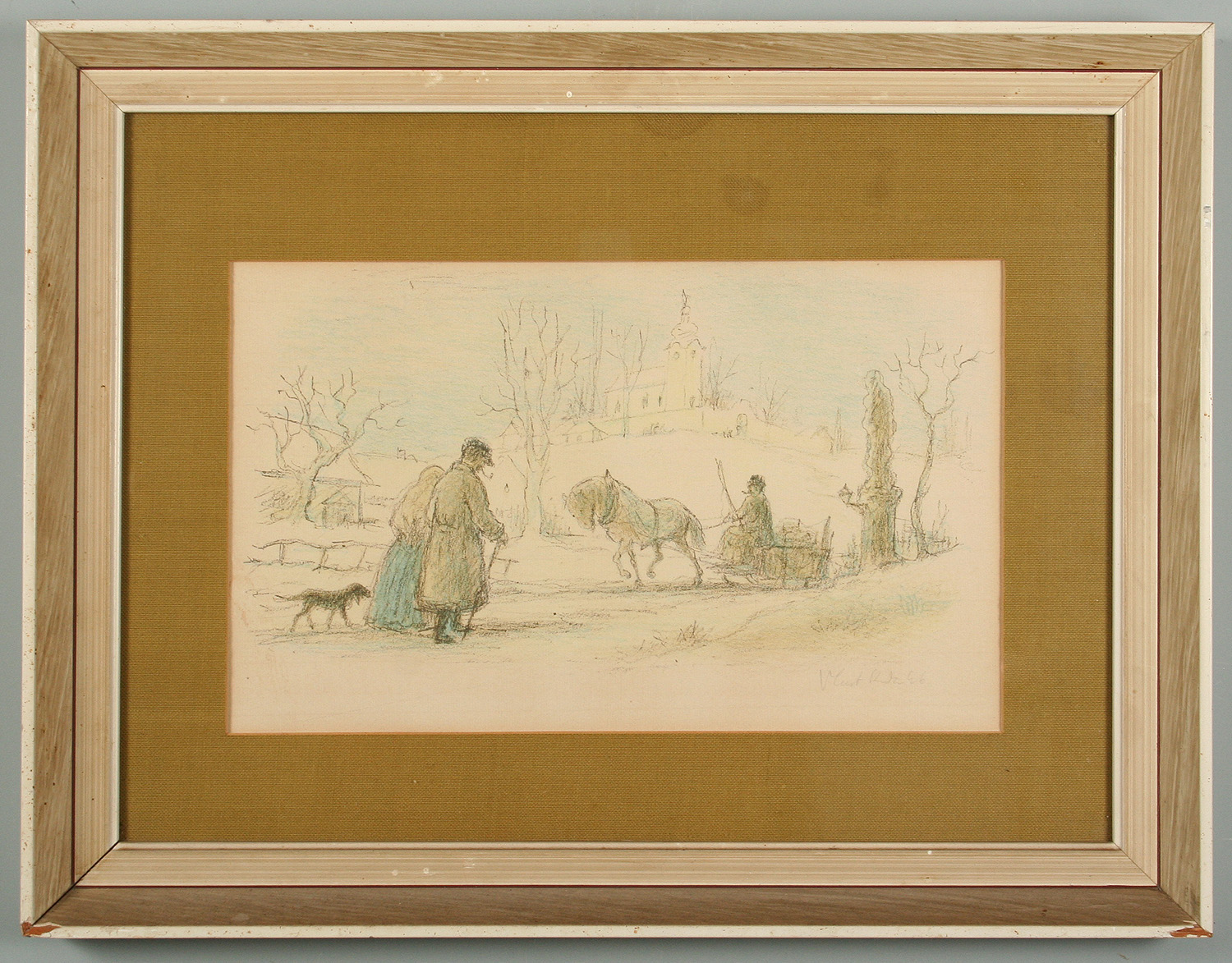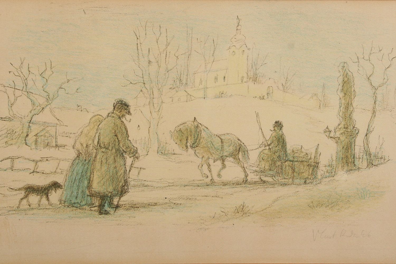 zimní procházka pod kostelíkem, barevná litografie na papíře, ve výřezu 24 x 38 cm, s rámem 45 x 58 cm, autor Vlastimil Rada, podepsáno vpravo dole tužkou Vlast. Rada 46, rámováno v původní paspartě a rámu pod sklem