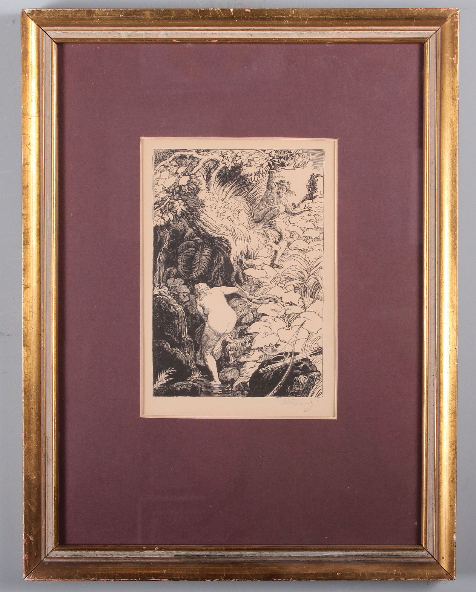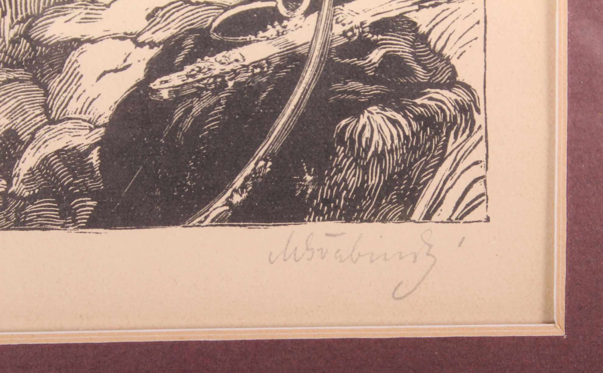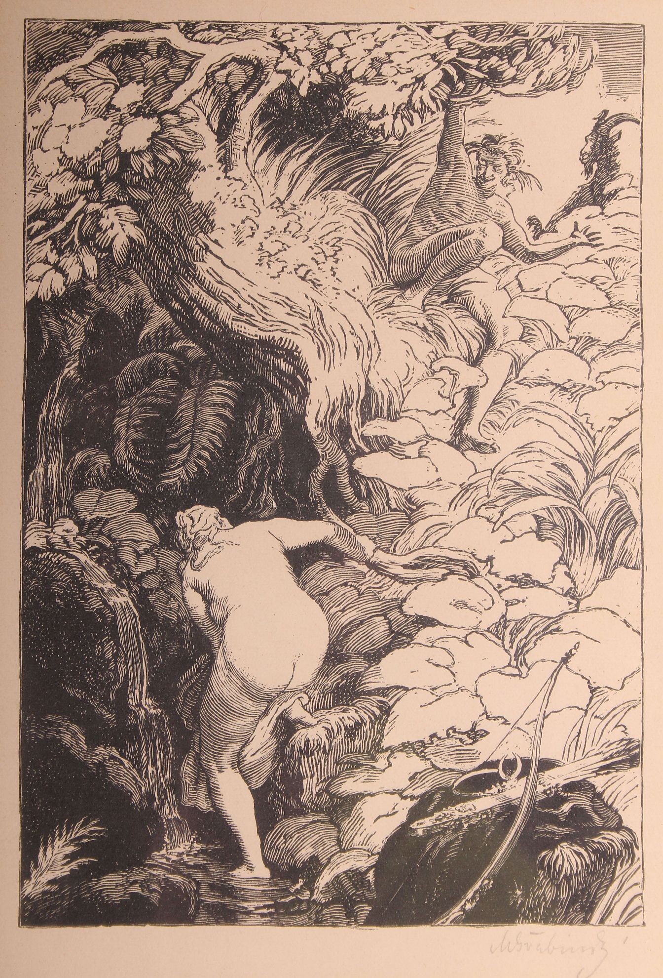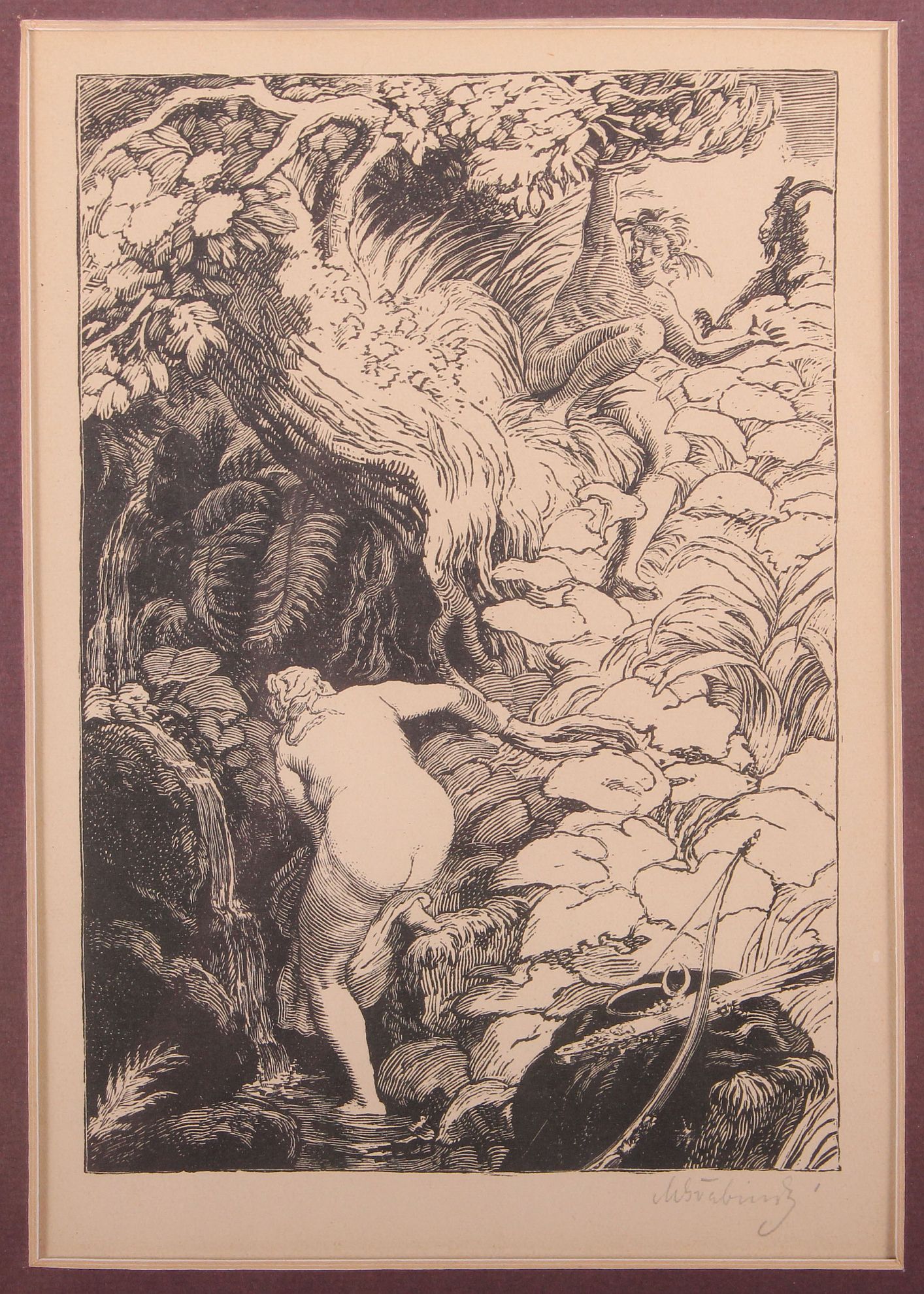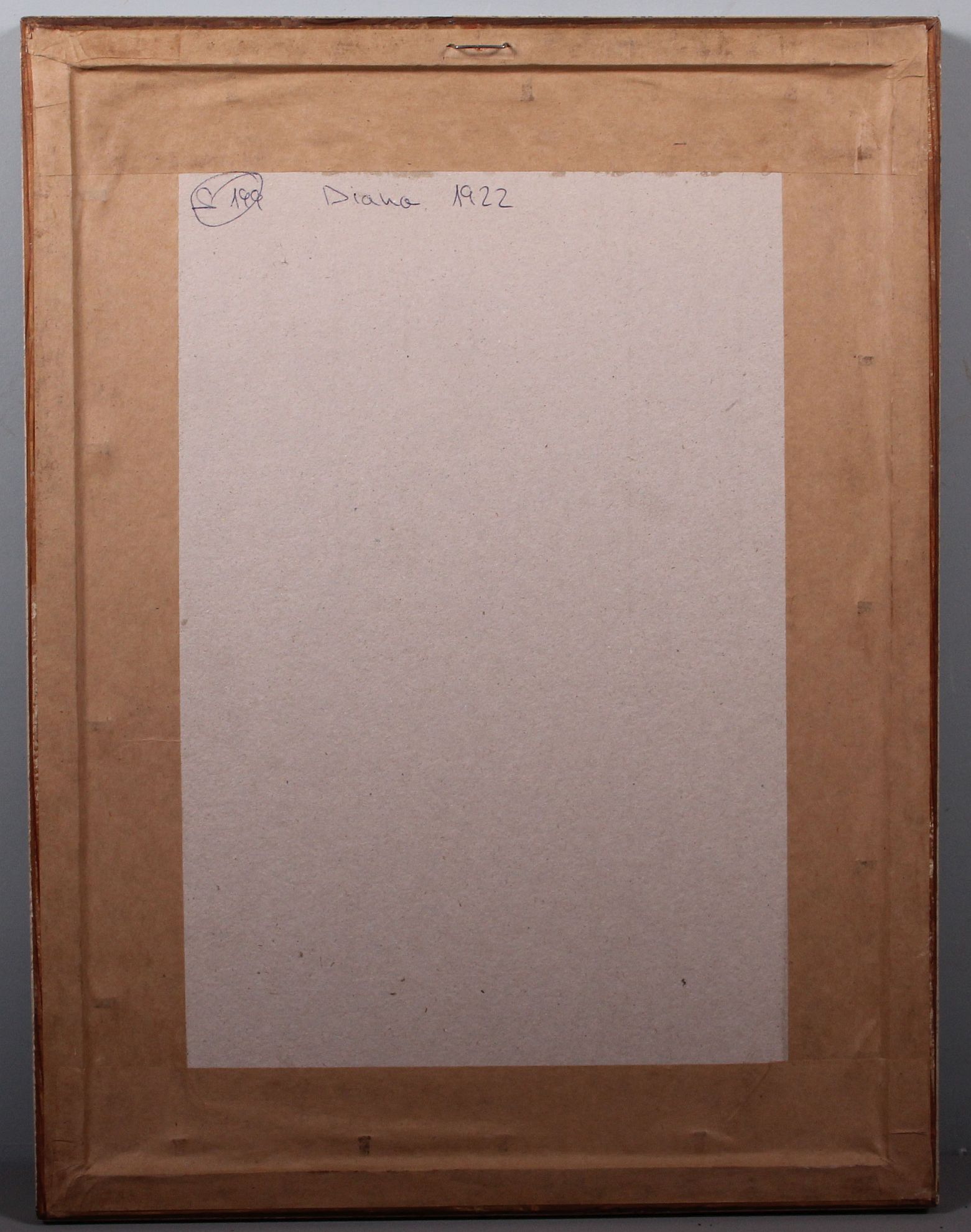 Diana, dřevořez na papíře, rozměr tiskové plochy bez okraje cca 12 x 18 cm celkový 41 x 31, autor Max Švabinský, z roku 1922 dle soupisu číslo 199, podepsáno vprvo dole tužkou M Švabinský, rámováno v paspartě pod sklem