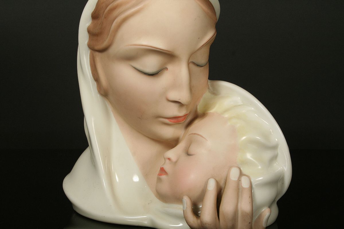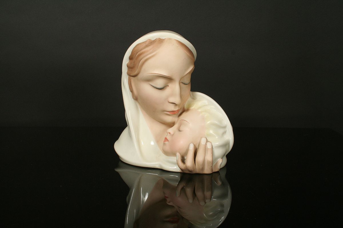 stylizované sousoší matky s dítkem v pěkném provedení art deco z 20-30. let 20. století, značeno uměleckou značkou na dně Březová Pirkenhammer, na straně u podstavy značen autor plastiky W. Fritsch, malovaný a částečně glazovaný porcelán, tělové barvy, 24 x 24 cm