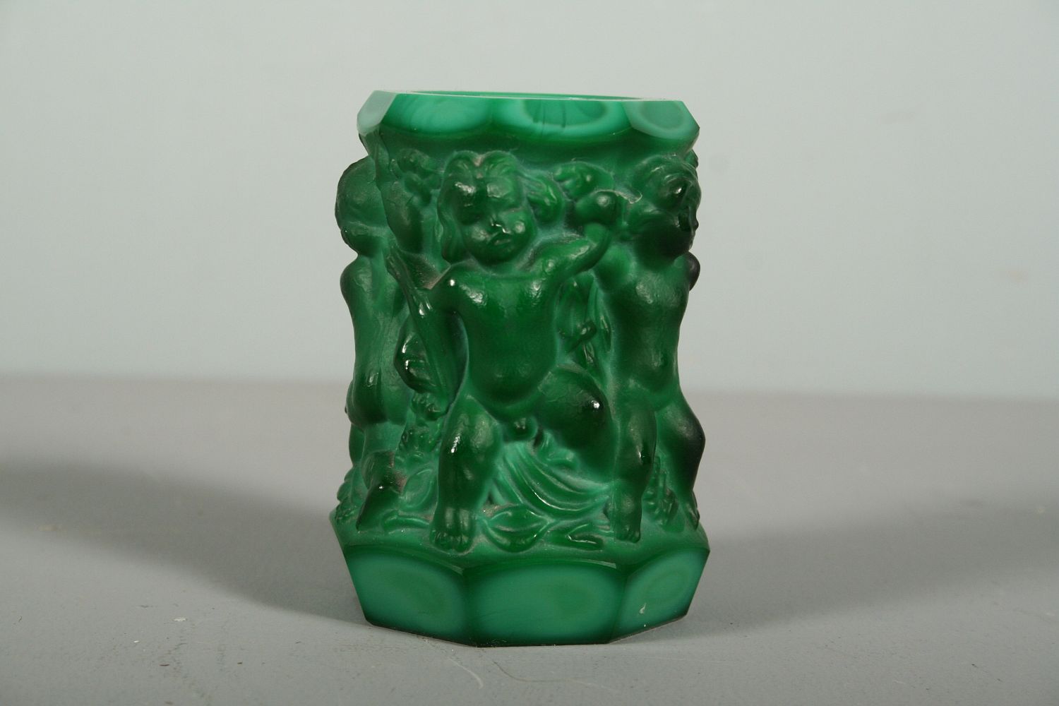 figurální vázička s motivem bakchanálie ve stylu art deco, lisované a broušené malachitové sklo, neznačené, produkce firmy Curt Schlevogt Jablonec nad Nisou, 1. polovina 20. století, 9 cm