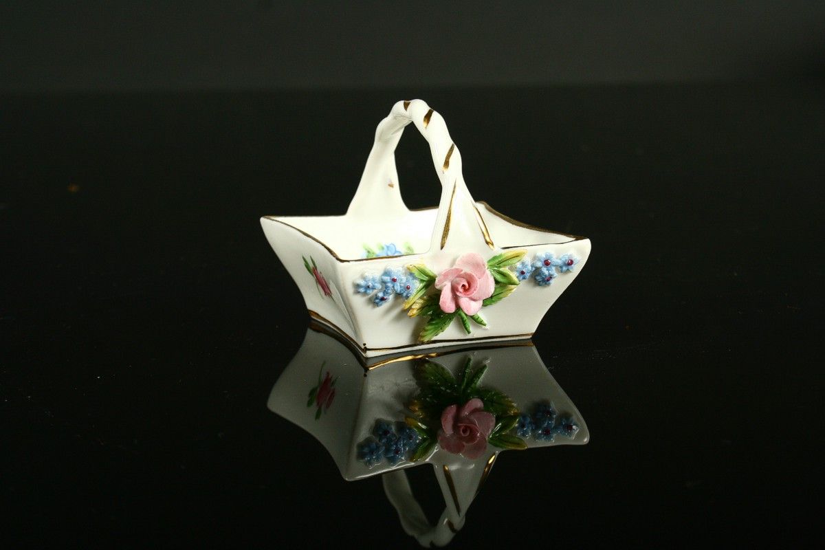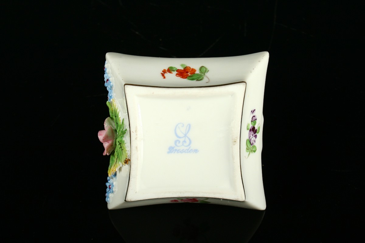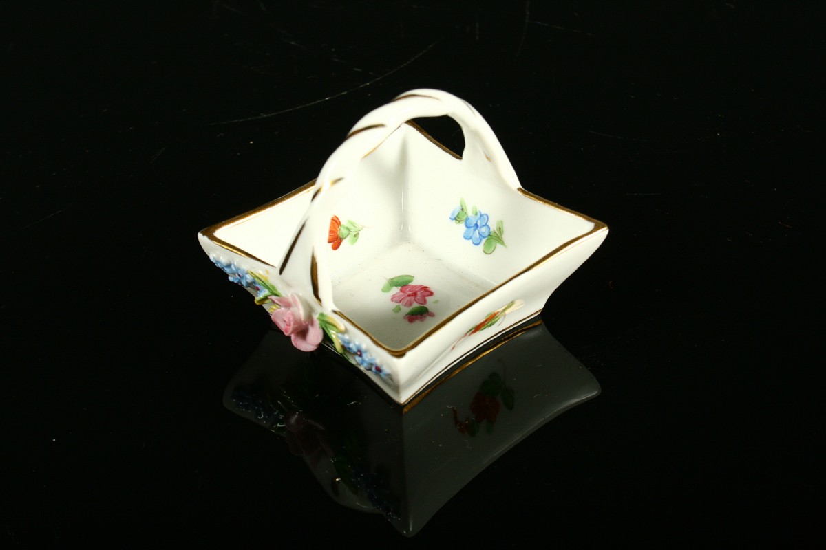 porcelánový košíček s květy a uchem, malovaný bílý porcelán s plastickými nálepy tvaru květin a zlacenými detaily, značeno tištěnou značkou Drážďany, 5 x 5,5 cm