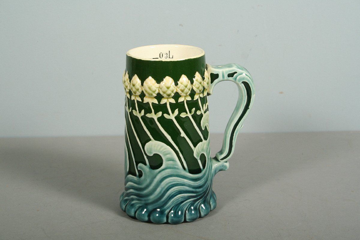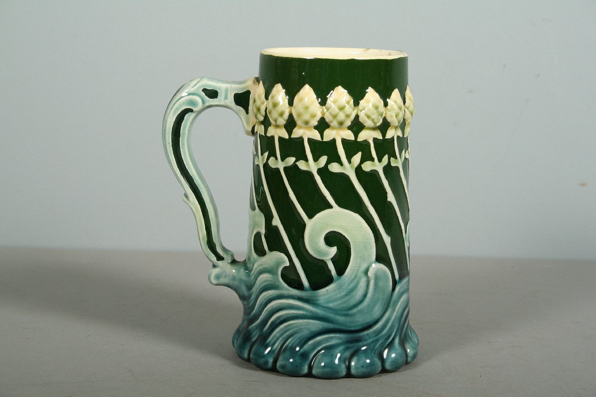 keramický secesní korbel s ryskou 0,3 L, fajánsová keramika malovaná, reliéfní detaily v secesním stylu, počátek 20. století, značeno na dně nečitelně, 15 cm