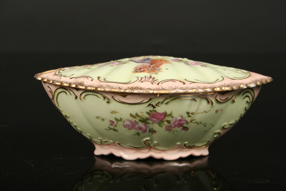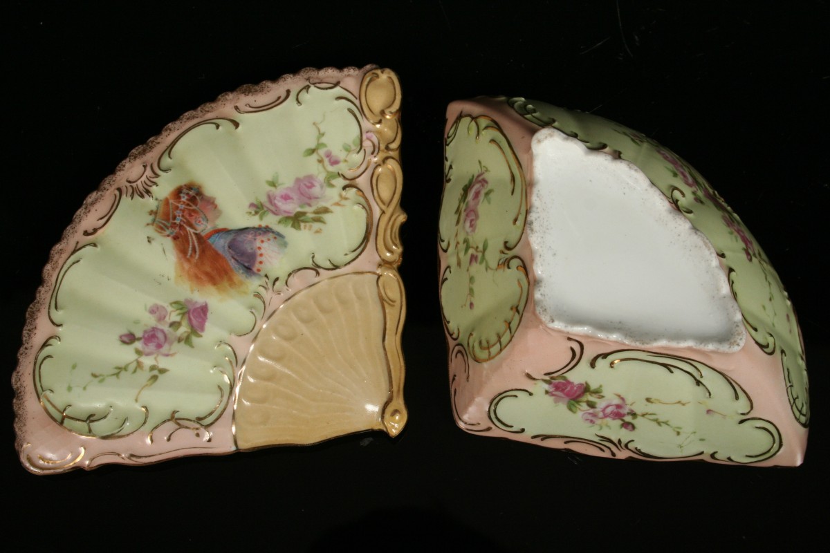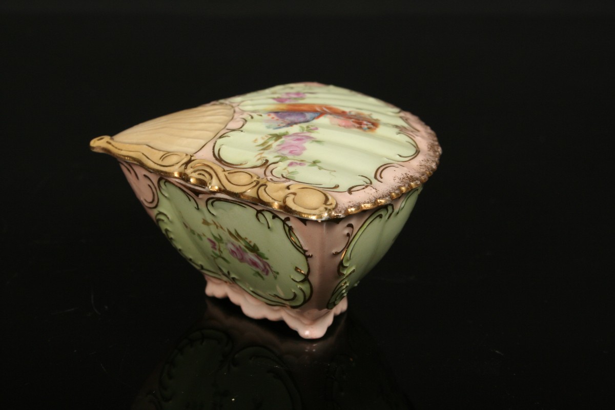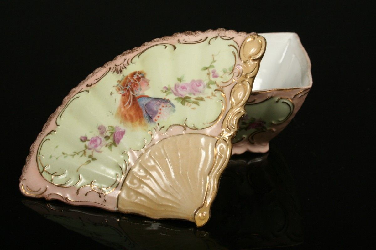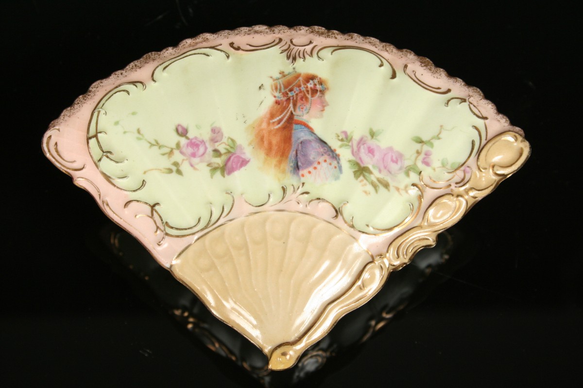 porcelánová dóza ve tvaru vějíře plasticky zdobená s motivem princezny s korunkou, bílý porcelán, zlacený , neznačený, 6 x 15 x 11 cm