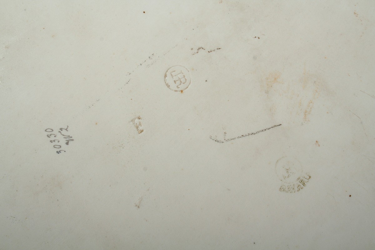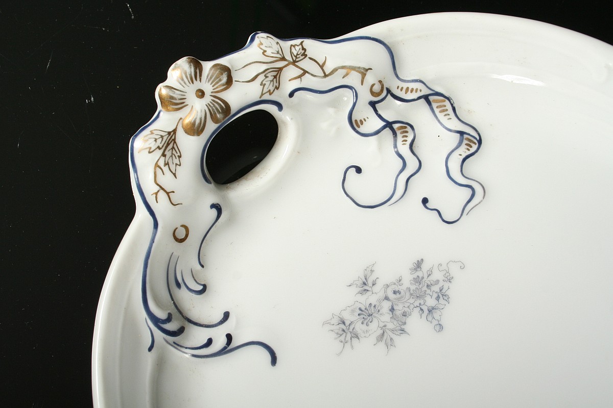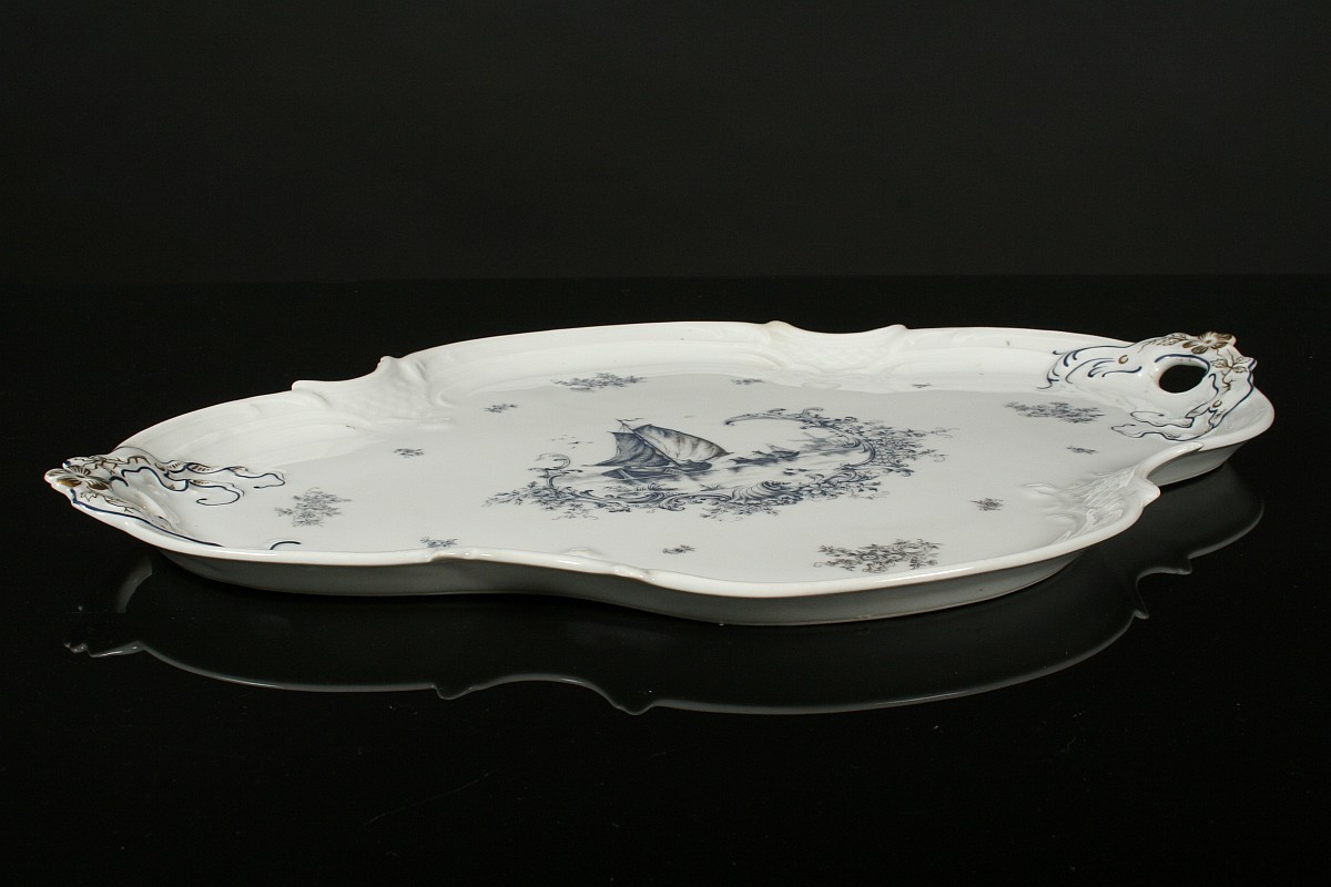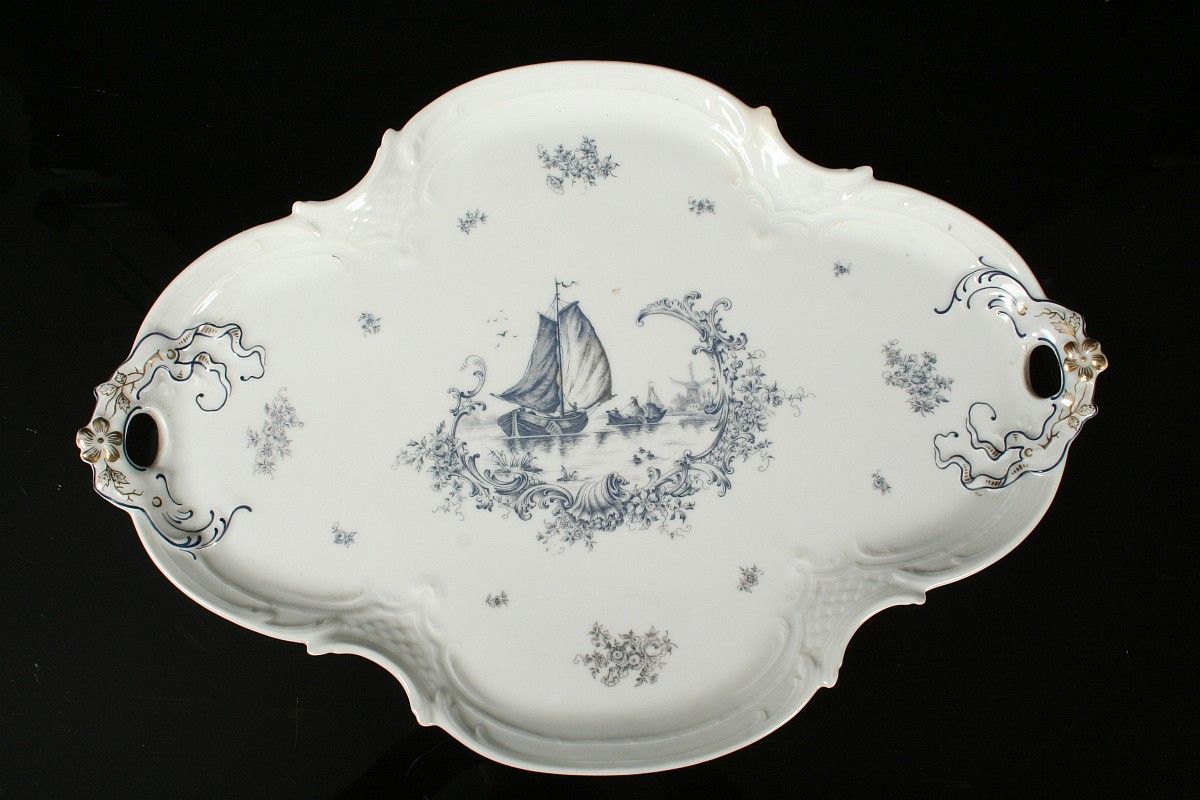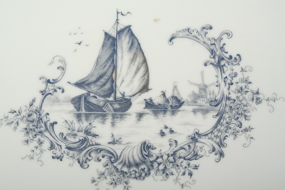 velký porcelánový podnos s holandským motivem plachetnic a větrných mlýnů, bílý glasovaný porcelán po obvodu tvarovaný, značený na dně tištěnou a tlačenou značkou, 47 x 34 cm