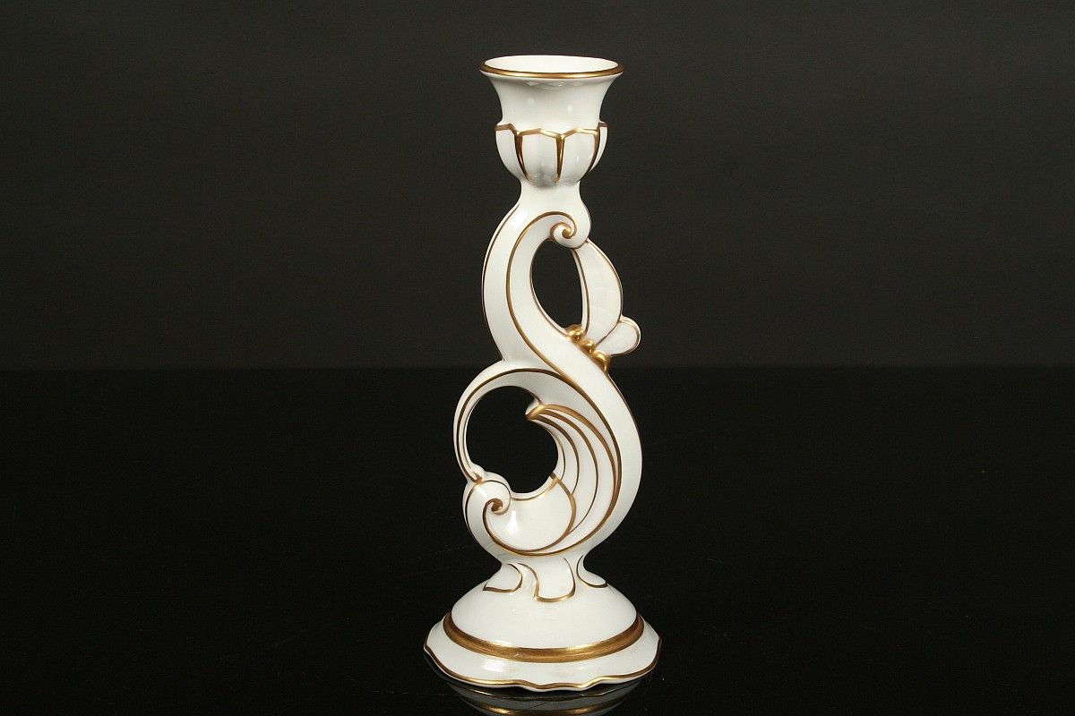 jednoplamenný porcelánový svícen ve stylu art deco, bílý glazovaný porcelán, zlacené detaily, značený tištěnou značkou Pirkenhammer umělecký návrh, 22 cm