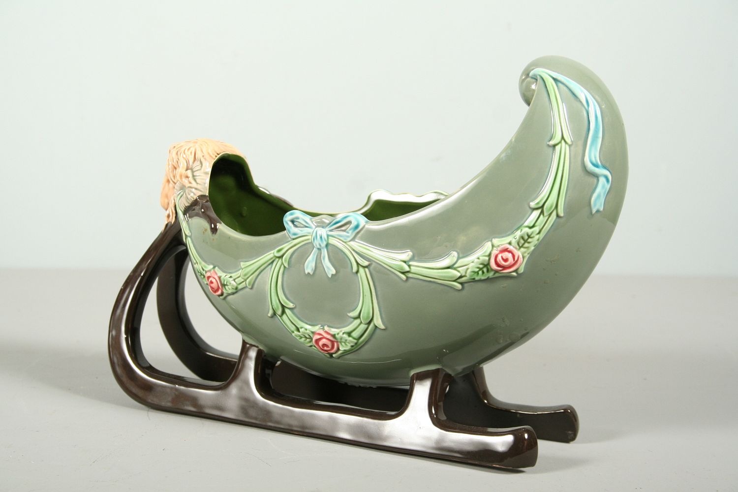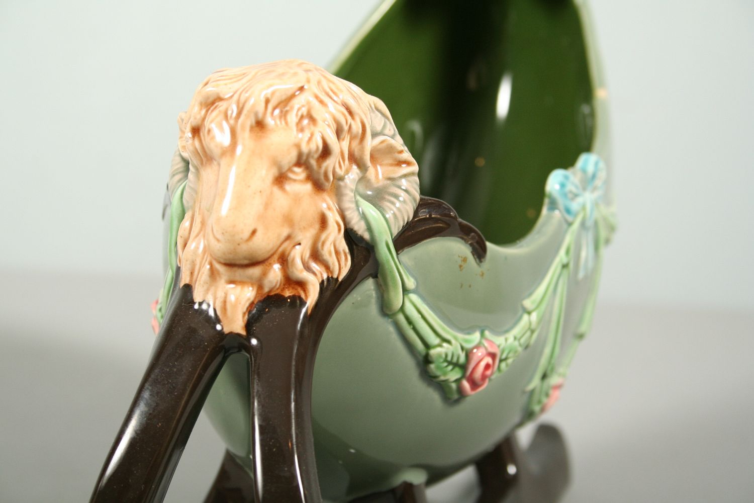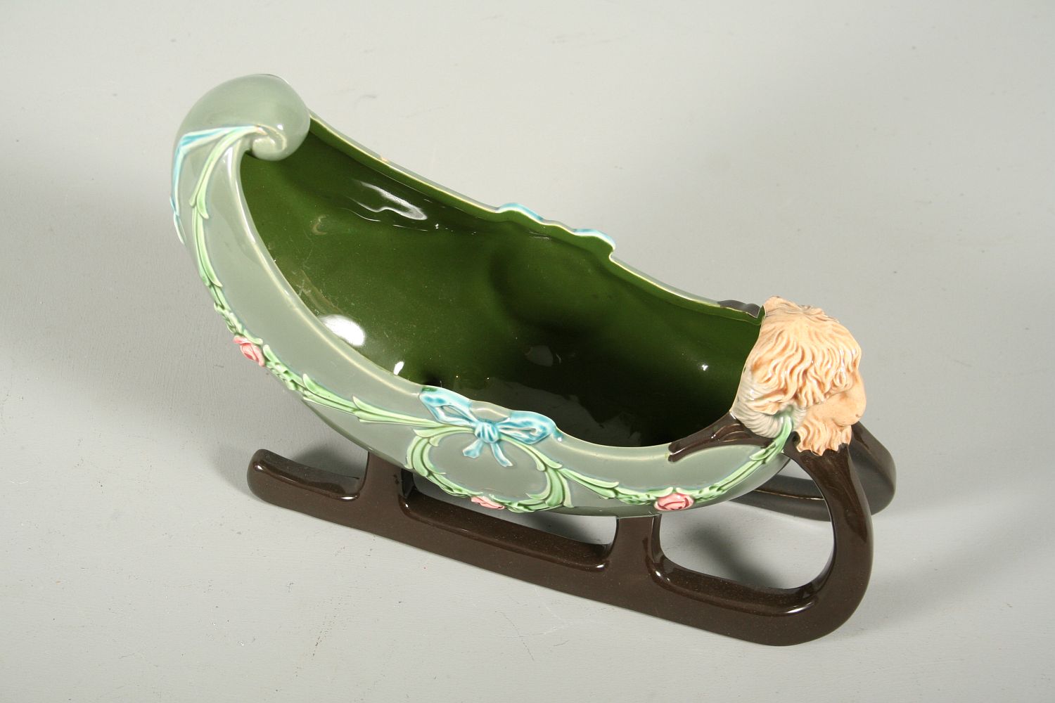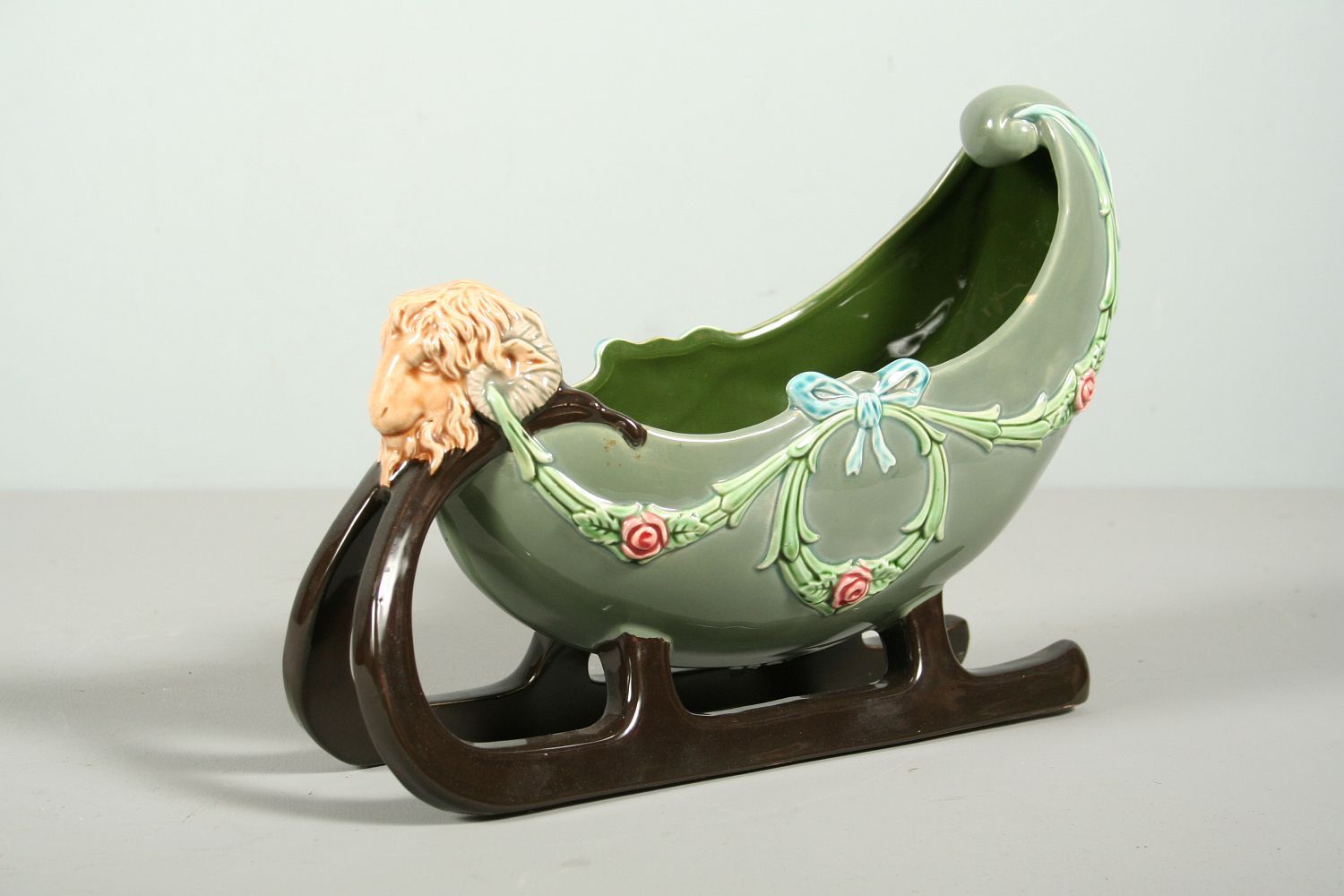 mísa na ovoce sáňky s hlavou berana, glazovaná keramika plasticky dekorovaná, výška 21 cm a délka 28 cm, na dně tlačená čísla 7568 a tlačená značka Eichwald