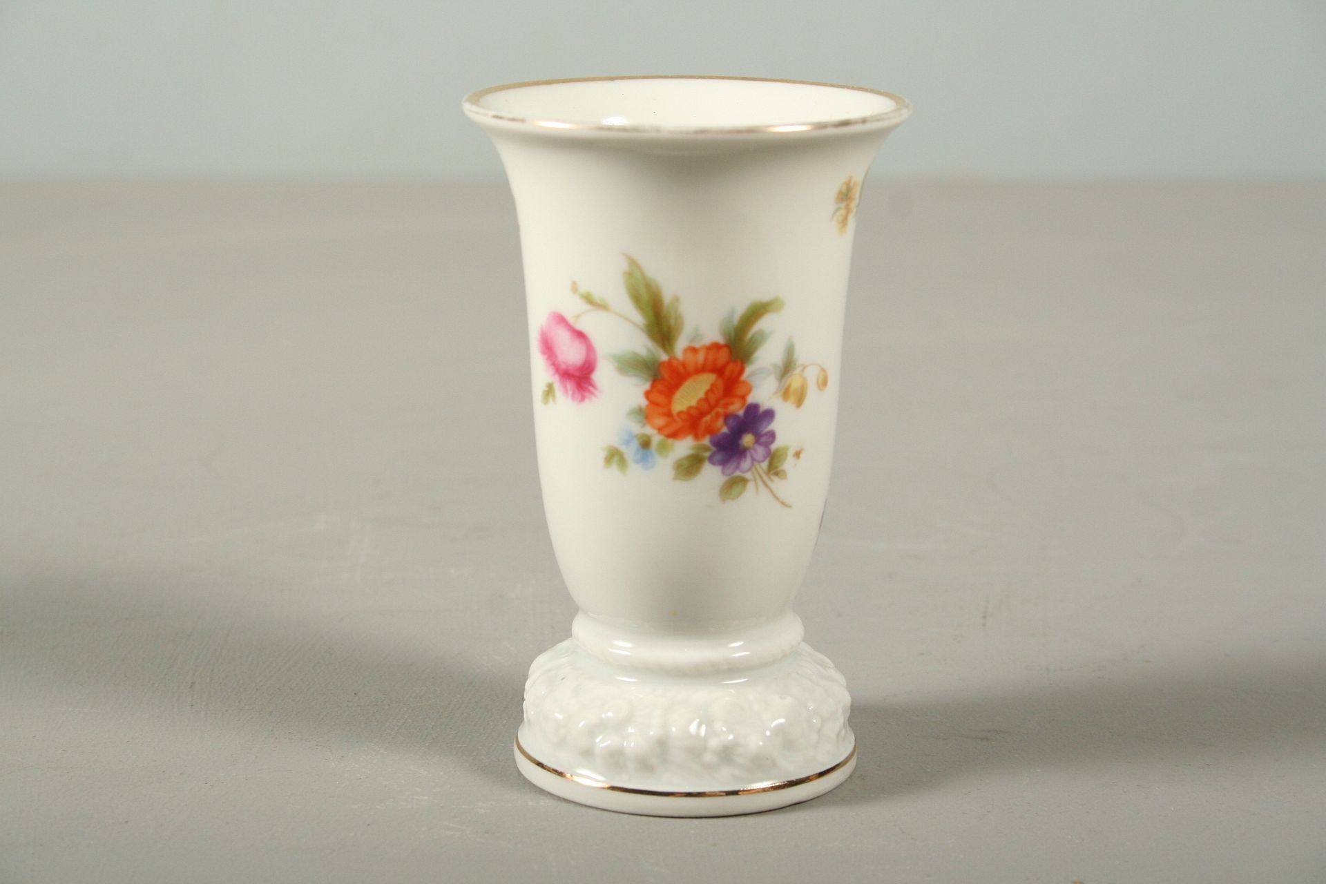 luxusní vázička s květy, bílý glasovaný porcelán, dekorovaný na podstavě plastickým reliéfem se zlacenými linkami, značeno na dně tištěnou značkou Rosenthal, 1. polovina 20. století, 10 cm