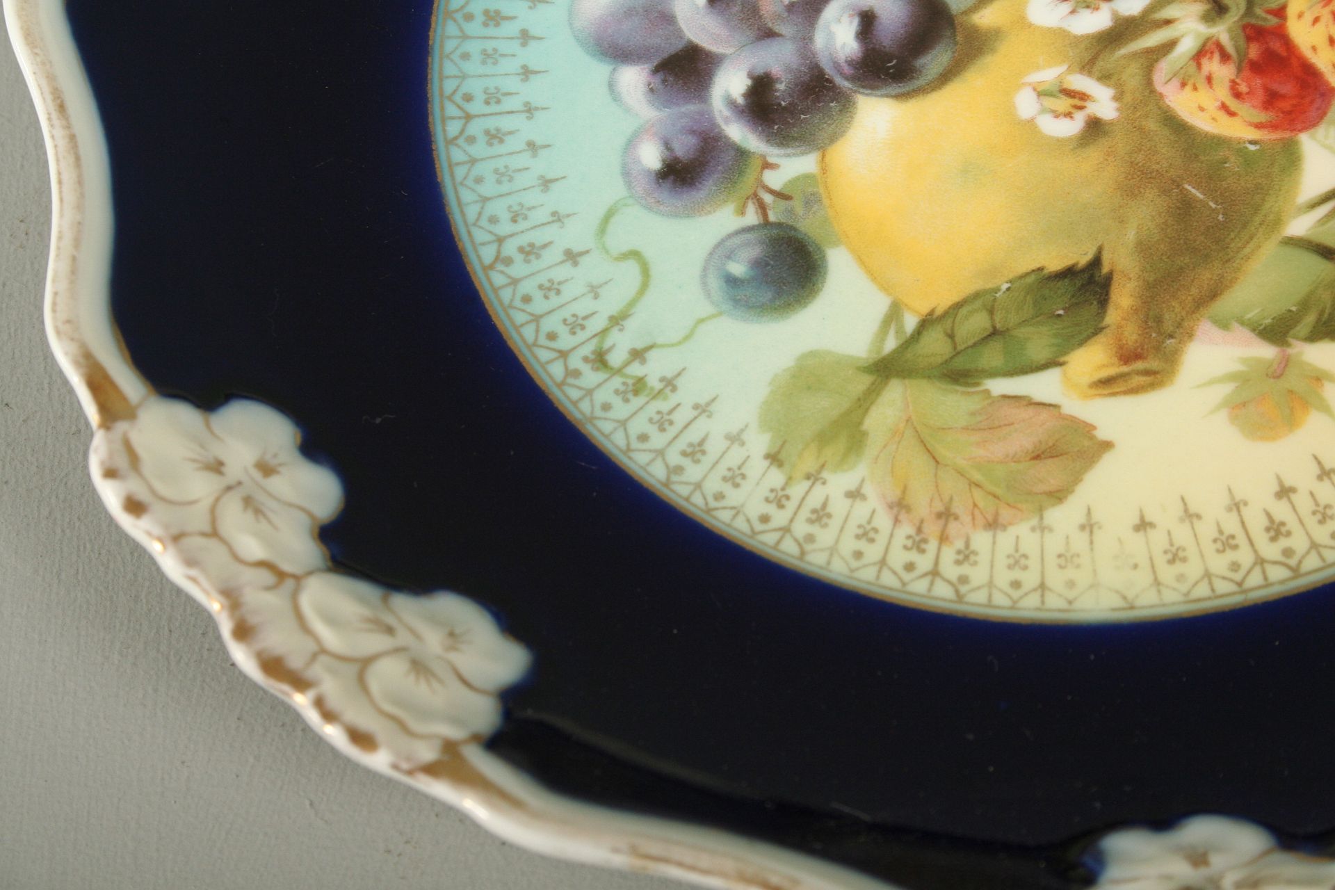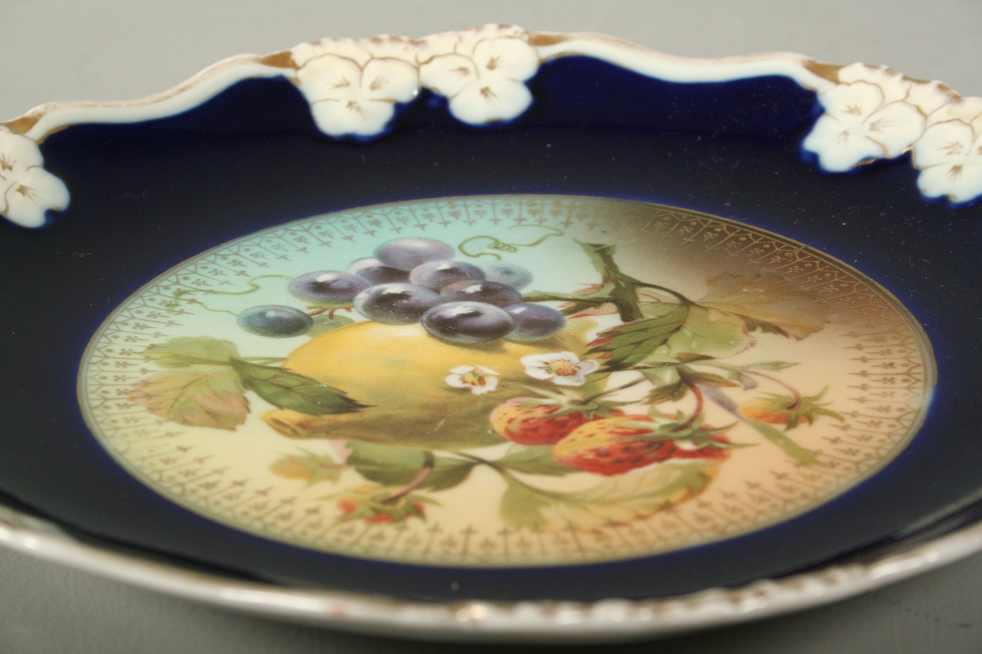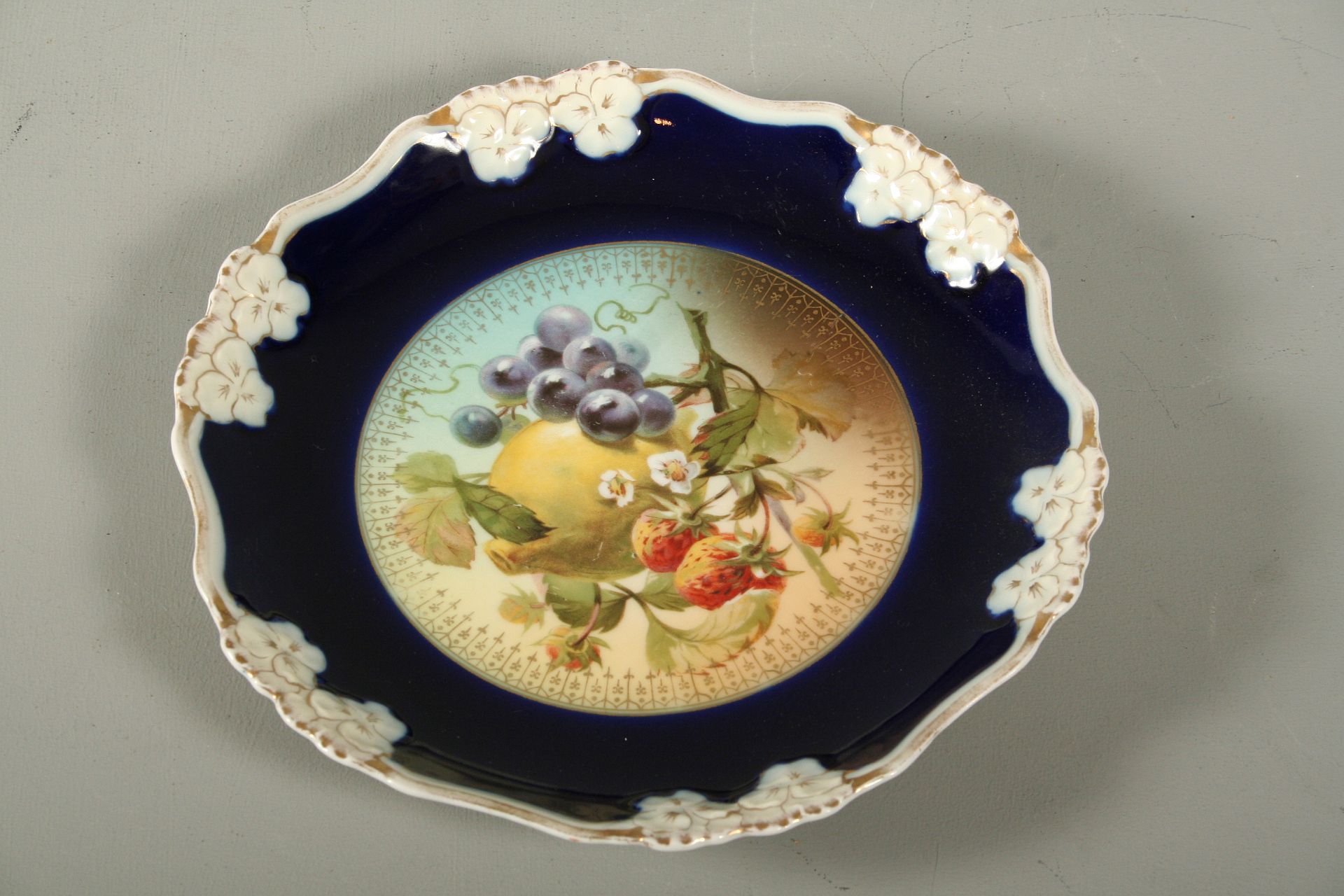 porcelánový dekorativní talíř, malovaný kobaltem, centrální barevný motiv ovocného zátiší, po obvodu reléfní dekor a zlacení, značeno na dně zelenou značkou Rosenthal, průměr 23 cm