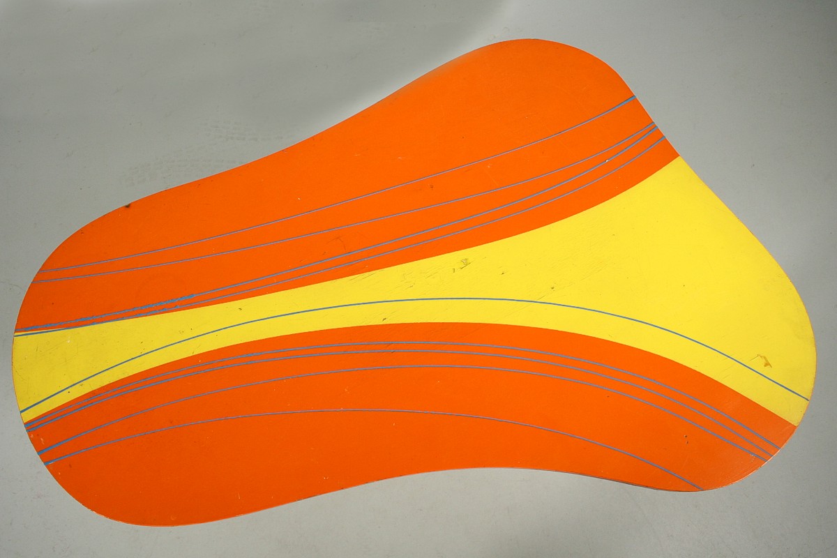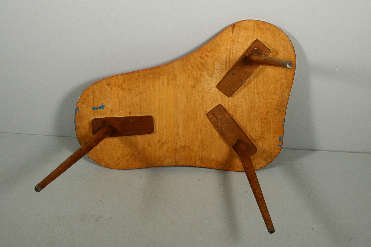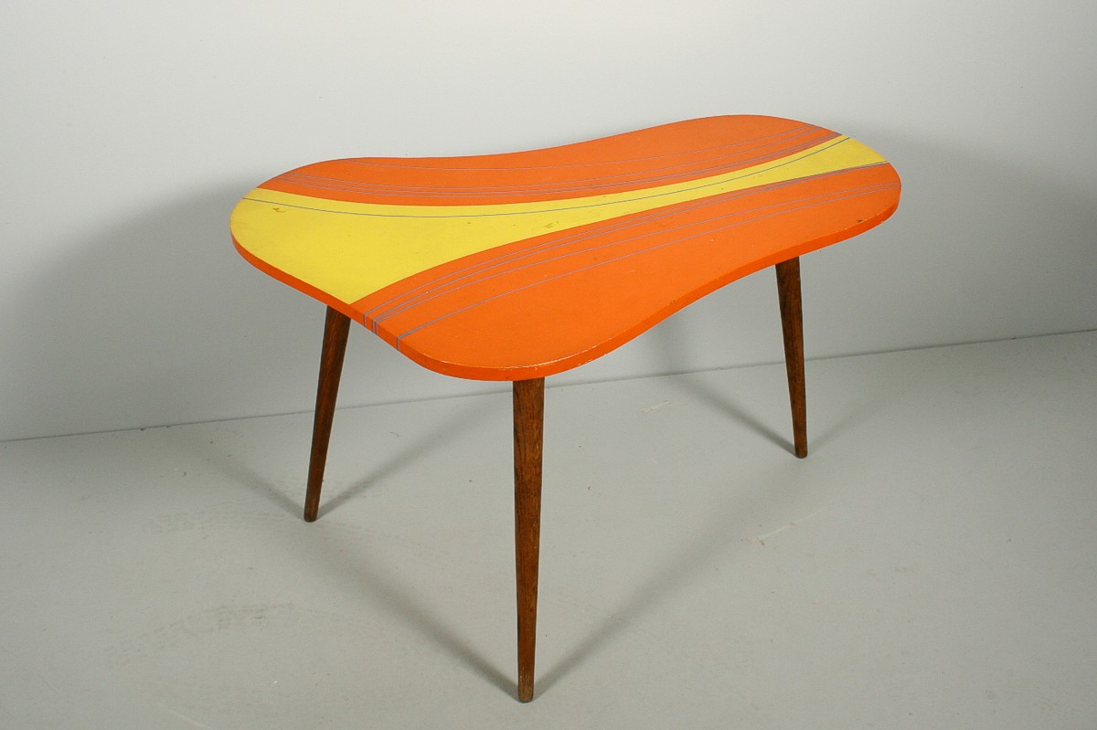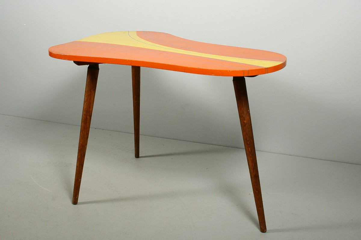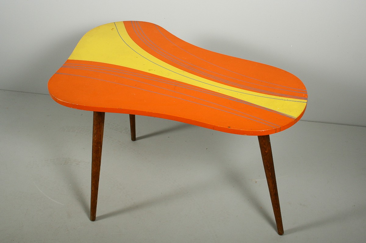 velmi výrazný dřevěný stolek na třech nožkách s deskou nepravidelného organického tvaru v atraktivních původních barvách, 60. léta 20. století, 59 x 94 x 64 cm