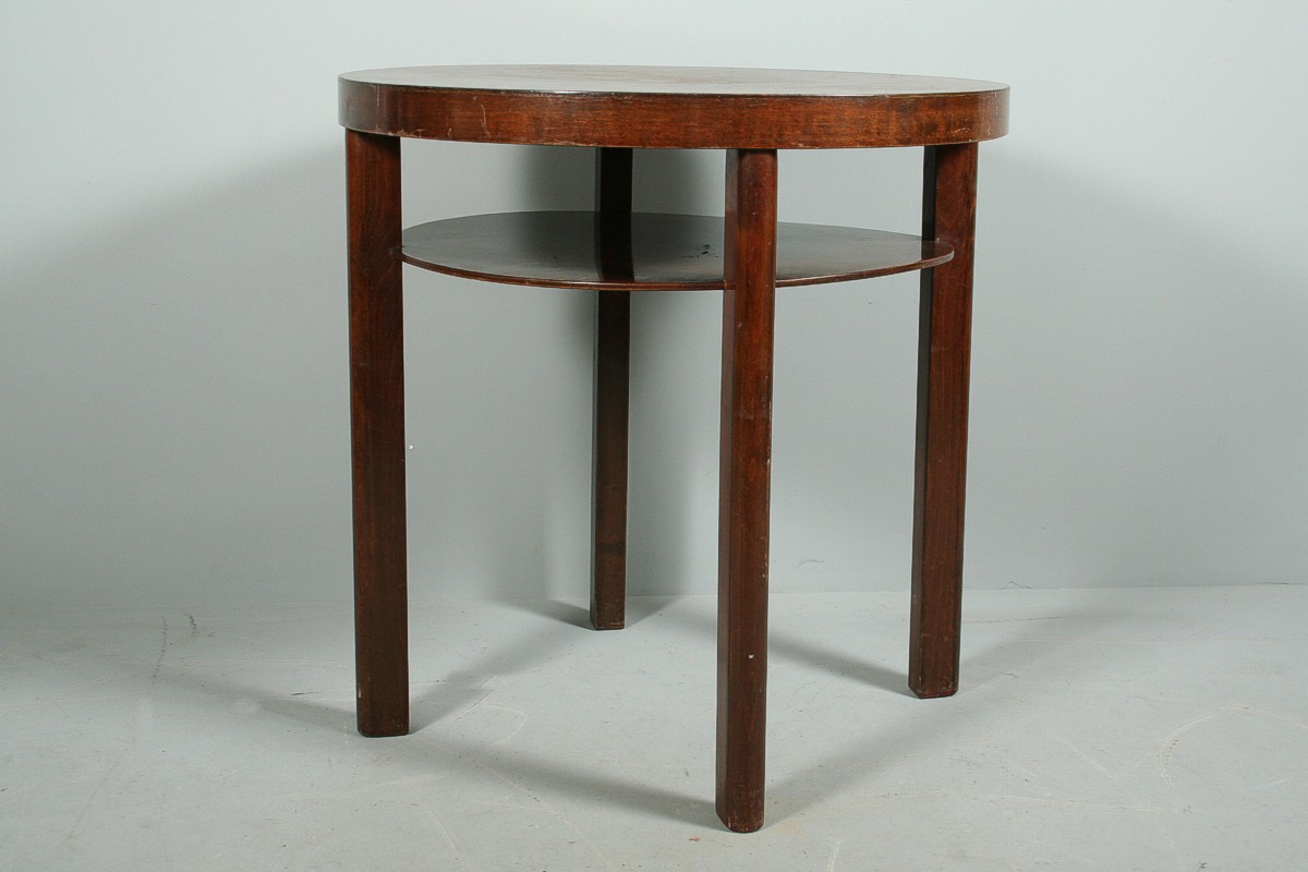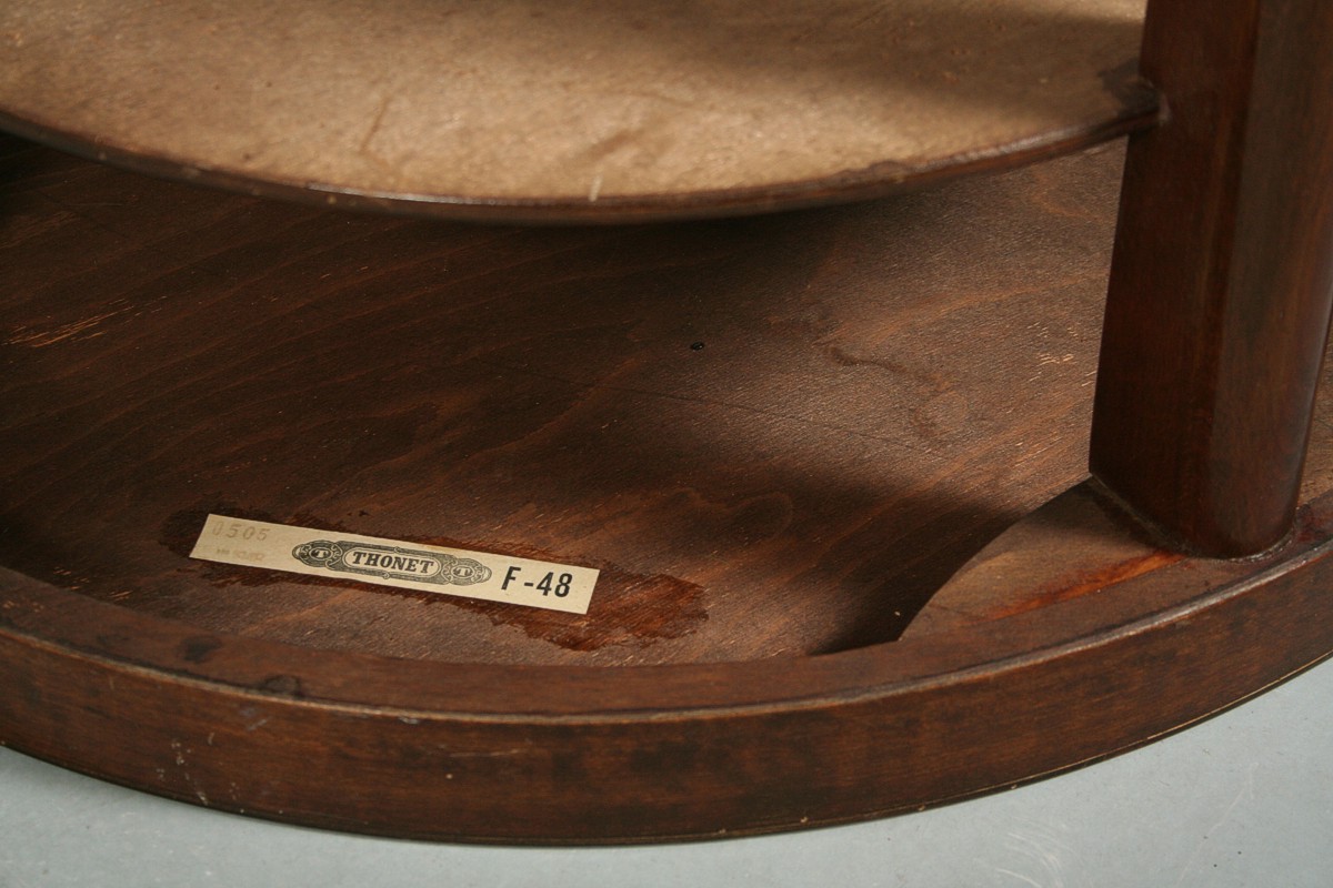 kulatý stolek v moderním vzhledu z 30. let 20. století, mořené a lakované dřevo, značený papírovou známkou Thonet F-48, zcela původní stav sem tam dítky po škůdci, 70 x 69,5 cm