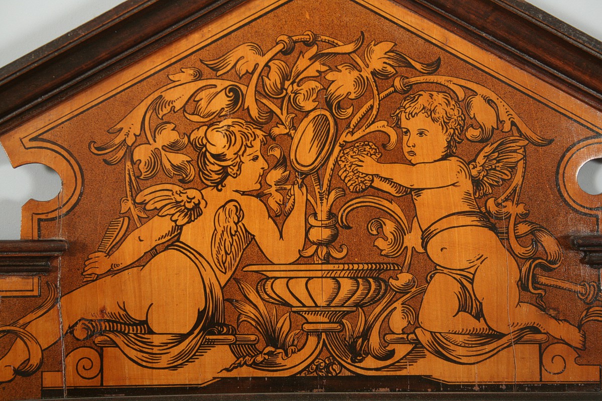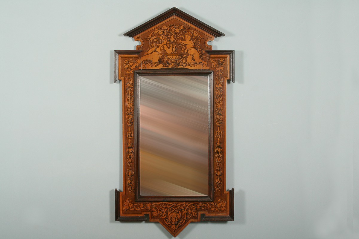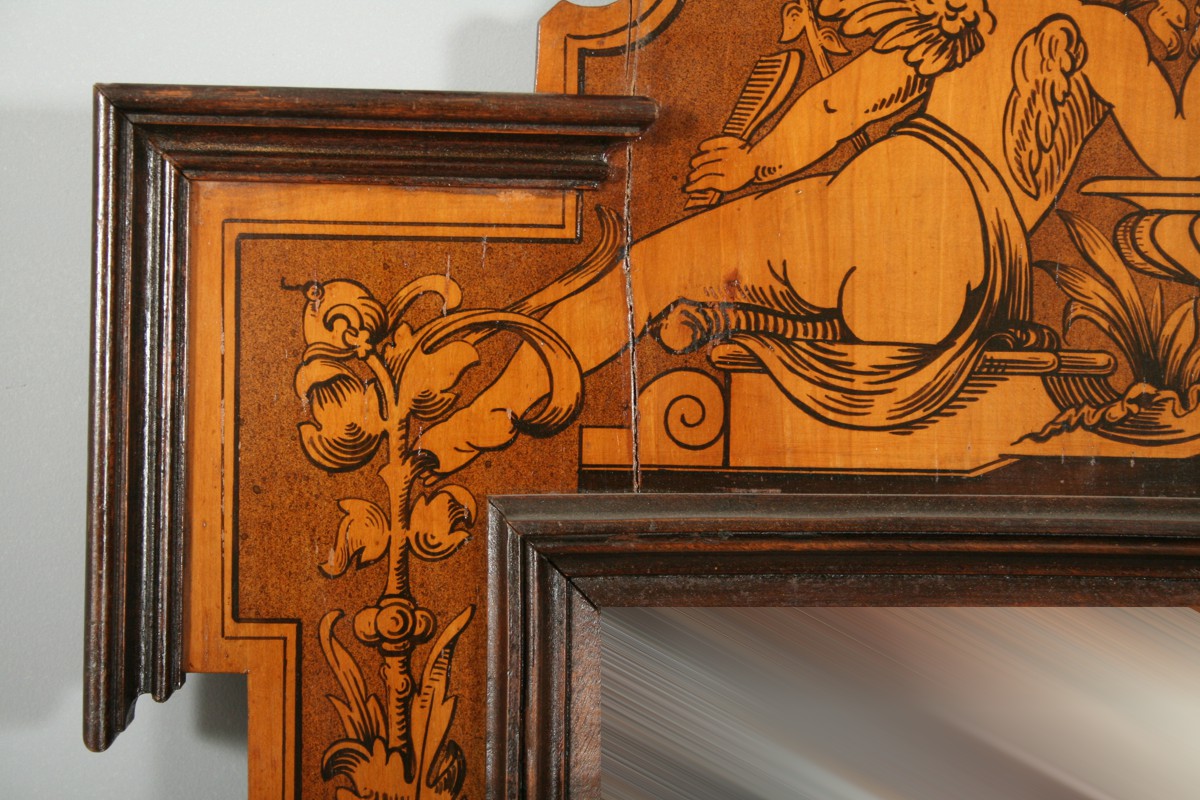 zrcadlo v dřevěném pseudobarokním rámu s figurálním motivem dvou andílků fintících se u kašny, po obvodu malované motivy z přelomu 19. a 20. století, imitující barokní intarsii z 18. století, sklo zrcadla nové, celkem 110 x 60 cm