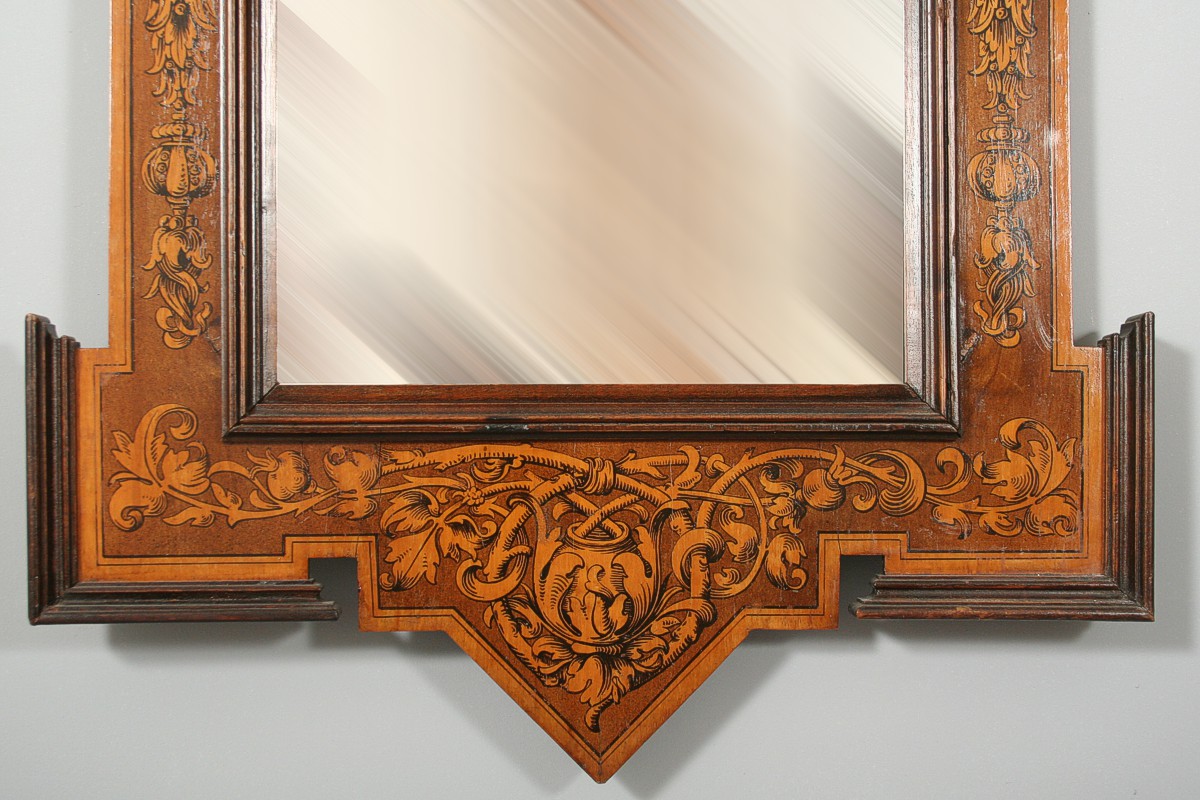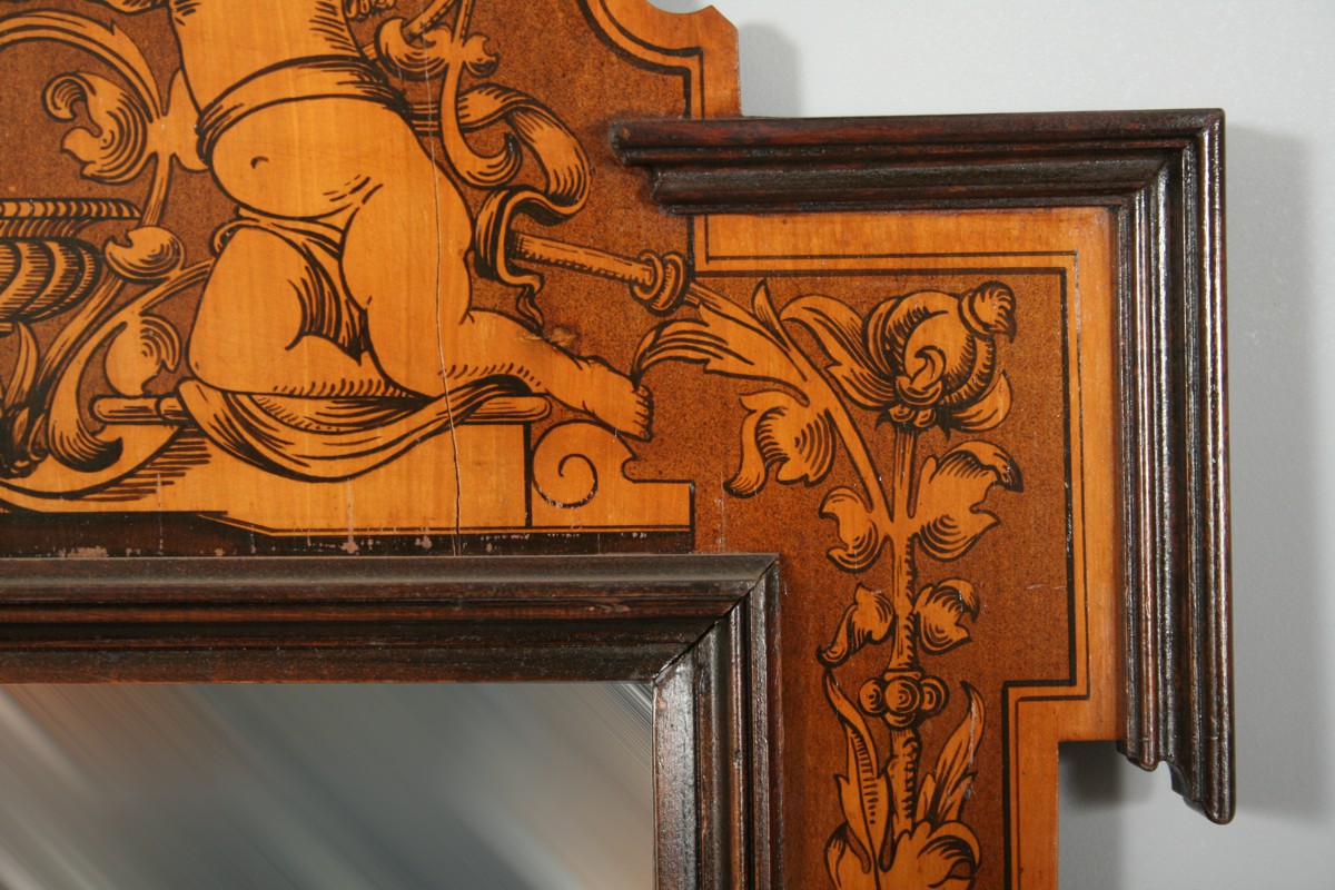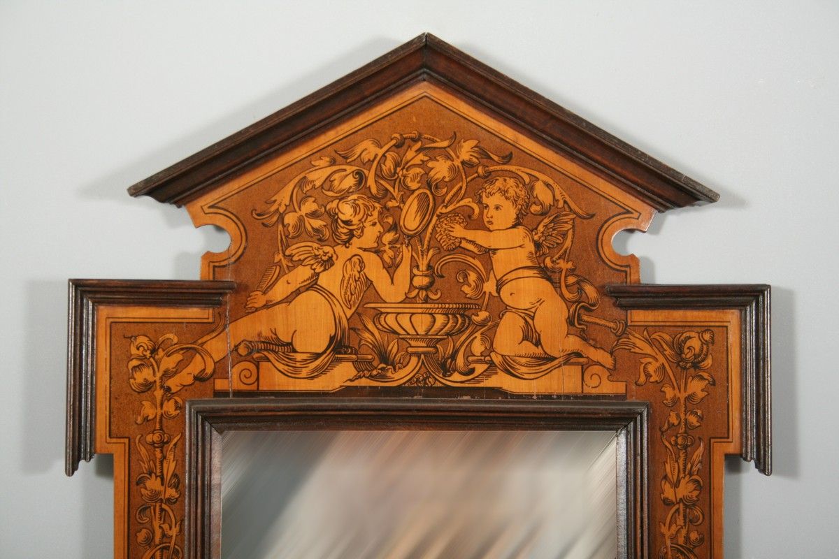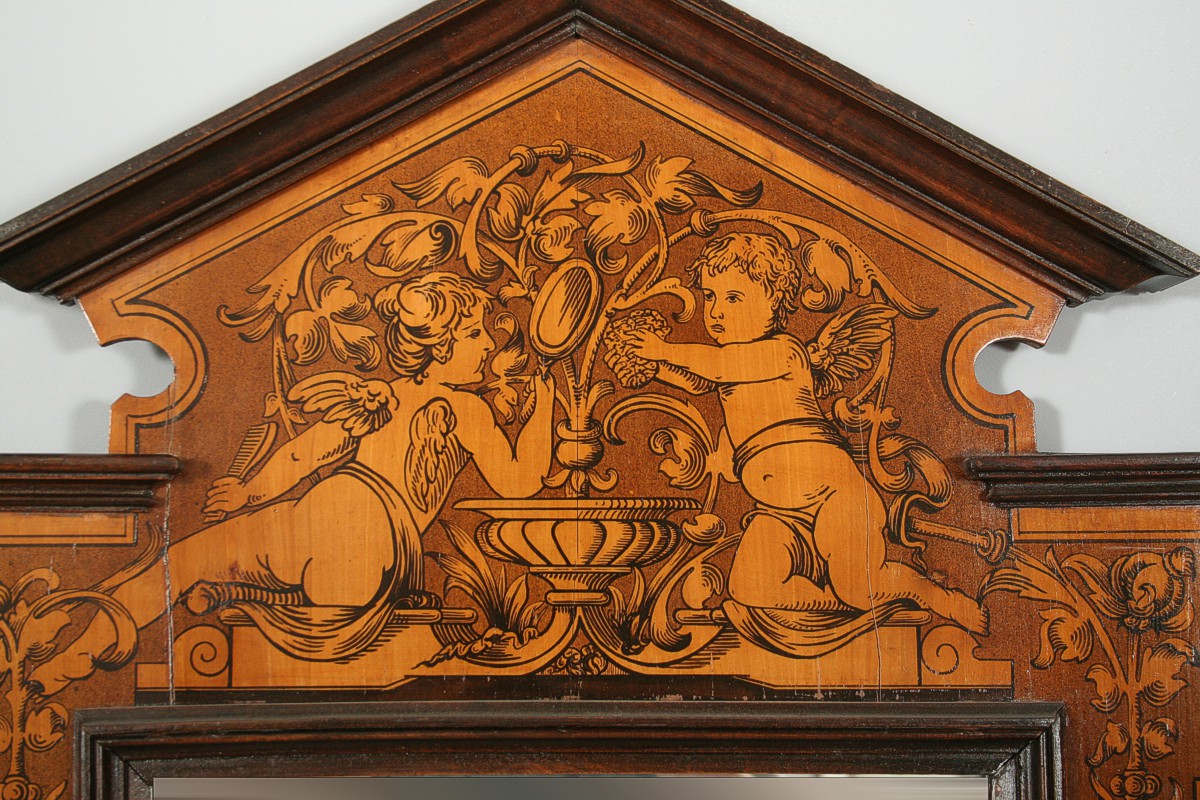zrcadlo v dřevěném pseudobarokním rámu s figurálním motivem dvou andílků fintících se u kašny, po obvodu malované motivy z přelomu 19. a 20. století, imitující barokní intarsii z 18. století, sklo zrcadla nové, celkem 110 x 60 cm