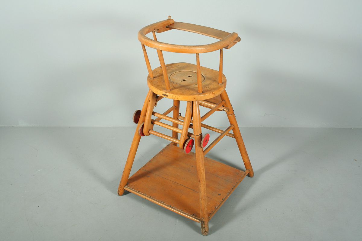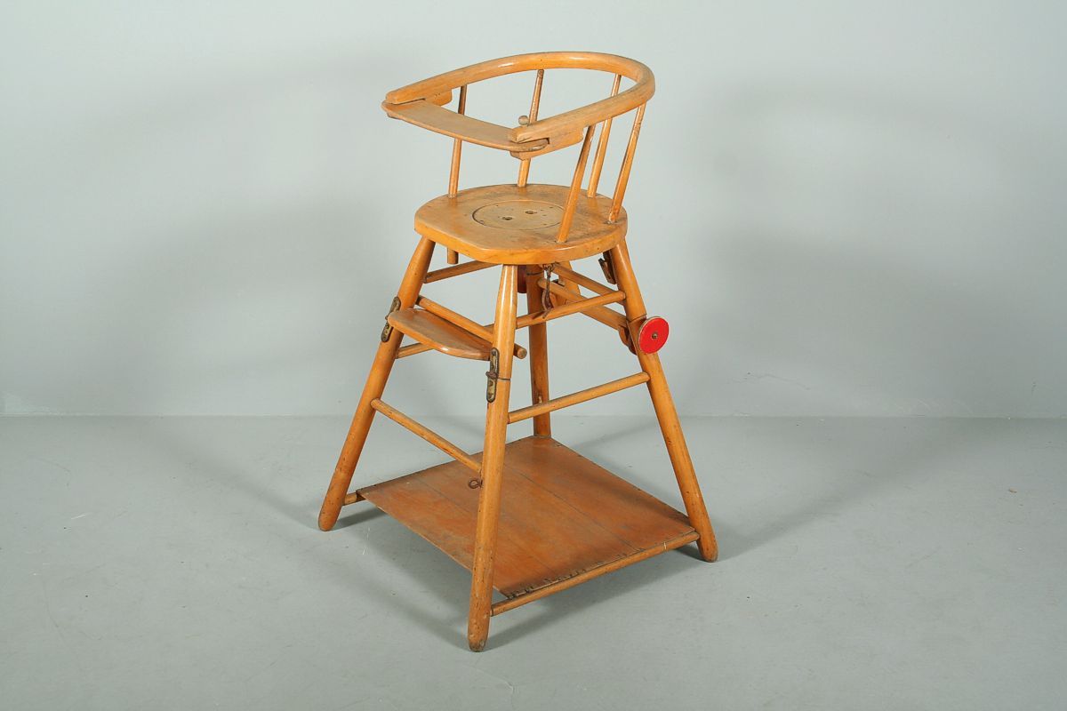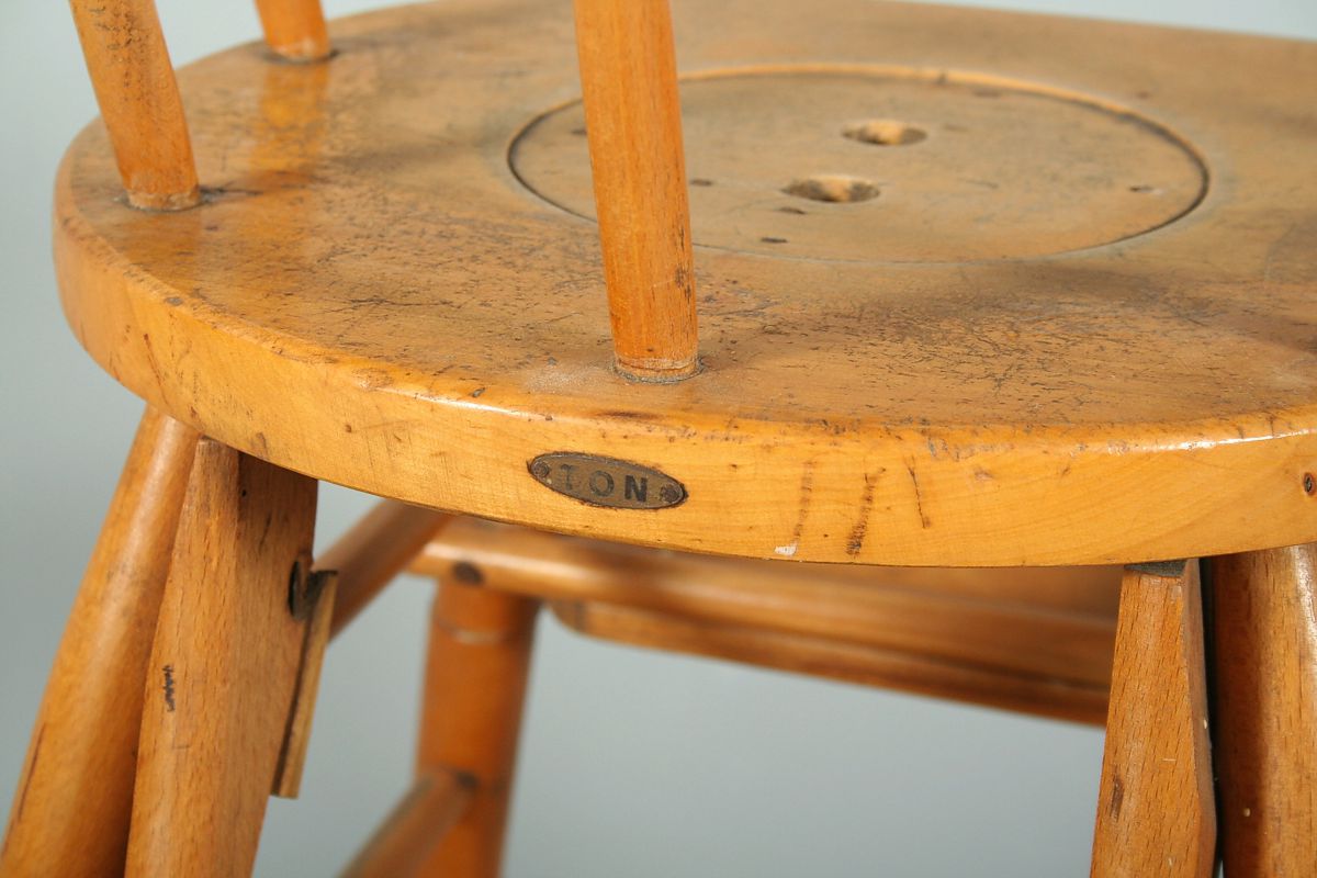 dětská dřevěná židlička ze světlého bukového dřeva s možností rozložení, na zadní straně značeno plechovou cedulkou TON