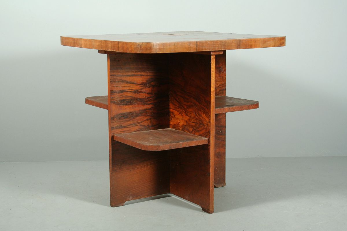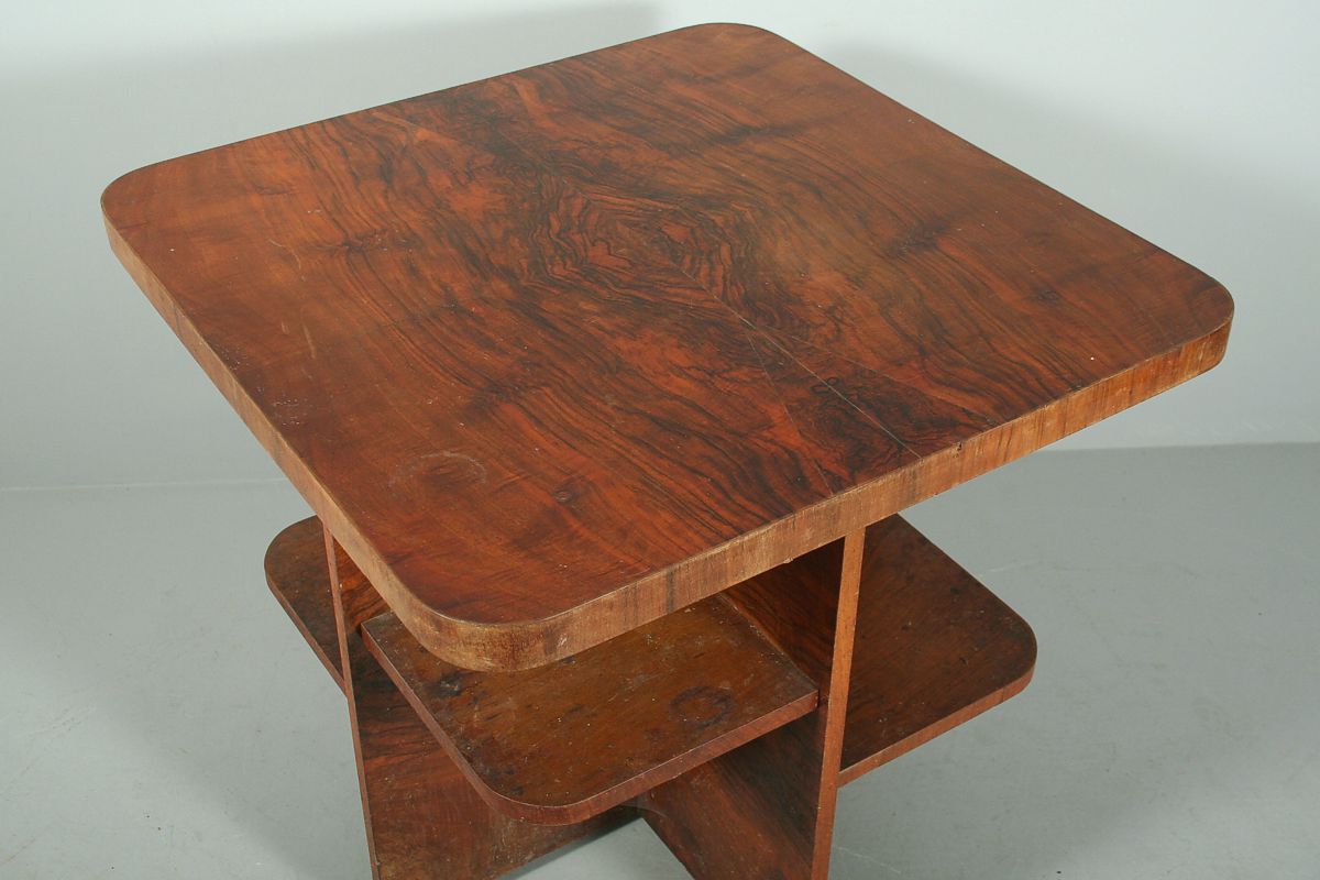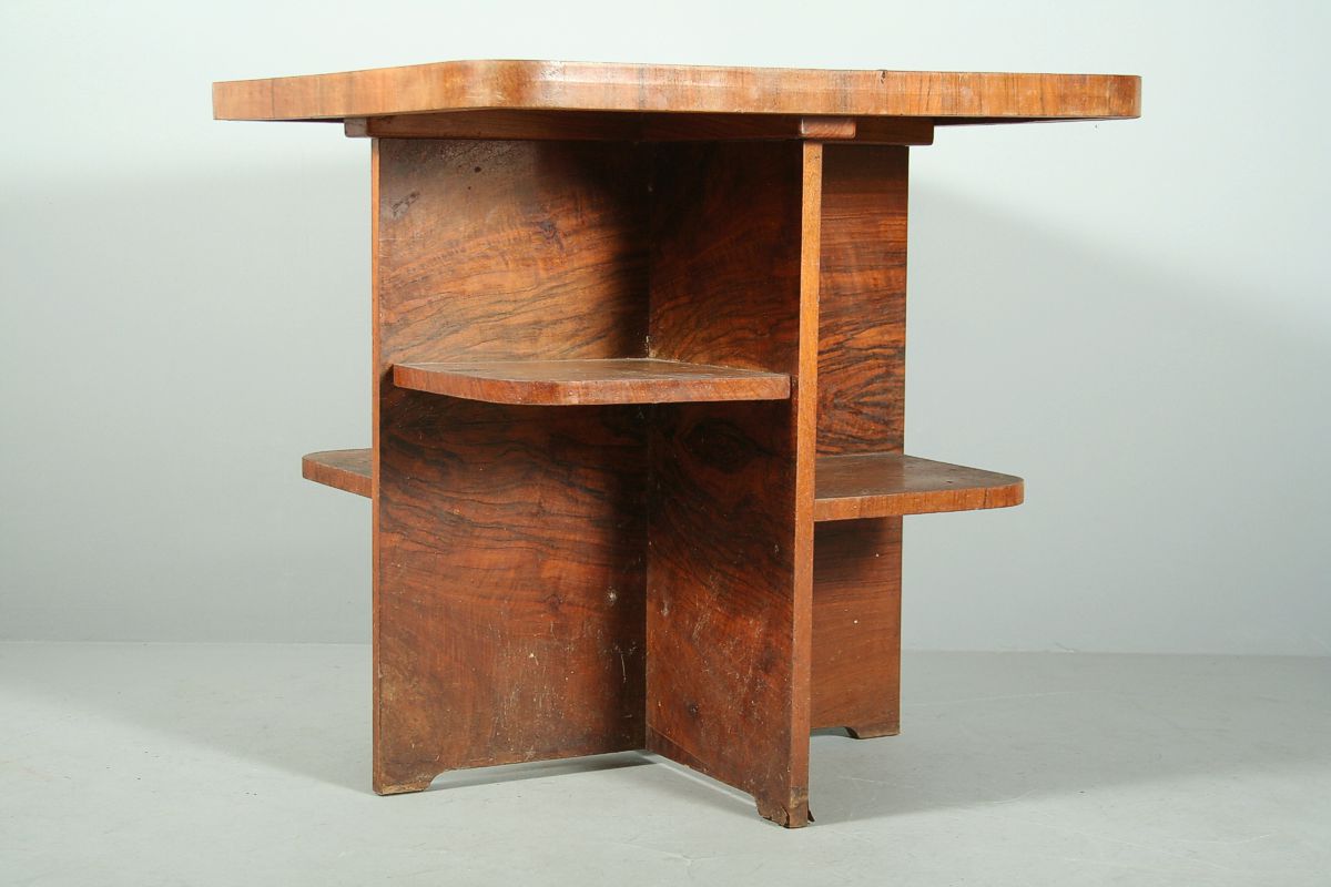 hraněný stůl s poličkami, skládaná ořechová dýha, funkcionalismus, 20 - 30. léta 20. století, původní stav, v dolní části lehce odfouklá dýha, 72 x 75 x 75 cm