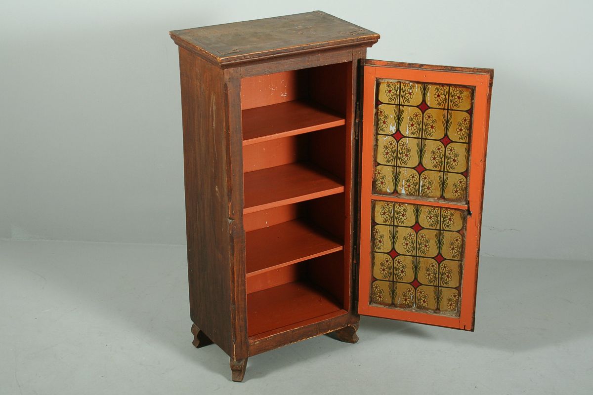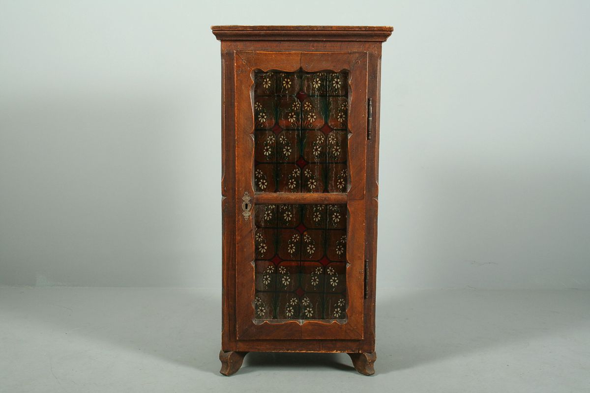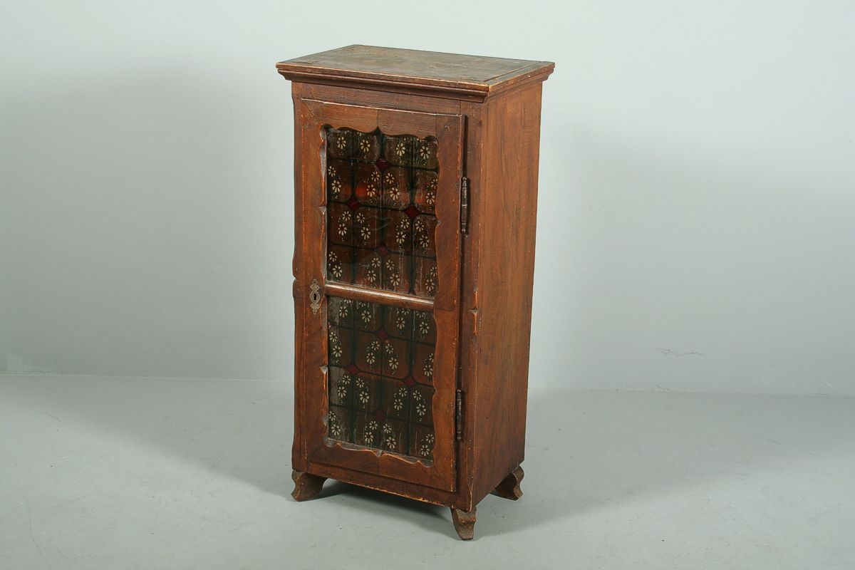 selská dřevěná vitrínka ze smrkového dřeva, fládrovaná, staré vnější jehlové panty, zdobená prořezávanými okny a tvary v hranách, konec 19. století, původní stav, 85 x 42 x 28 cm
