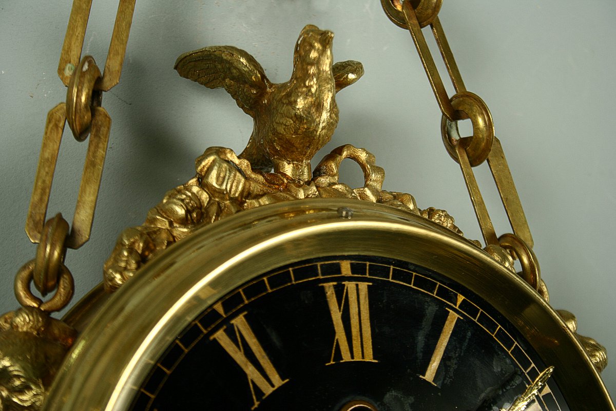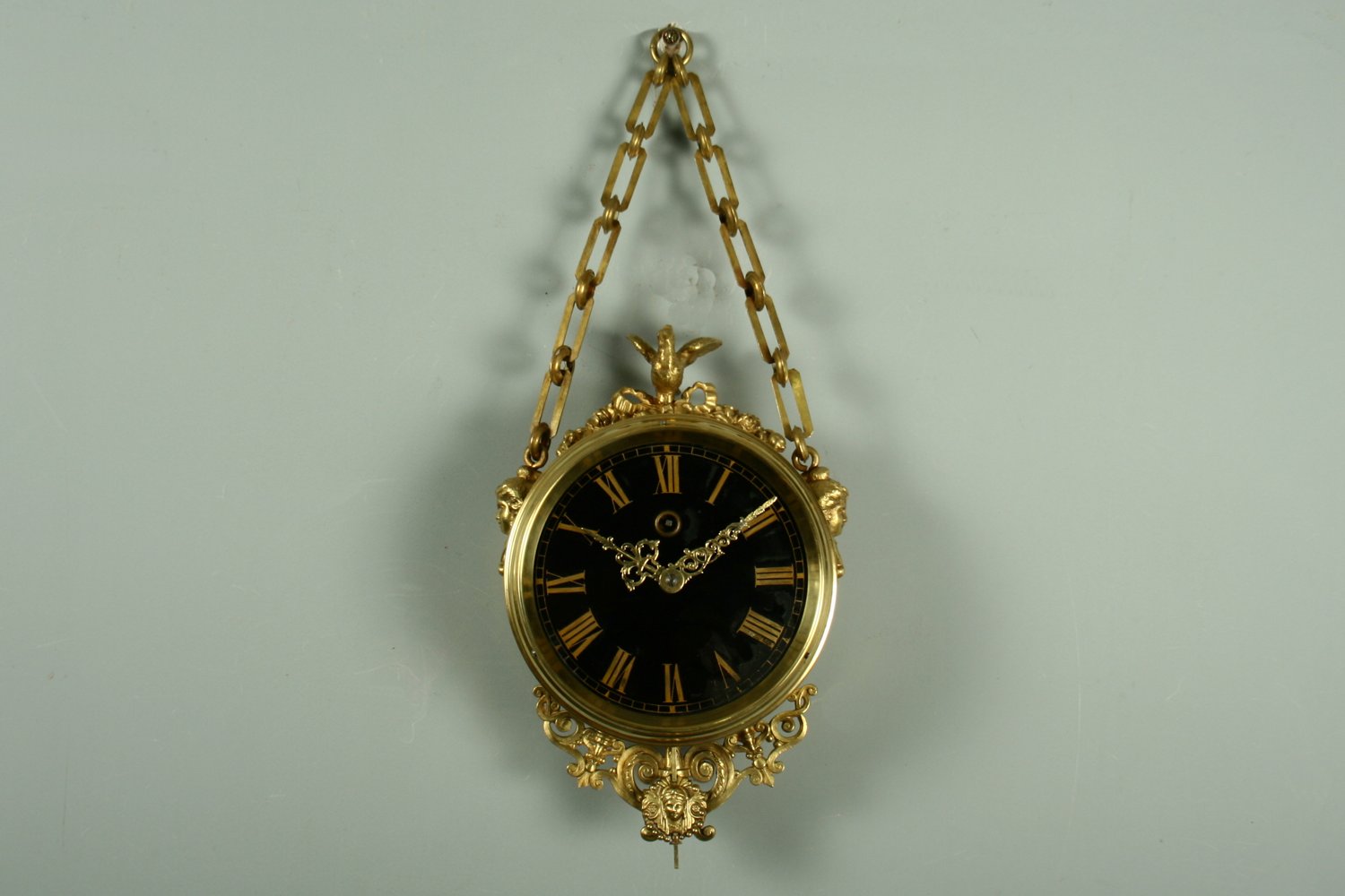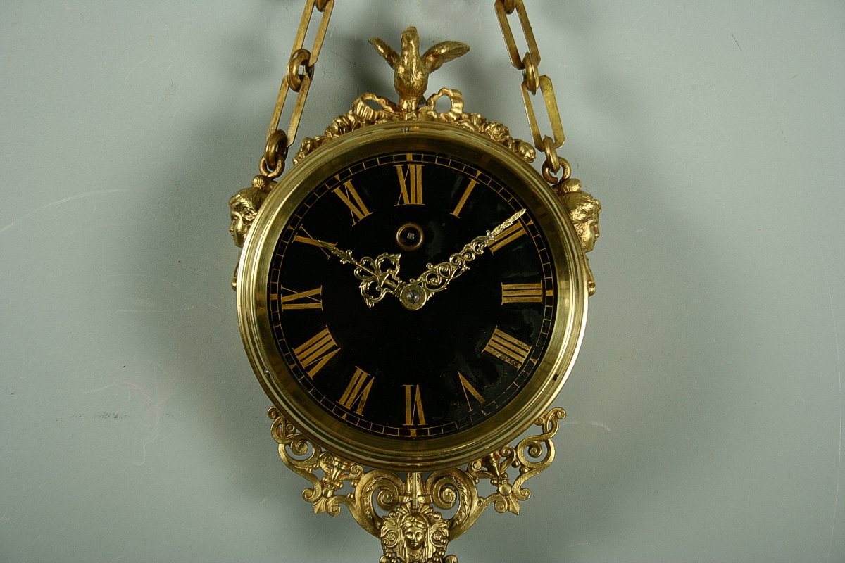 závěsné kartušové hodiny, černý skleněný ciferník se zlacenými římskými číslicemi, bohatě tvarované zlacené ručičky, bronzové plastické ozdoby po obvudu, funkční s klíčem, 44 x 19 cm