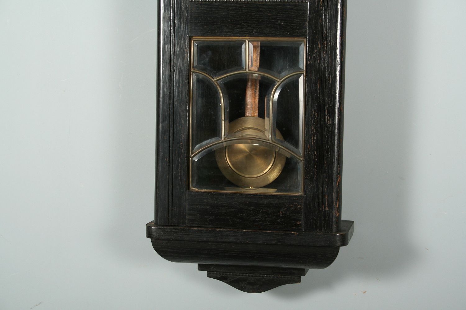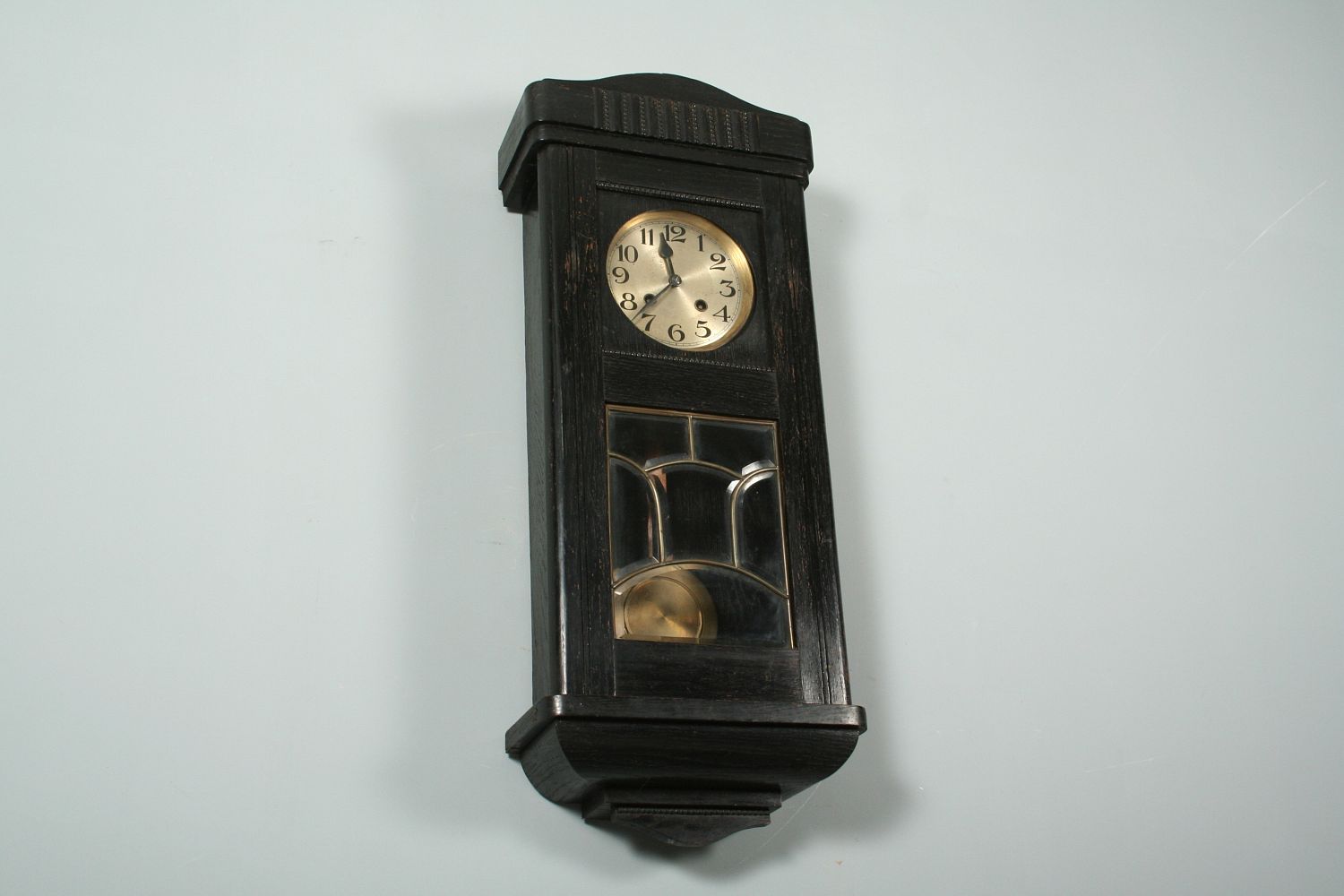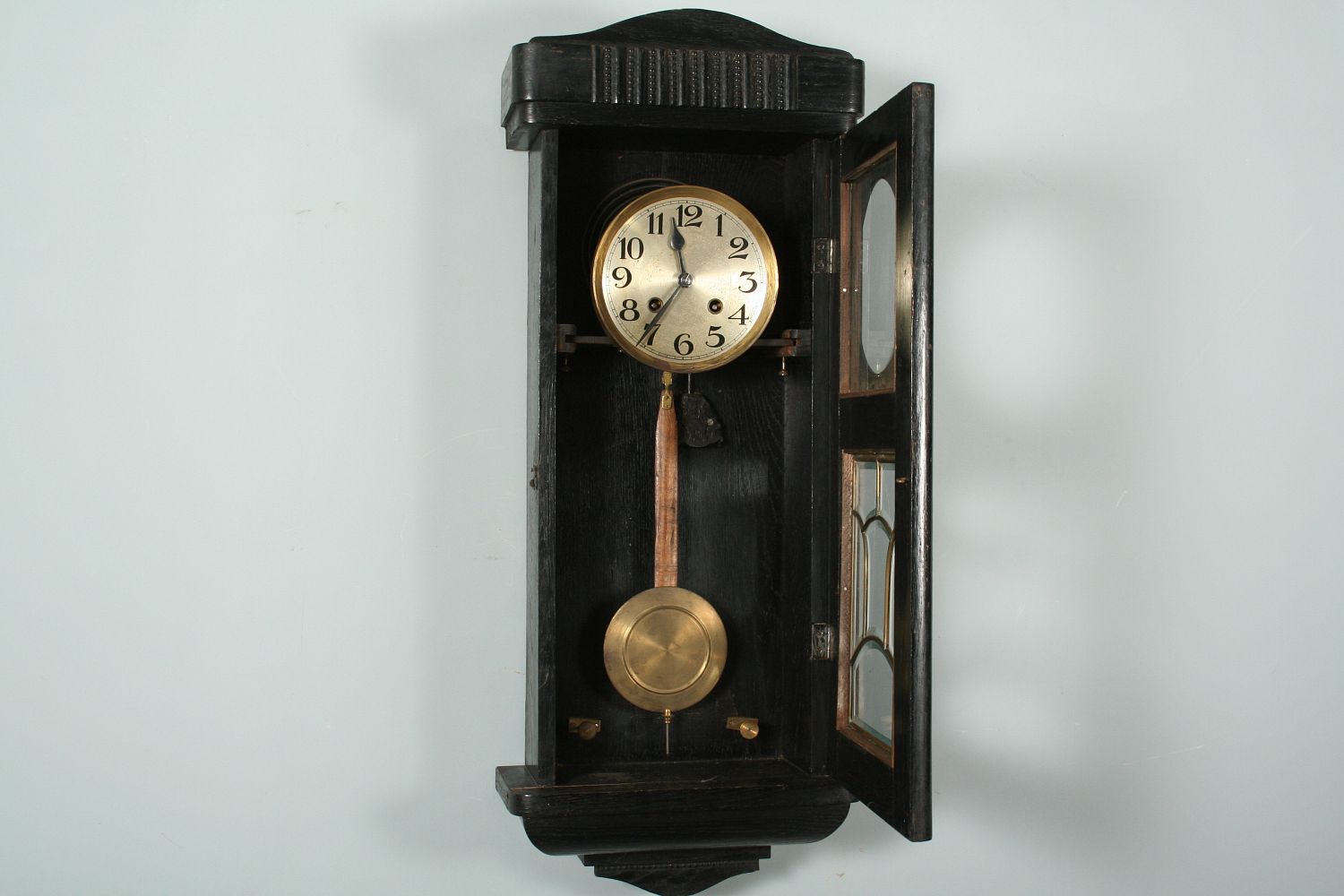 závěsné bicí hodiny v secesní dřevěné skříňce s fazetovanými skly a mosaznou vitráží, černě mořený dubový masiv a dýha, 78 x 31 cm, stroj na pérový chod s plechovým ciferníkem, značený lvíčkem a výrobním číslem 3835, stroj funkční s klíčem, bití do spirály