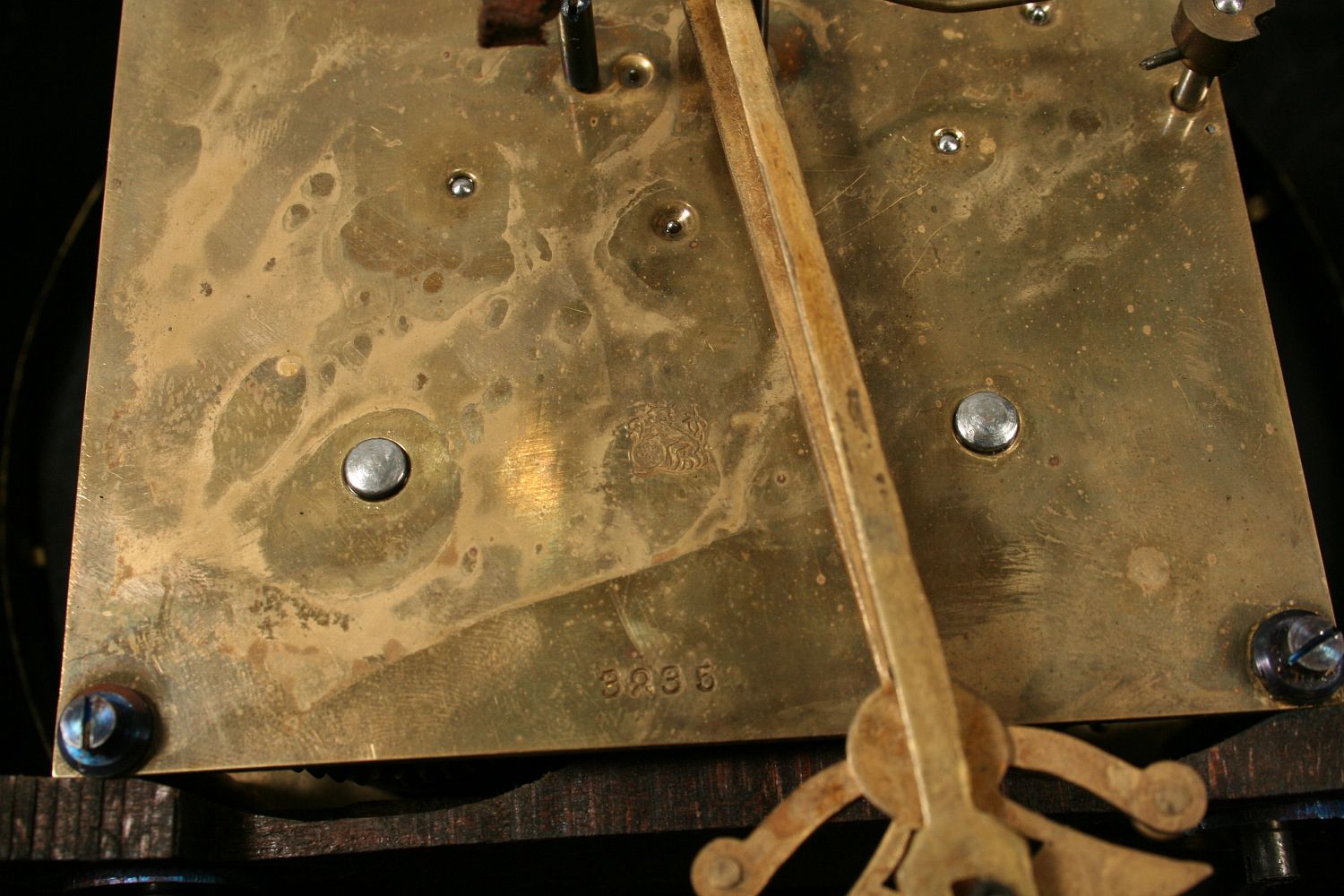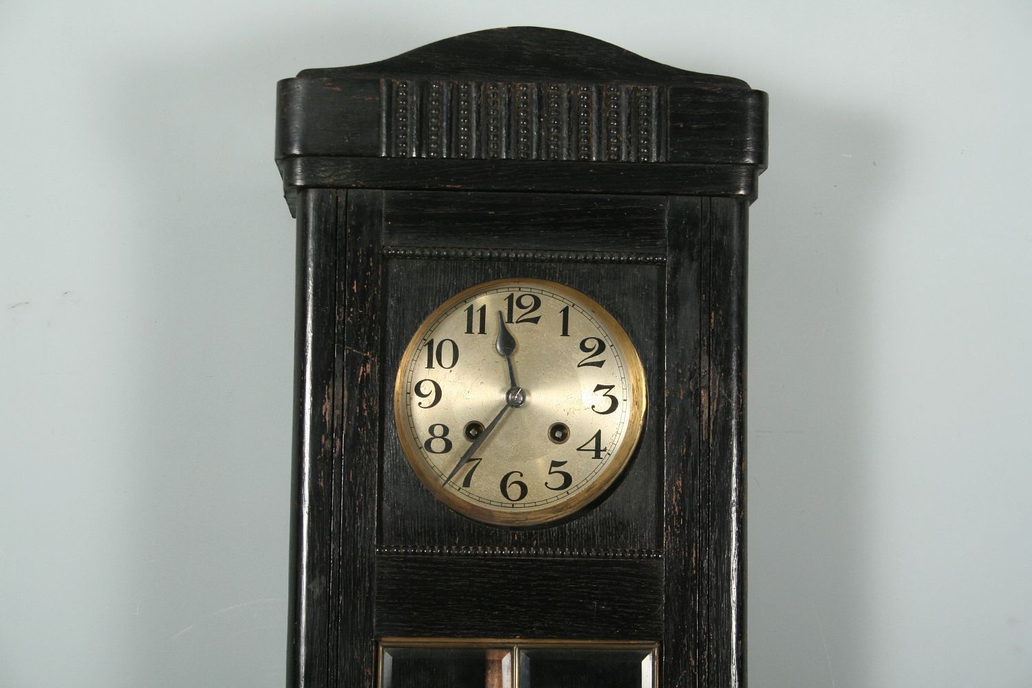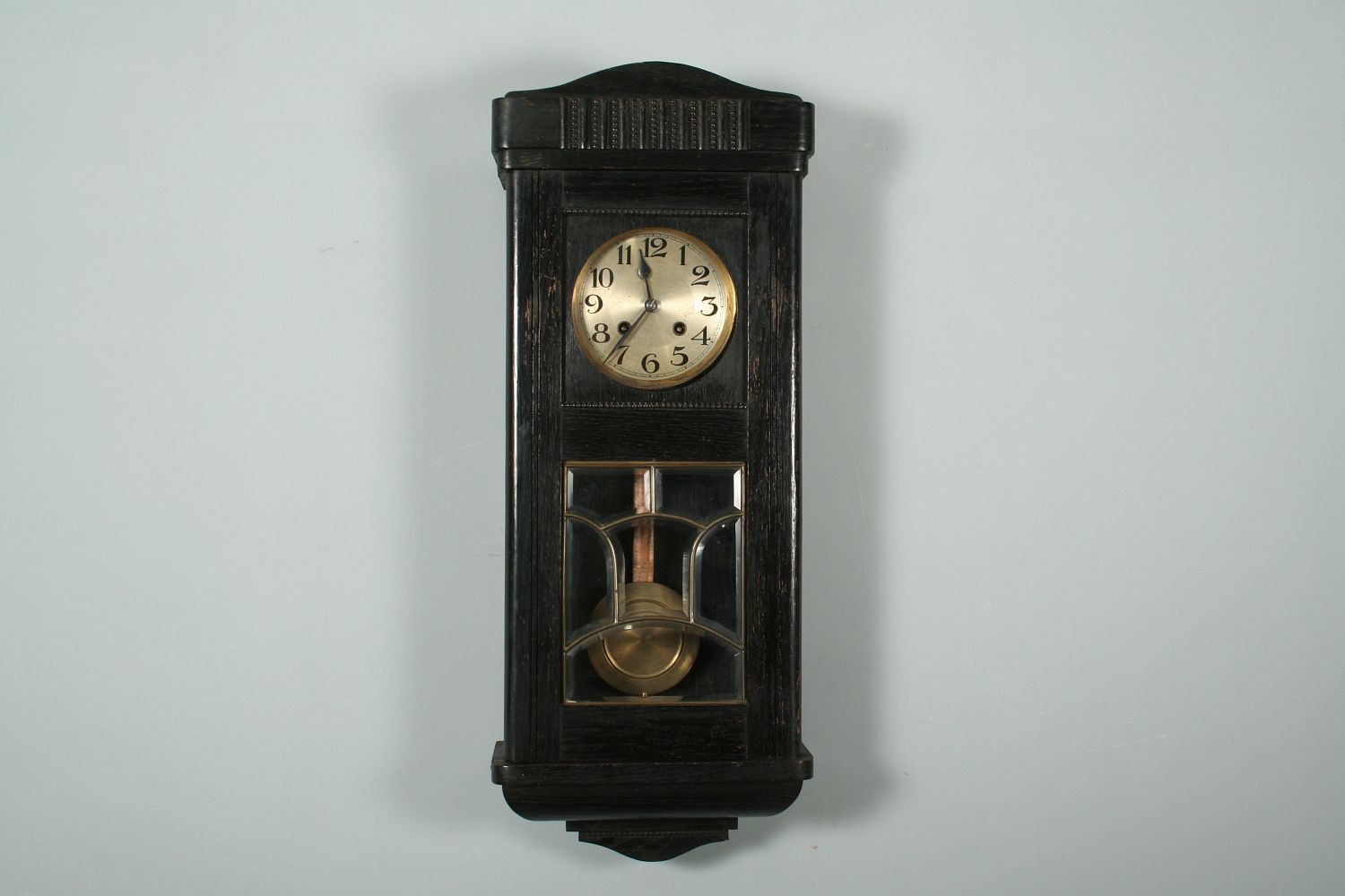 závěsné bicí hodiny v secesní dřevěné skříňce s fazetovanými skly a mosaznou vitráží, černě mořený dubový masiv a dýha, 78 x 31 cm, stroj na pérový chod s plechovým ciferníkem, značený lvíčkem a výrobním číslem 3835, stroj funkční s klíčem, bití do spirály