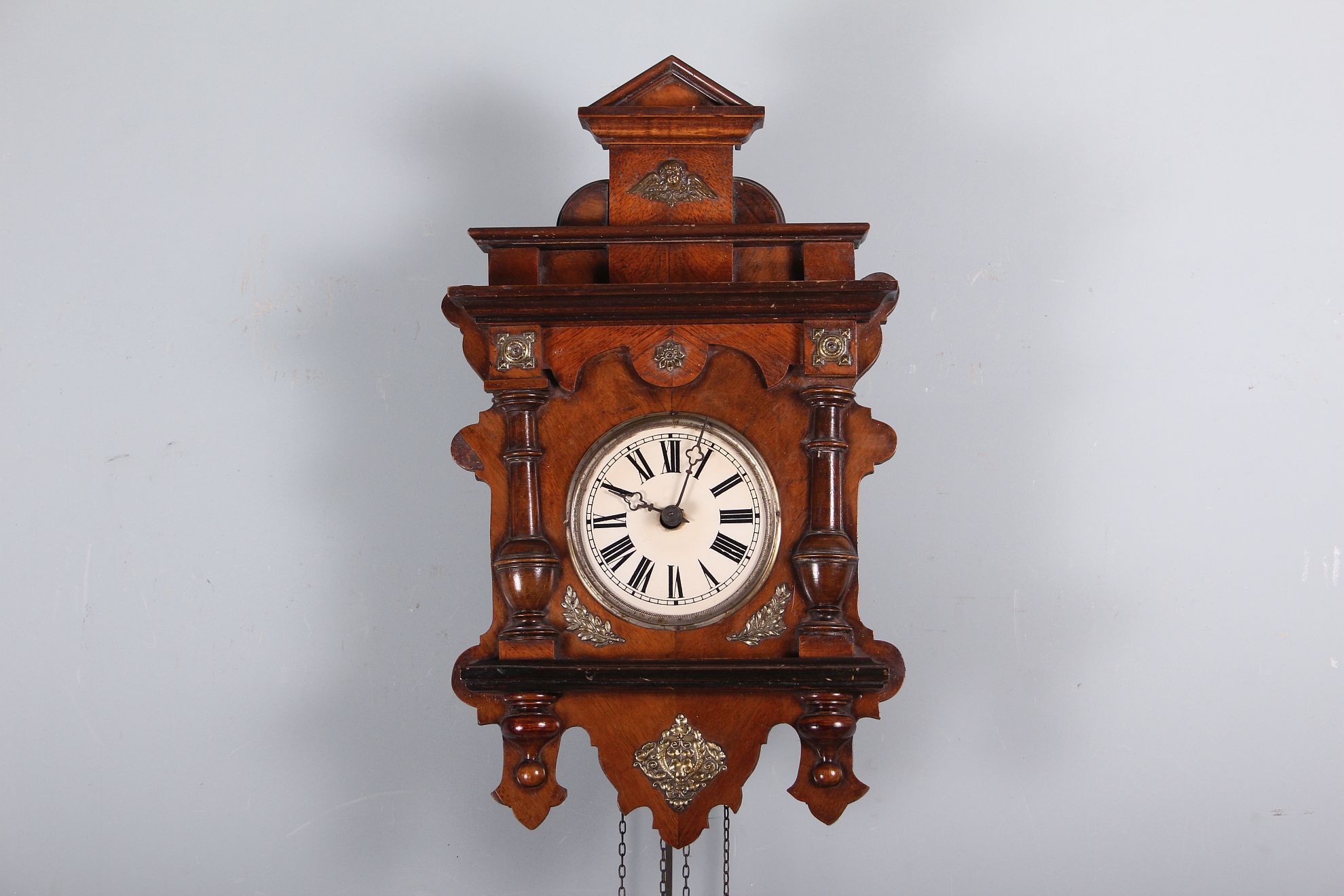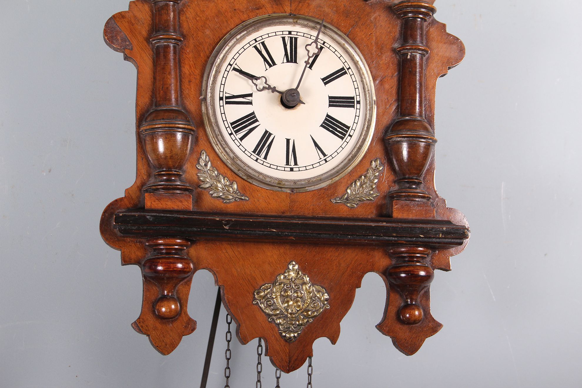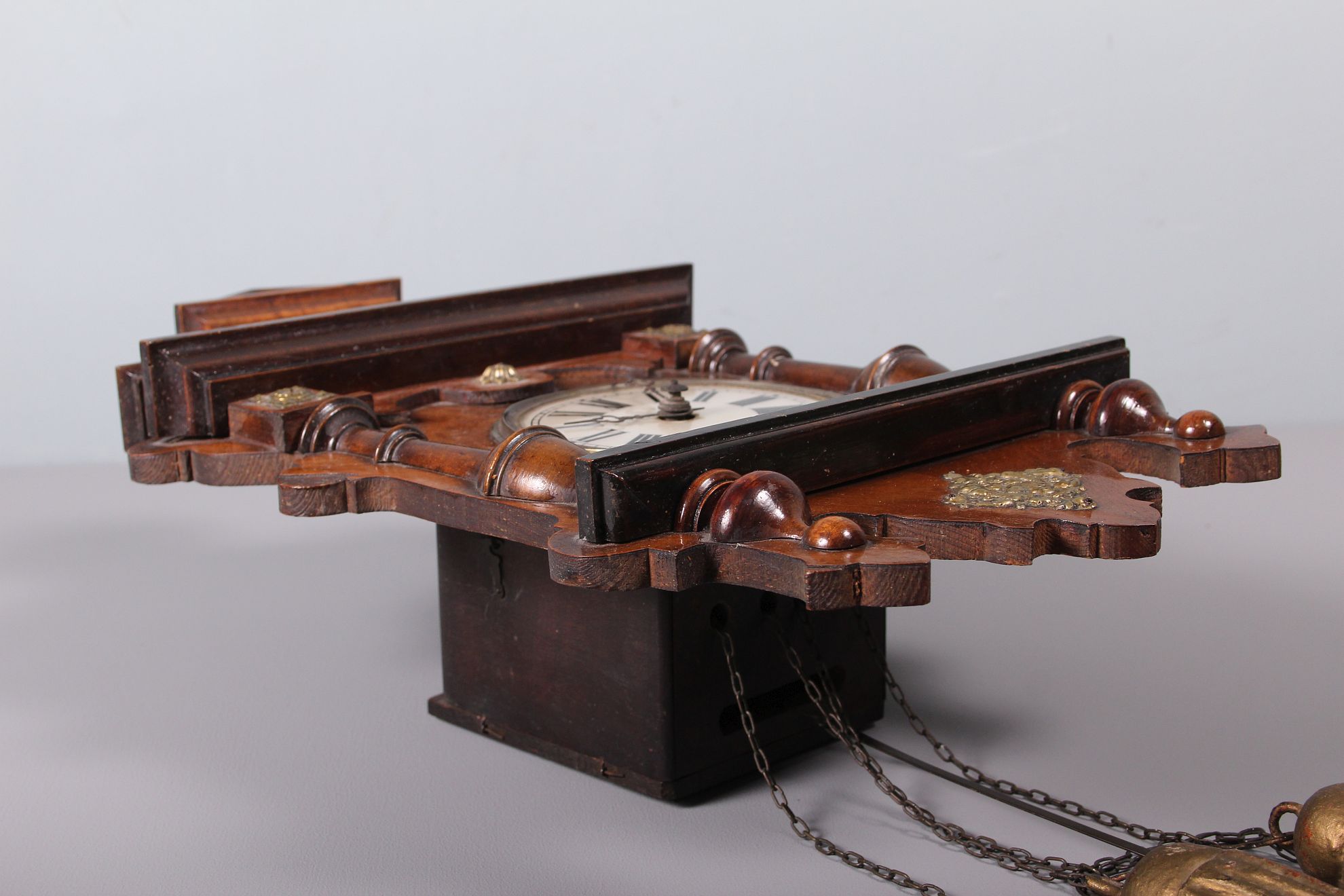 závěsné dvouzávažové hodiny, skleněný kulatý ciferník na zdobené dřevěné podložce dekorativních tvarů s mosaznými aplikami, půlové bití, závaží na řetízkách, funkční stav, rozměr ciferníku 44 x 26 cm